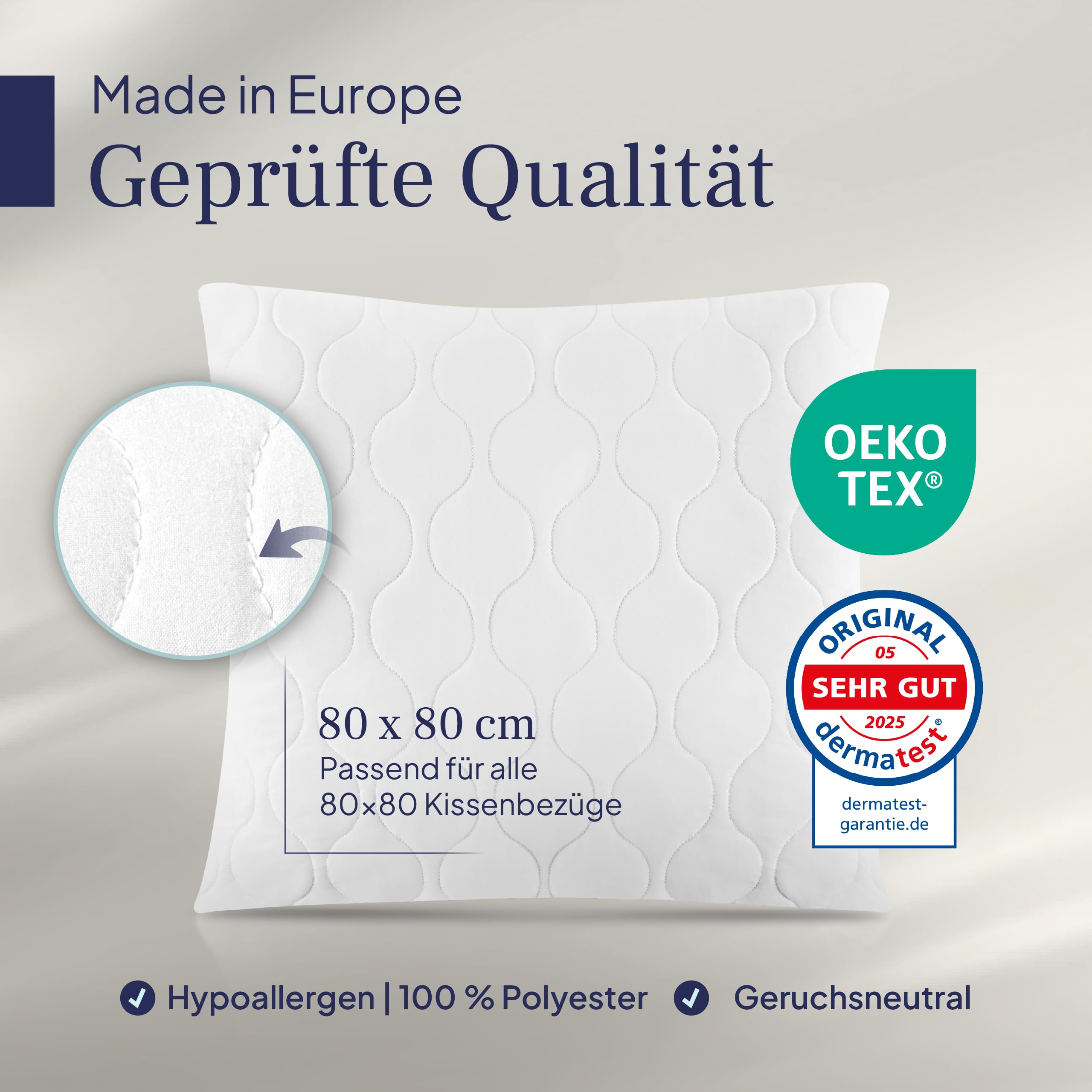 Deutscher Händler: Wir achten auf die Qualität unserer Produkte und nehmen Ihr Feedback ernst! ✔️ KUSCHELIG FLAUSCHIG - Für ein ultrasoftes und allergikerfreundliches Kuschelerlebnis besteht der Bezug vom Kissen und das Füllmaterial aus weichen 100% Polyester Fasern ✔️ HART UND WEICH - Die Menge der Kissenfüllung lässt sich bei diesem hochwertigen Kopfkissen ganz einfach durch den Reissverschluss anpassen✔️ VIELSEITIG EINSETZBAR - Als Bettkissen und Kuschelkissen genau so gut geeignet wie als Sofakissen, Deko Kissen oder Couchkissen fürs Wohnzimmer✔️ DAS IST DRIN - Kissen in der Grösse 80x80 cm (perfektes Innenkissen für einen Kissenbezug in der Grösse 80 x 80 cm)✔️ ÖKOTEX MADE IN EU - Unsere Ökotex-Zertifizierten Kissen werden in Europa unter Einhaltung höchster Hygiene- und Produktionsstandards produziertLieferumfang: Kopfkissen 80x80 cmAllgemeine Hinweise: Aufgrund unterschiedlicher Bildschirmeinstellungen und Auflösungen sind leichte Farbabweichungen möglich.Pflege-Hinweise: Waschbar bis 60 GradTrocknergeeignet (nur normal trocknen)Nach dem Waschen immer gut durchtrocknen, dann einmal kurz und kräftig aufschlagenJetzt ganz nach oben scrollen und das Kopfkissen 80x80 direkt ☝ IN DEN EINKAUFSWAGEN LEGEN ☝