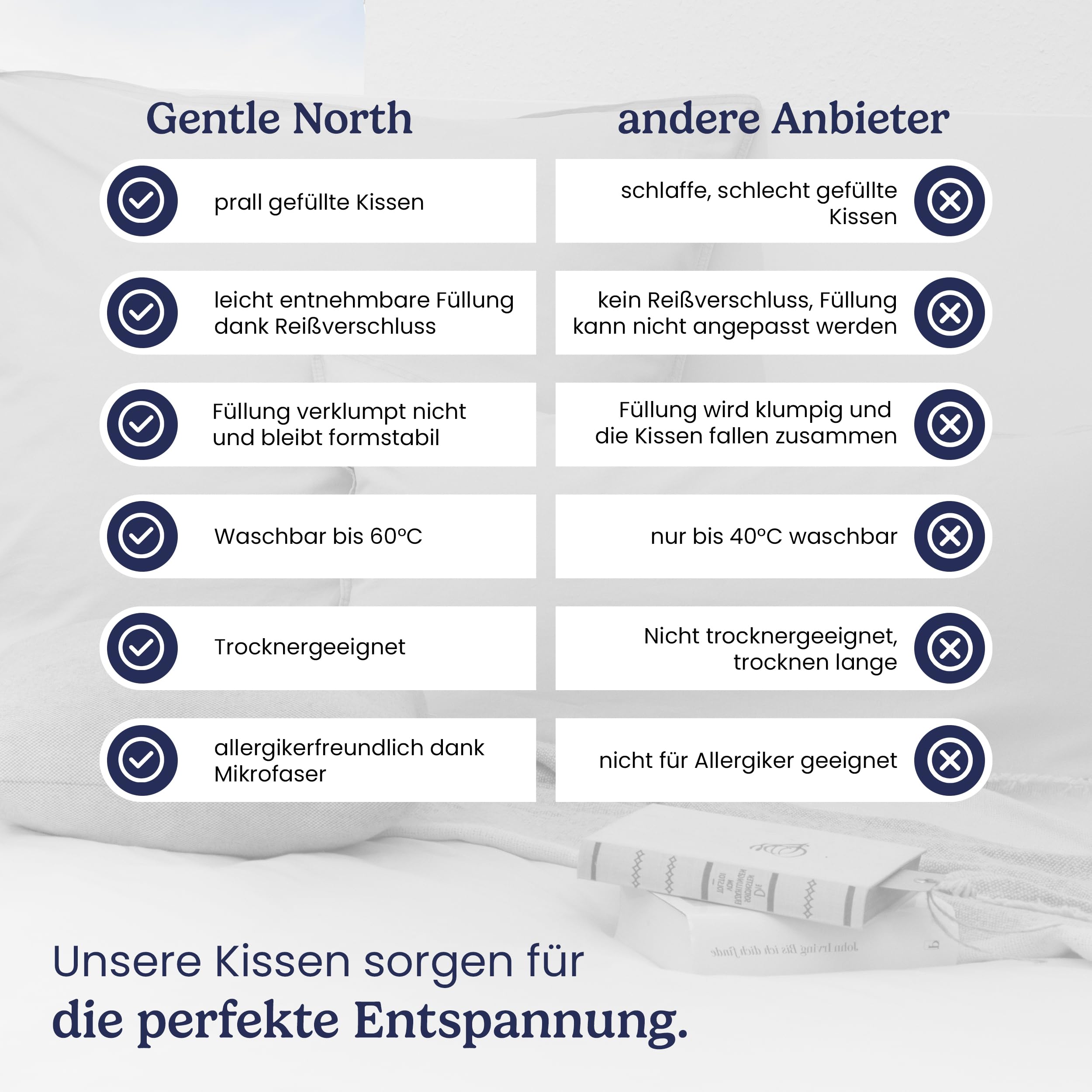 Gentle North Kopfkissen (45x45 cm gross) - 6er Set Kissen für Bett und als Dekokissen - Mit Reissverschluss für Füllung - Sofakissen - Zierkissen für Couch und Sofa - Ökotex - Waschbar bis 60° - Weiss