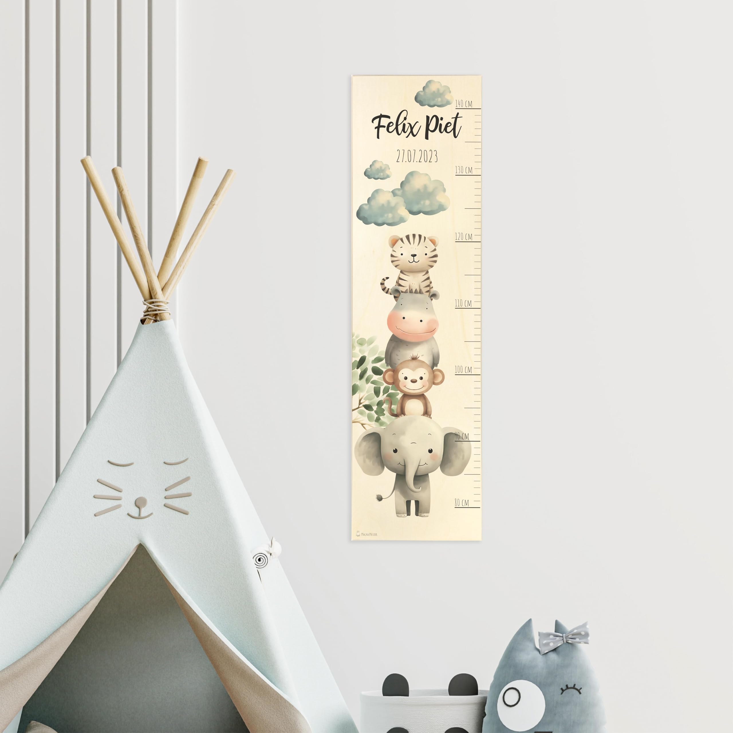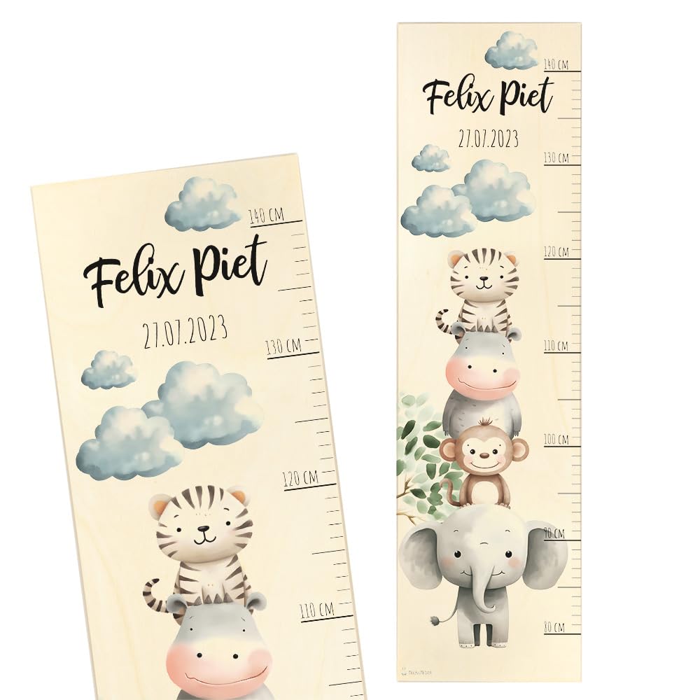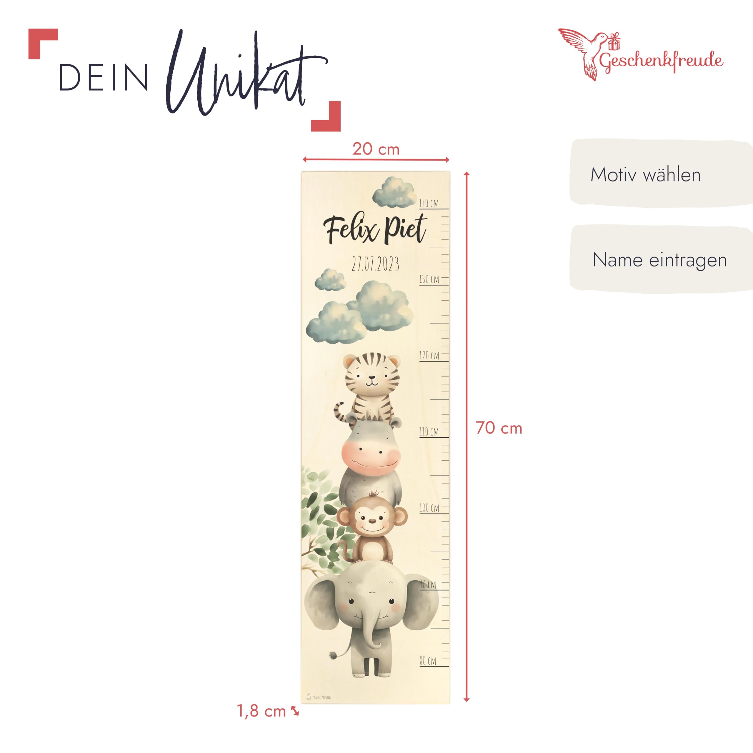 Geschenkfreude Messlatte Kinder personalisert 80-140cm - mit Tieren als Dekoration fürs Kinderzimmer - personalisierte Messlatte Kinder Holz - tolles Geburts Geschenk
