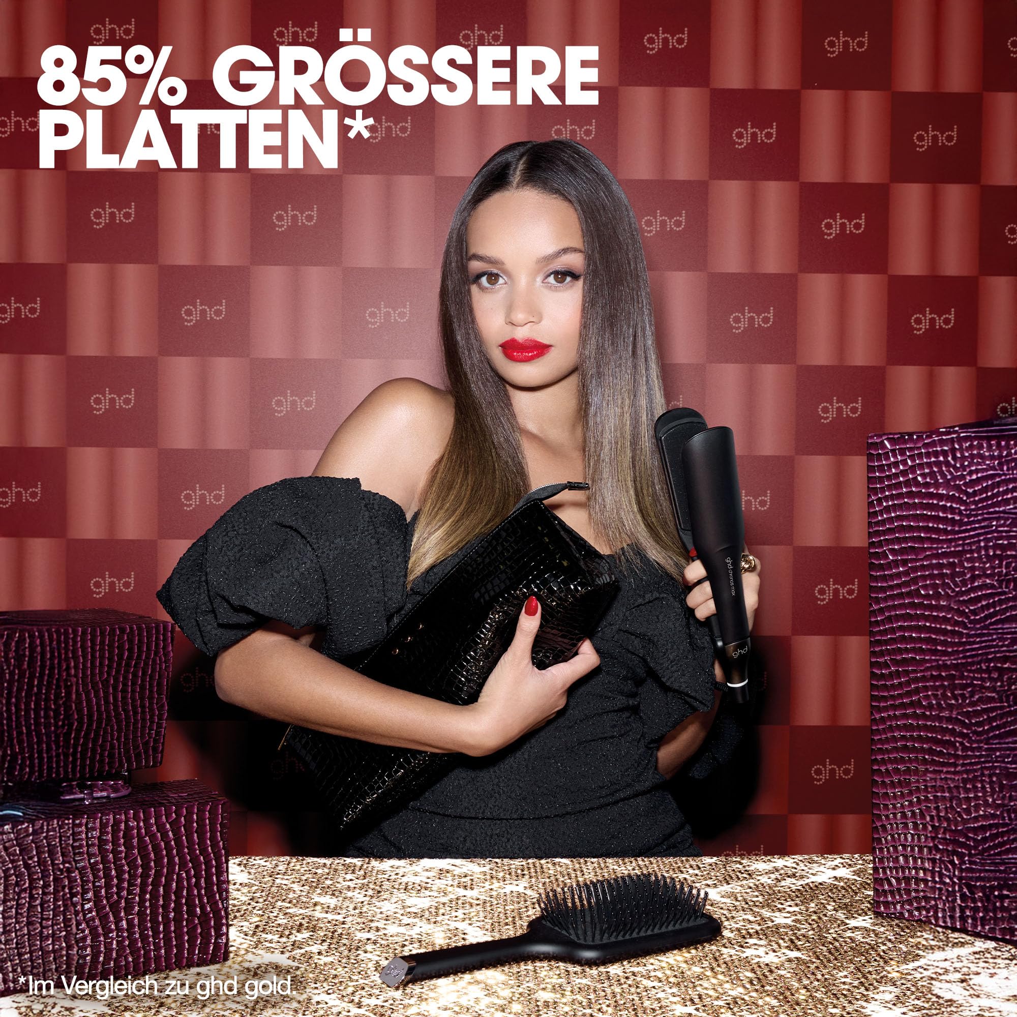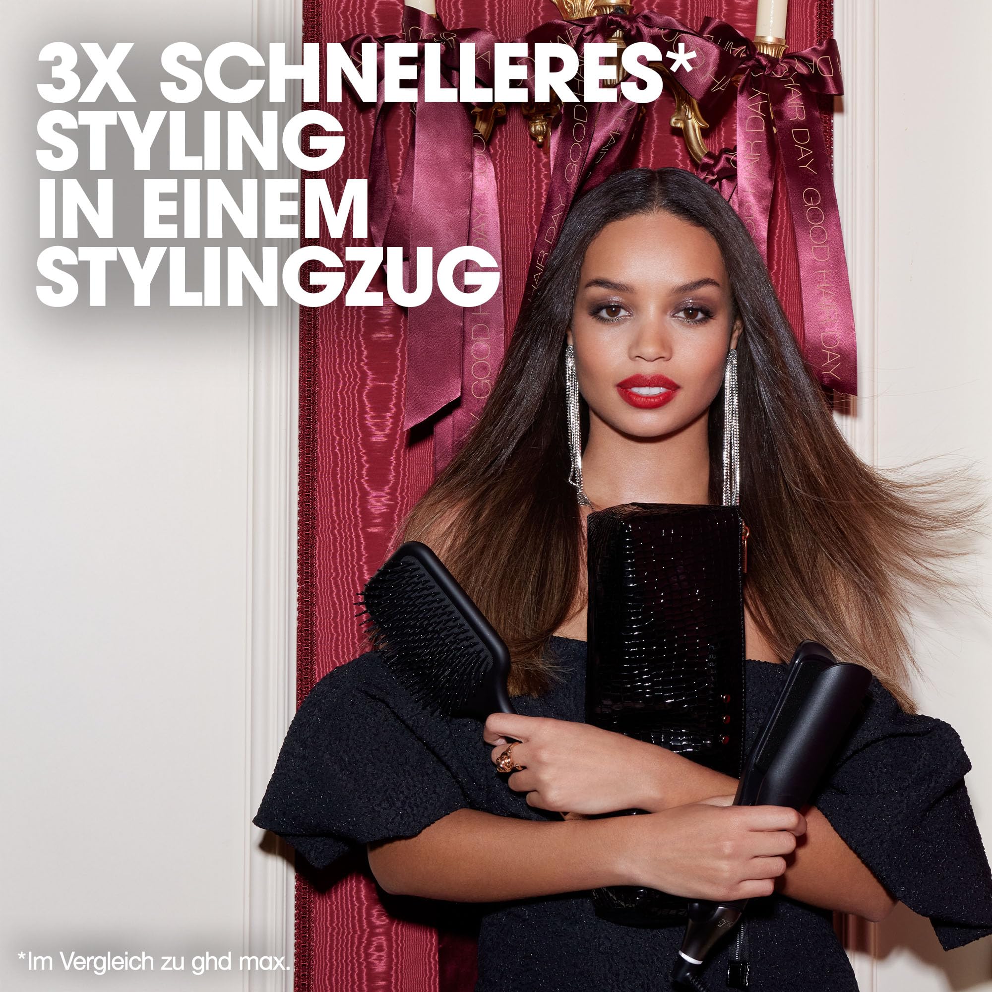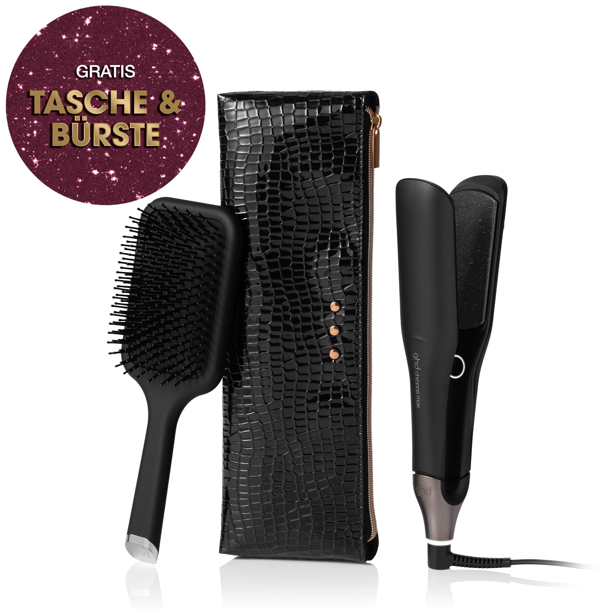 ghd chronos max Geschenkset. Bring Glamour in die festliche Saison und geniesse verführerische und zeitlose good hair days mit dem ghd chronos max Geschenkset. Der ghd chronos max professional HD Motion-Responsive™ Styler mit breiten Platten kommt zusammen mit einer ghd the all-rounder - paddle brush und einer Hitzeschutz-Tasche.¹ Der ghd chronos max Styler mit 85 % grösseren Platten2 ist ideal für langes, dickes und lockiges Haar geeignet. Erreiche 3x schnelleres3 High-Definition Styling – für Ergebnisse, die 24 Stunden halten.4 TRANSFORMATION IN NUR EINEM STYLINGZUG – Die HD Motion-Responsive™ Technologie ist mit einem 2x reaktionsfähigeren5 Algorithmus ausgestattet, der Deine Stylingbewegungen identifiziert und smart mit der richtigen Wärme- und Powerzufuhr an die Platten reagiert, um die optimale Stylingtemperatur von 185 °C konstant zu halten – für ein noch nie dagewesenes Präzisions-Level. HD ERGEBNISSE - Erreiche High-Definition Ergebnisse an langem, dicken und lockigem Haar mit Leichtigkeit. Durch die perfekte Hitzebeständigkeit erreicht das Glätteisen HD-Ergebnisse mit 90 % mehr Glanz,6 2,5x weniger Frizz7 – ganz ohne extreme Hitzeschäden.8 ghd chronos max ist der perfekte Haarstyler, um den Glass Hair Trend mit 90 % mehr Glanz6 Wirklichkeit werden zu lassen. #NOTJUSTASTRAIGHTENER – ghd chronos max überzeugt mit einem ultra-ergonomischen, schlanken und abgerundeten Design. Dank der optimierten Gehäuseform und dem überarbeiteten Gabelgelenk gelingen vielseitige Stylings schneller, einfacher – und das ganz ohne extreme Hitzeschäden.8 Erreiche bis zu 3x glatteres Haar in einem Stylingzug9 oder lasse Deiner Kreativität freien Lauf und style sanfte Wellen. Mit ghd chronos max können selbst grosse Haarpartien in kürzester Zeit mit nur einem Zug transformiert werden. PLATTEN MIT SCHMALEM RAND - Die 85 % grösseren2 Platten sind ausgestattet mit Ultra-Gloss Beschichtung und in Kombination mit dem schmalen, abgerundeten Rand sorgen sie für perfektes Styling vom Haaransatz bis zur Spitze. Der ghd chronos max mit Universalspannung ermöglicht Dein Haar zu glätten oder zu locken, egal wo Du bist. PEACE OF MIND - Schlafmodus: Der automatische Schlafmodus schaltet den Styler zur weiteren Sicherheit nach 10 Minuten ohne Benutzung ab. Ab jetzt musst Du Dir keine Sorgen mehr machen, ob Du Dein Glätteisen ausgeschaltet hast. Die ghd all-rounder paddle brush entwirrt, bändigt und stylt langes bis mittellanges Haar ohne es statisch aufzuladen. Der breite Paddle-Bürstenkopf ermöglicht es, grosse Haarpartien geschmeidig-glatt zu föhnen. In 4 Schritten zu perfekt gestyltem Haar: 1.) Sprühe ghd bodyguard Heat Protect Spray in Dein Haar. 2.) Teile das Haar in einzelne Partien ab. 3a) Glatter Look: Setze den Styler am Ansatz an und gleite gleichmässig bis zu den Spitzen durch dieHaarpartie. 3b) Gewellter/Lockiger Look: Setze den Styler am Ansatz an und drehe diesen um 180°. Gleite nun durchdie Haarpartie. Durch verschiedene Positionen und Drehungen können vielseitige Styles kreiert werden. 4.) Wiederhole den Vorgang bis dein gesamtes Haar gestylt ist. 1Das Hitzeschutz-Etui ist nur für die Verwendung mit ghd Produkten geeignet. 2Im Vergleich zu ghd gold. 3Im Vergleich zu ghd max. 4Verbrauchertest, Nov'23. 82 % von 112 Verbrauchern stimmten zu, dass ghd chronos max ein 24h haltendes Styling ermöglicht. 5Im Vergleich zu ghd platinum+. 6Technischer Test im Labor an brünettem Haar, gemessen im Vergleich zu natürlich getrocknetem Haar. 7Technischer Test im Labor an frizzy Haar im Vergleich zu natürlich getrocknetem Haar. 8Extreme Hitze ist jede Wärmebehandlung, die eine fraktionierte Verringerung der Nasszugfestigkeit pro Zyklus von mehr als 0,001 verursacht, gemessen über mindestens 100 Zyklen an braunem, kaukasischem Haar (eine „Festigkeitsverringerung“). Eine extreme Hitzeschädigung ist eine Festigkeitsverringerung von mehr als 0,005. 9Technischer Test im Labor an gewelltem Haar, im Vergleich zu natürlich getrocknetem Haar.