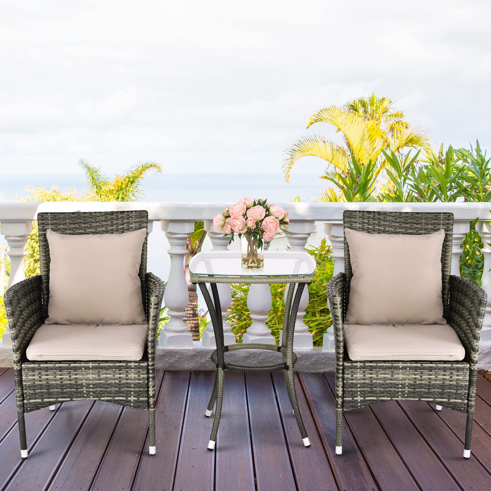 GIANTEX Balkonmöbel Kleiner Balkon, Rattan Gartenmöbel Set Bistrotisch mit 2 Stühlen, Balkonmöbel Set 3 teilig inkl. Kissen, Balkon Möbel für kleinenBalkon, Balkonset 2 Stühle 1 Tisch für 2 Personen