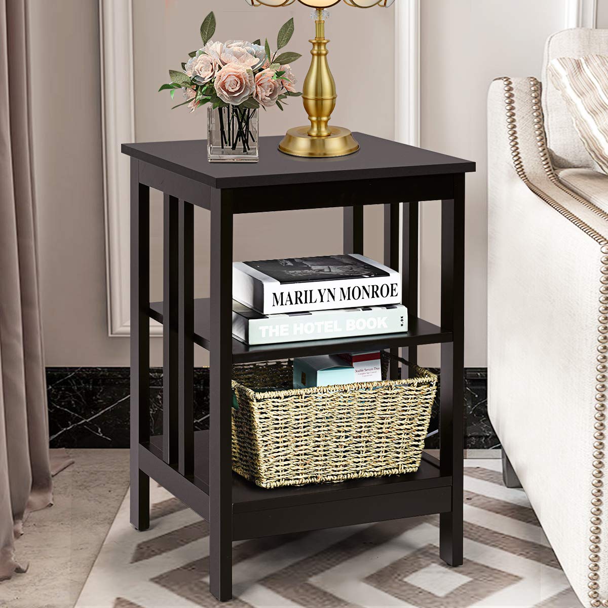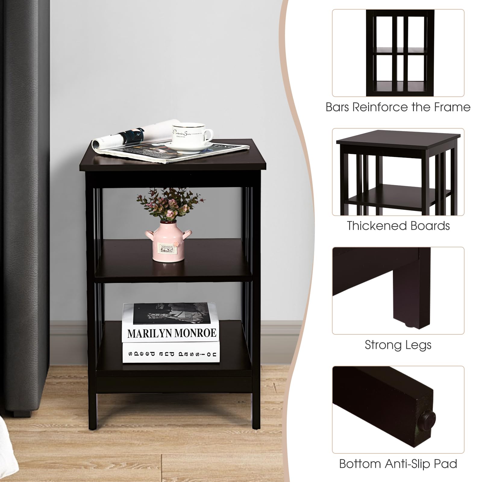 GIANTEX Nachttisch Beistelltisch 3 Ebenen, Sofatisch Couchtisch Holz, Kleiner Kaffeetisch Teetisch Wohnzimmertisch, Nachtschrank Nachtkommode 40x40x61cm für Wohnzimmer Schlafzimmer (Braun)