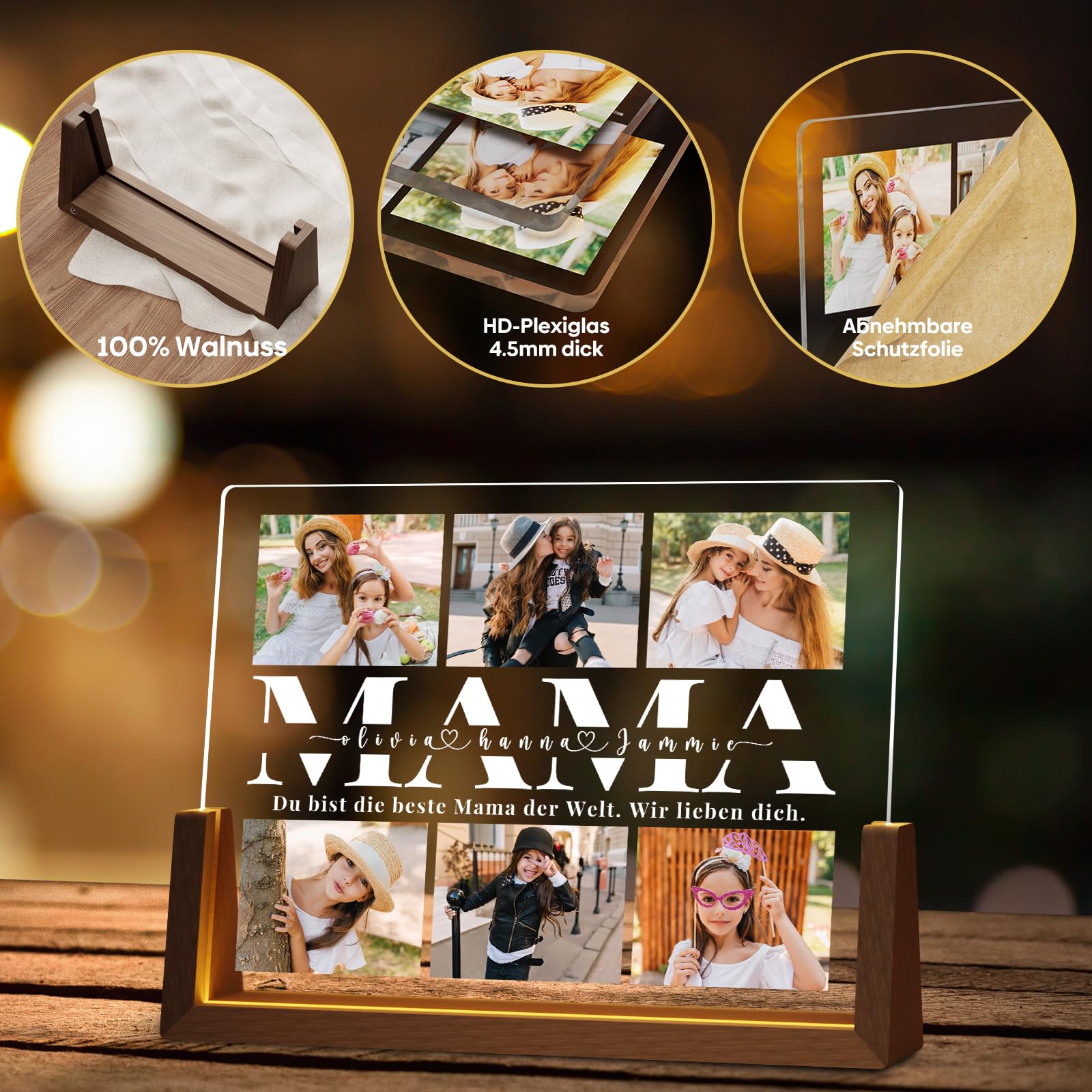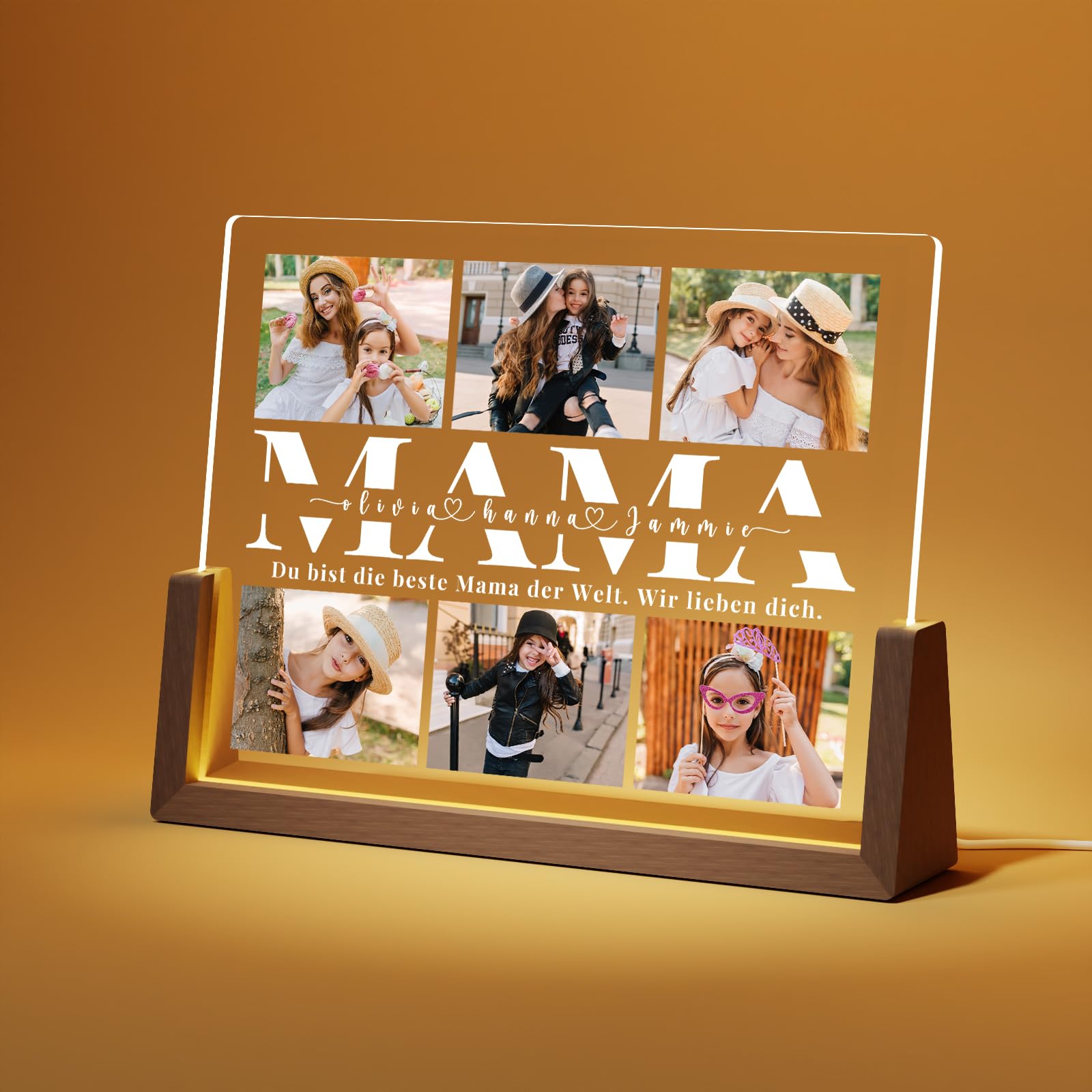 Sinnvolle Geschenke für Mama: Kreieren Sie ein warmes Nachtlicht mit einem Foto von Ihnen und Ihrer Mutter. Vertreiben Sie die Dunkelheit und bringen Sie Ihrer Mutter Wärme und Licht in jeder langen Nacht.Professionelle Herstellung: Unser personalisiertes Fotorahmen-Nachtlicht aus Holz verwendet 4,5 mm HD-Acryl und UV-Farbdrucktechnologie für einen wiederaufladbaren Fotorahmen aus Massivholz, um ein hochwertiges LED-Nachtlicht herzustellen. Kauftipps:Wie man bestellt ?1. Klicken Sie auf die gelbe Schaltfläche ""Jetzt anpassen"". 2. Laden Sie Fotos und Text hoch (Tipp: Versuchen Sie beim Hochladen von Fotos, jeden Rahmen mit hochauflösenden Fotos zu füllen, um den besten Effekt zu erzielen) 3. In den Warenkorb legenÜber die Zeit: Es dauert 2-4 Tage für die Produktion und 7-15 Tage für den Versand. Bitte planen Sie genügend Zeit ein, um das Produkt zu erhalten, damit sich Ihr Geschenk nicht verzögert.Nach-Verkauf: Wir versprechen 100% Rückerstattung wegen der Qualitätsprobleme. Wenn Sie irgendwelche Fragen haben, kontaktieren Sie uns bitte, wir werden Ihnen eine zufriedenstellende Lösung anbieten. Vielen Dank, dass Sie uns eine Chance geben, das Problem zu lösen.