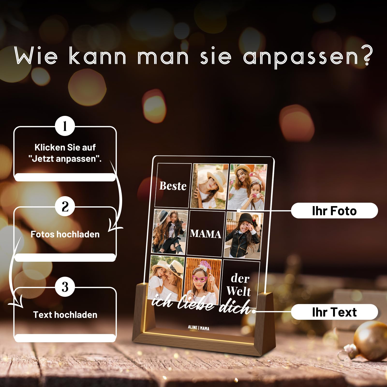 Sinnvolle Geschenke für Mama: Kreieren Sie ein warmes Nachtlicht mit einem Foto von Ihnen und Ihrer Mutter. Vertreiben Sie die Dunkelheit und bringen Sie Ihrer Mutter Wärme und Licht in jeder langen Nacht.Professionelle Herstellung: Unser personalisiertes Fotorahmen-Nachtlicht aus Holz verwendet 4,5 mm HD-Acryl und UV-Farbdrucktechnologie für einen wiederaufladbaren Fotorahmen aus Massivholz, um ein hochwertiges LED-Nachtlicht herzustellen. Kauftipps:Wie man bestellt ?1. Klicken Sie auf die gelbe Schaltfläche ""Jetzt anpassen"". 2. Laden Sie Fotos und Text hoch (Tipp: Versuchen Sie beim Hochladen von Fotos, jeden Rahmen mit hochauflösenden Fotos zu füllen, um den besten Effekt zu erzielen) 3. In den Warenkorb legenÜber die Zeit: Es dauert 2-4 Tage für die Produktion und 7-15 Tage für den Versand. Bitte planen Sie genügend Zeit ein, um das Produkt zu erhalten, damit sich Ihr Geschenk nicht verzögert.Nach-Verkauf: Wir versprechen 100% Rückerstattung wegen der Qualitätsprobleme. Wenn Sie irgendwelche Fragen haben, kontaktieren Sie uns bitte, wir werden Ihnen eine zufriedenstellende Lösung anbieten. Vielen Dank, dass Sie uns eine Chance geben, das Problem zu lösen.