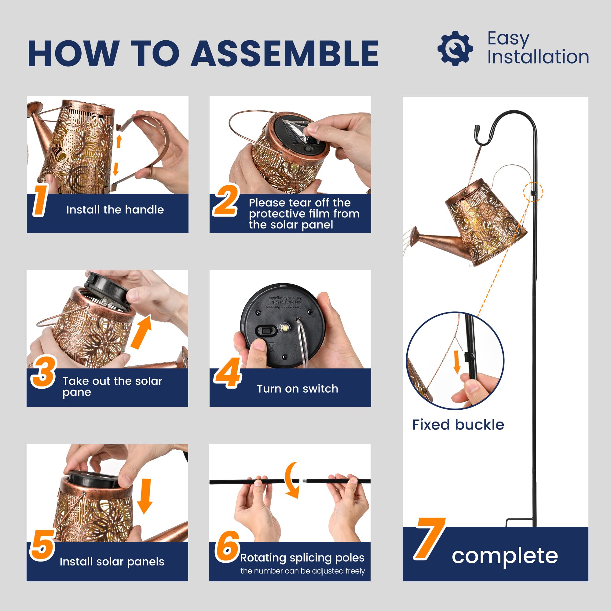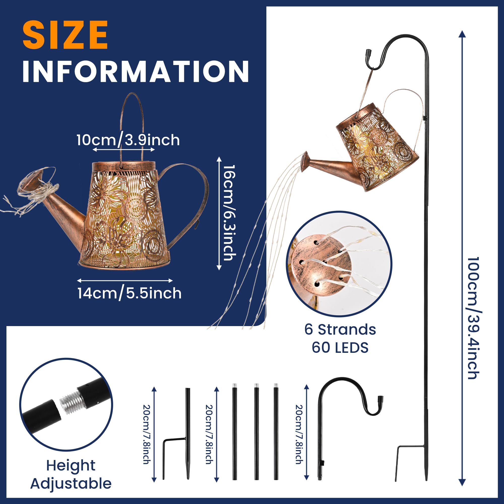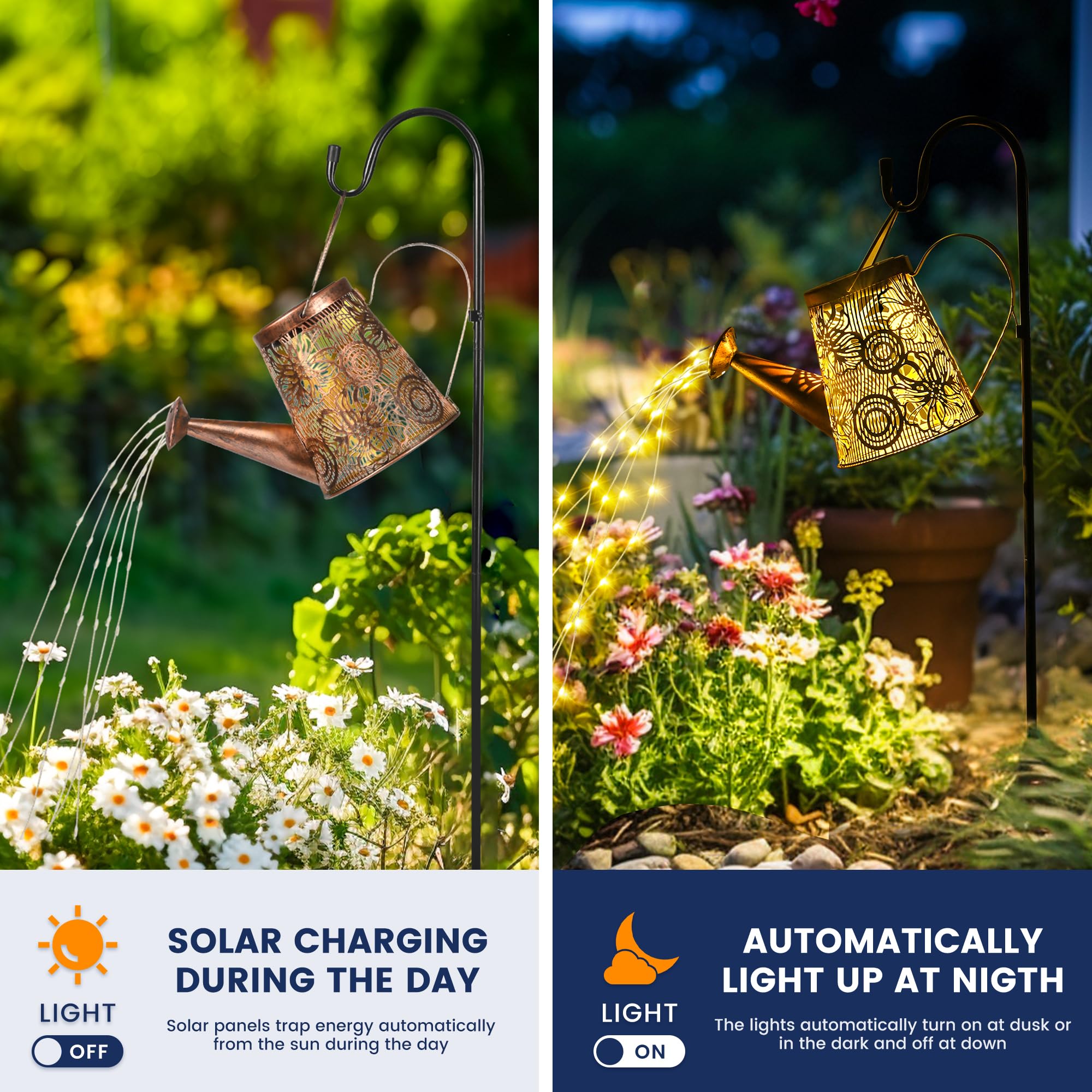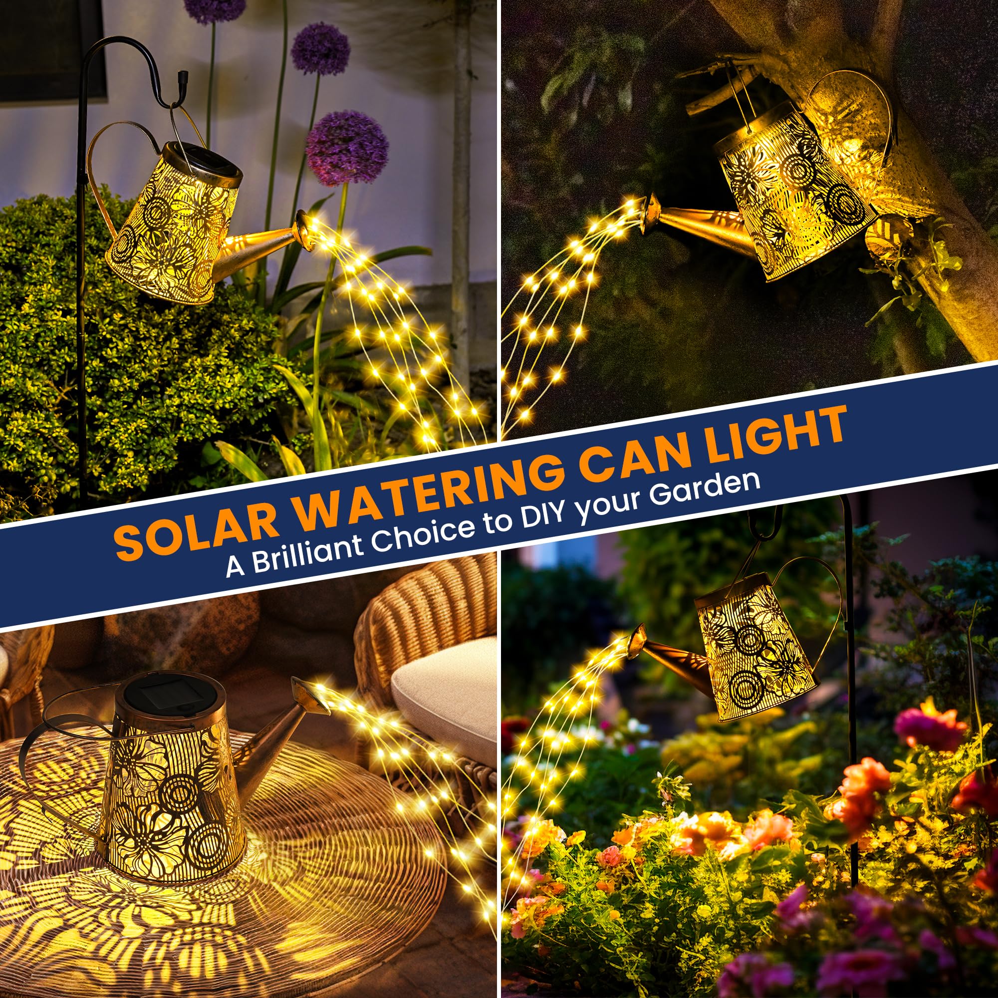 [Einzigartiges DIY-Giesskannenlicht]: Das dekorative Solarlicht hat 6 Kupfer-Lichterketten und 60 LEDs, funkelnd wie Sterne, mit einem charmanten fliessenden Wassereffekt, und kann leicht gebogen und in Ihre Lieblingsform geformt werden. Das ausgeschnittene Design projiziert nachts ein schönes Retro-Muster. [Einfach zu montieren und zu verwenden] Gartenornamente im Freien müssen nur den mitgelieferten 39-Zoll-Schäferhaken (höhenverstellbar) zusammenbauen, den Schalter einschalten und in den weichen Boden stecken. (Es kann auch direkt platziert oder aufgehängt werden). [Automatisches Ein-/Aus] Die Solar-Giesskannenleuchte für den Aussenbereich ist mit hochwertigen Solarzellen und Batterien mit grosser Kapazität ausgestattet, die die Lichter nachts automatisch einschalten können, nach dem Aufladen für 6-8 Stunden kontinuierlich arbeiten und tagsüber automatisch ausschalten. [Langlebig und wetterfest] Diese Bewässerungsflaschen-Lichterkette besteht aus hochwertigem Metall, das IP44 wasserdicht und korrosionsbeständig ist. Sie müssen sich keine Sorgen machen, dass Sie es an regnerischen oder verschneiten Tagen verwenden. [Perfektes Dekorationsgeschenk]: Die Solar-Giesskannenbeleuchtung mit Lichterkette ist eine wirklich faszinierende Ergänzung für Ihren Garten, Blumenbeet, Terrasse, Baumzweig, Topfpflanzen usw. Dies ist ein besonderes Gartengeschenk für alle, die Gartendekoration im Freien lieben.