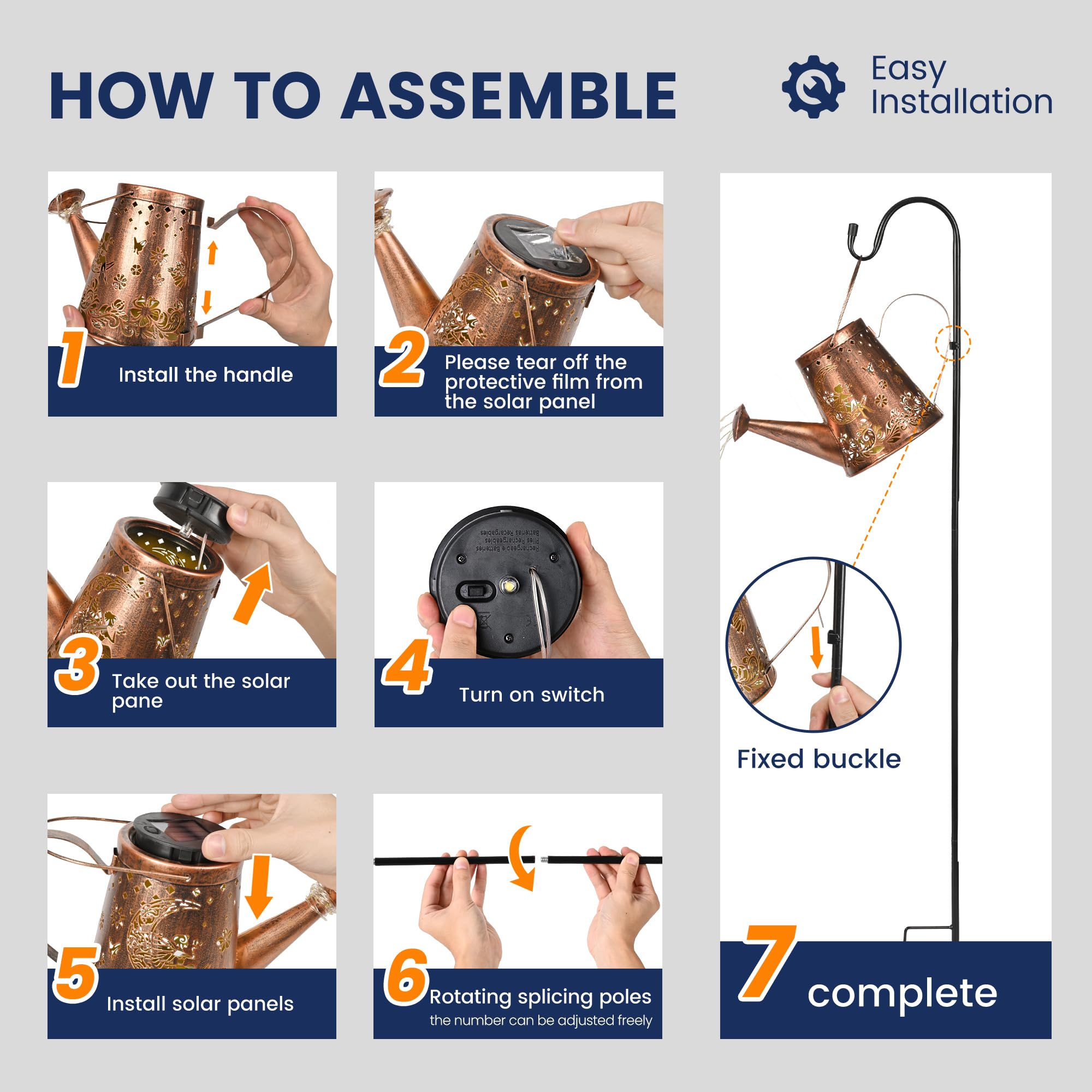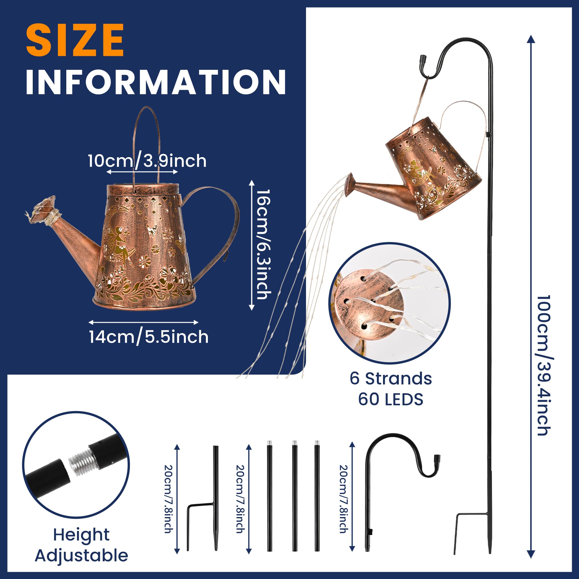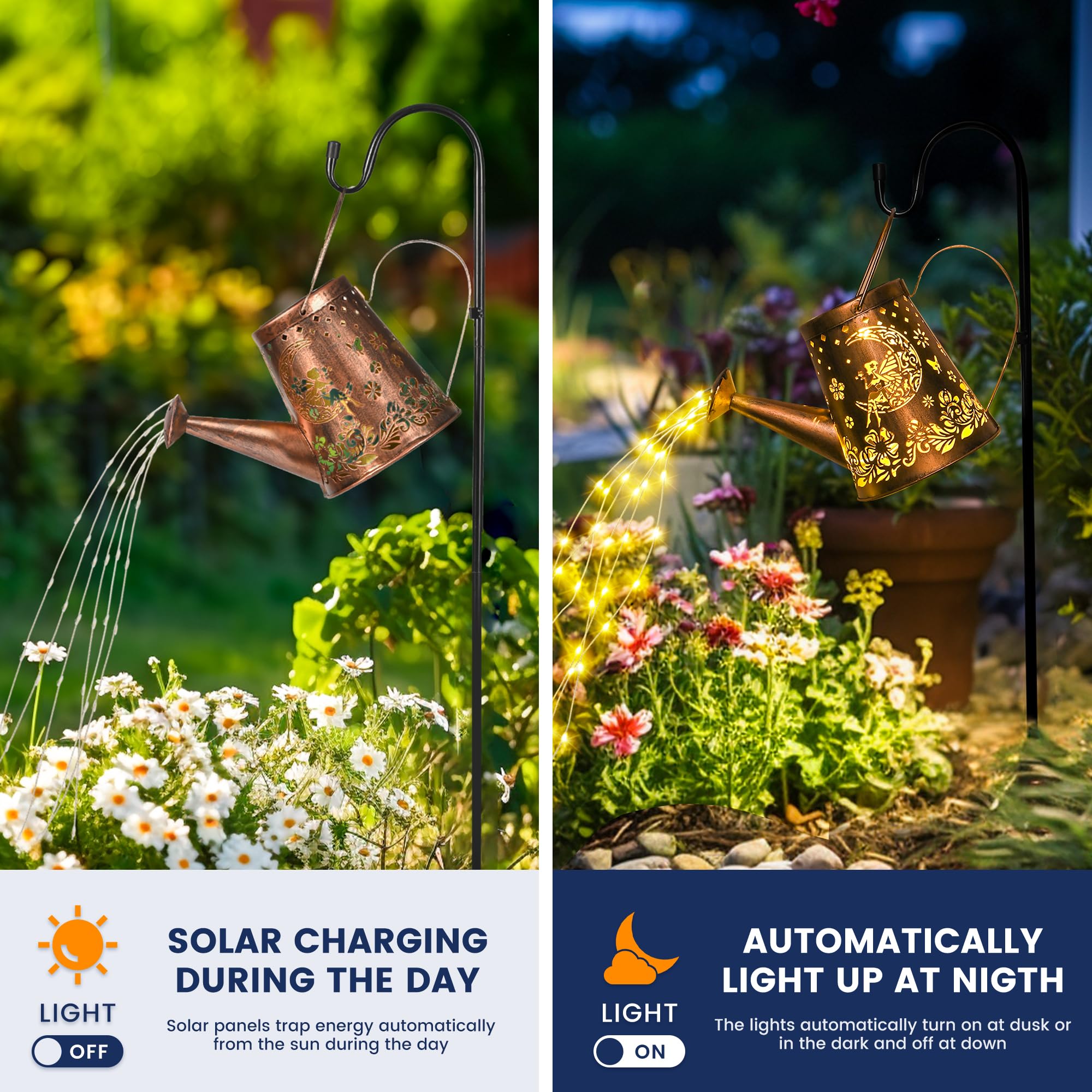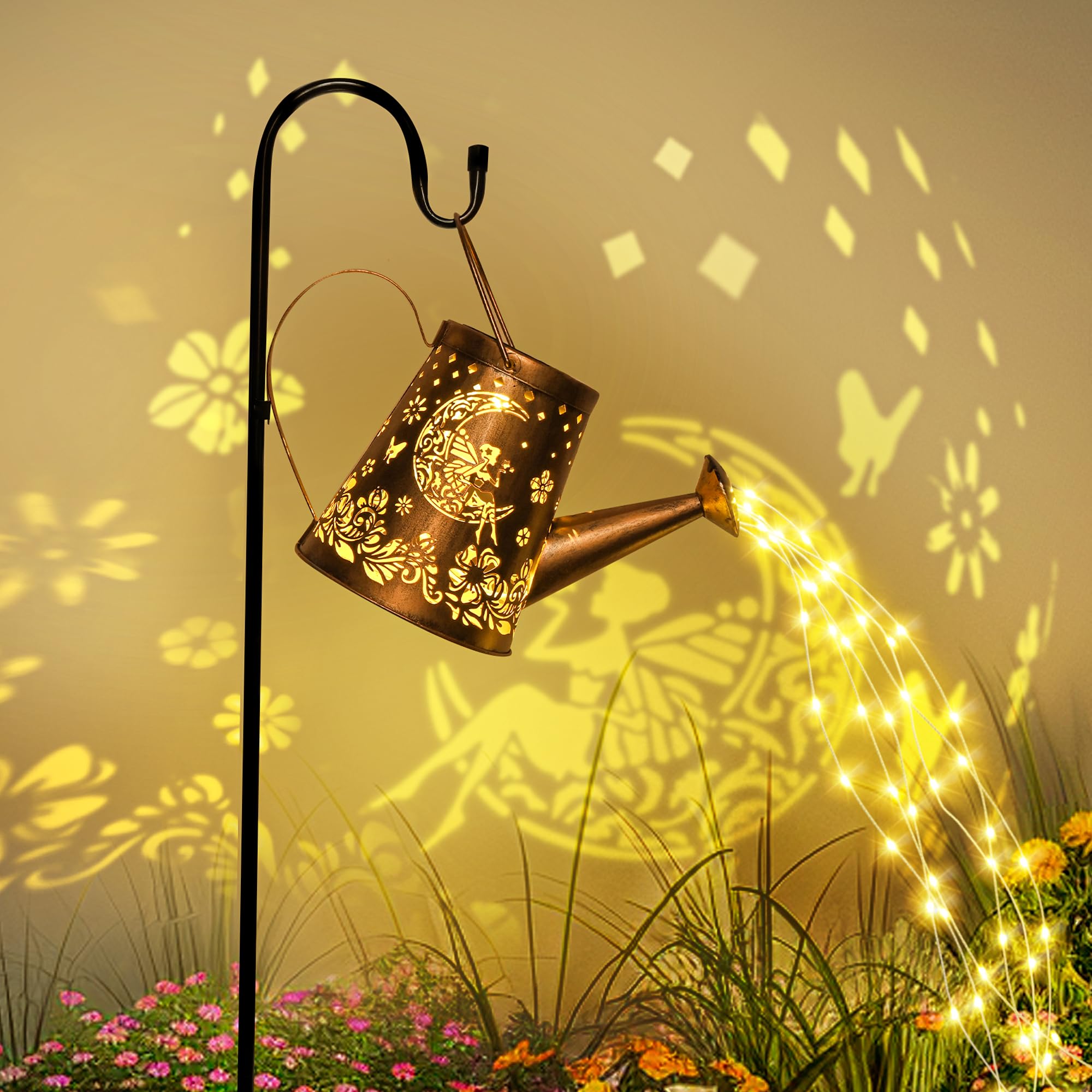 [Einzigartiges DIY-Giesskannenlicht]: Das dekorative Solarlicht hat 6 Kupfer-Lichterketten und 60 LEDs, funkelnd wie Sterne, mit einem charmanten fliessenden Wassereffekt, und kann leicht gebogen und in Ihre Lieblingsform geformt werden. Das ausgeschnittene Design projiziert nachts ein schönes Retro-Muster. [Einfach zu montieren und zu verwenden] Gartenornamente im Freien müssen nur den mitgelieferten 39-Zoll-Schäferhaken (höhenverstellbar) zusammenbauen, den Schalter einschalten und in den weichen Boden stecken. (Es kann auch direkt platziert oder aufgehängt werden). [Automatisches Ein-/Aus] Die Solar-Giesskannenleuchte für den Aussenbereich ist mit hochwertigen Solarzellen und Batterien mit grosser Kapazität ausgestattet, die die Lichter nachts automatisch einschalten können, nach dem Aufladen für 6-8 Stunden kontinuierlich arbeiten und tagsüber automatisch ausschalten. [Langlebig und wetterfest] Diese Bewässerungsflaschen-Lichterkette besteht aus hochwertigem Metall, das IP44 wasserdicht und korrosionsbeständig ist. Sie müssen sich keine Sorgen machen, dass Sie es an regnerischen oder verschneiten Tagen verwenden. [Perfektes Dekorationsgeschenk]: Die Solar-Giesskannenbeleuchtung mit Lichterkette ist eine wirklich faszinierende Ergänzung für Ihren Garten, Blumenbeet, Terrasse, Baumzweig, Topfpflanzen usw. Dies ist ein besonderes Gartengeschenk für alle, die Gartendekoration im Freien lieben.