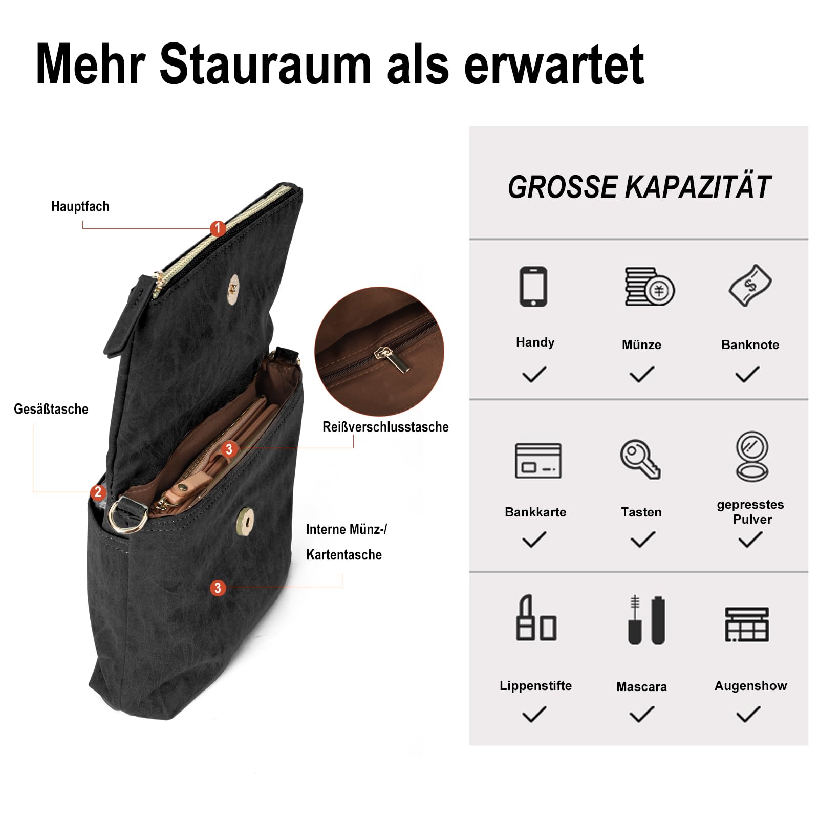 Kapazität: Drei Haupttaschen sowie eine Innentasche mit Reissverschluss zur privaten Aufbewahrung von Kreditkarten, Münzen, Schlüsseln usw.