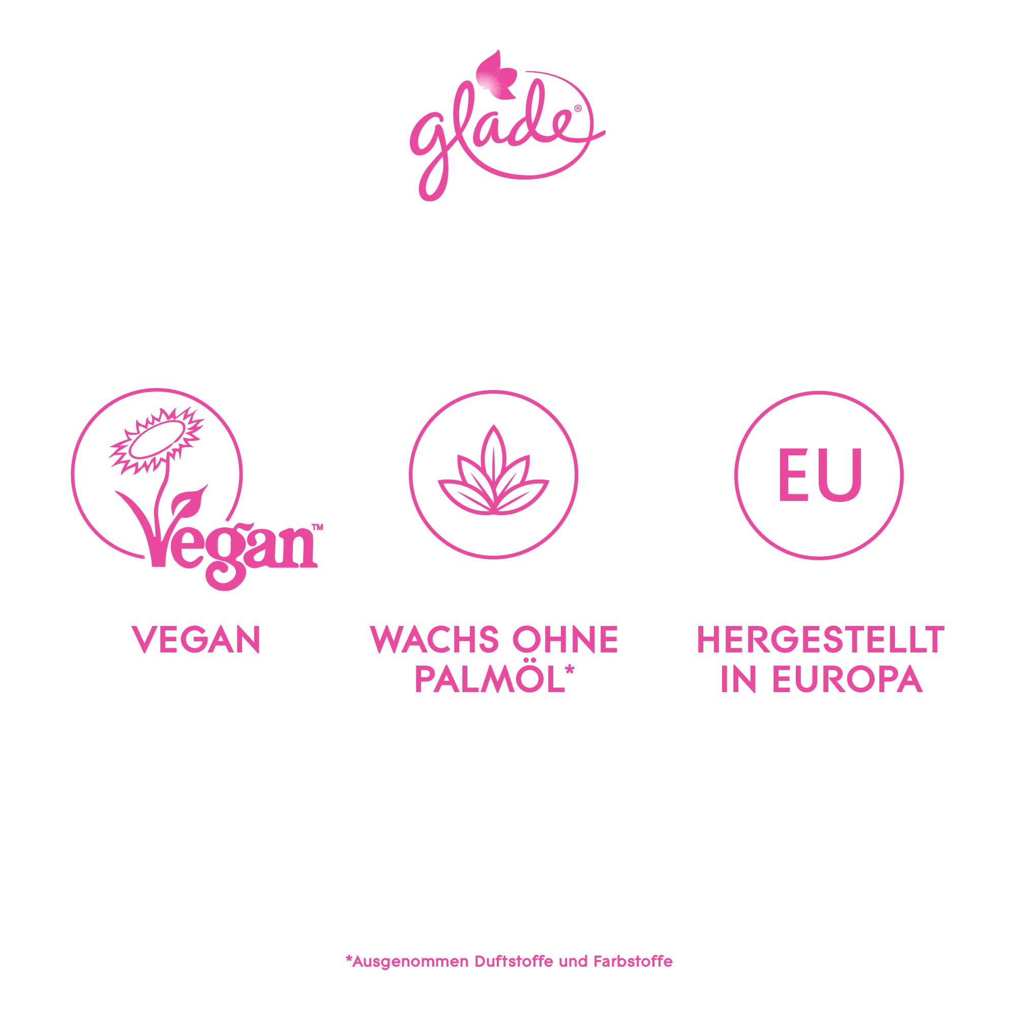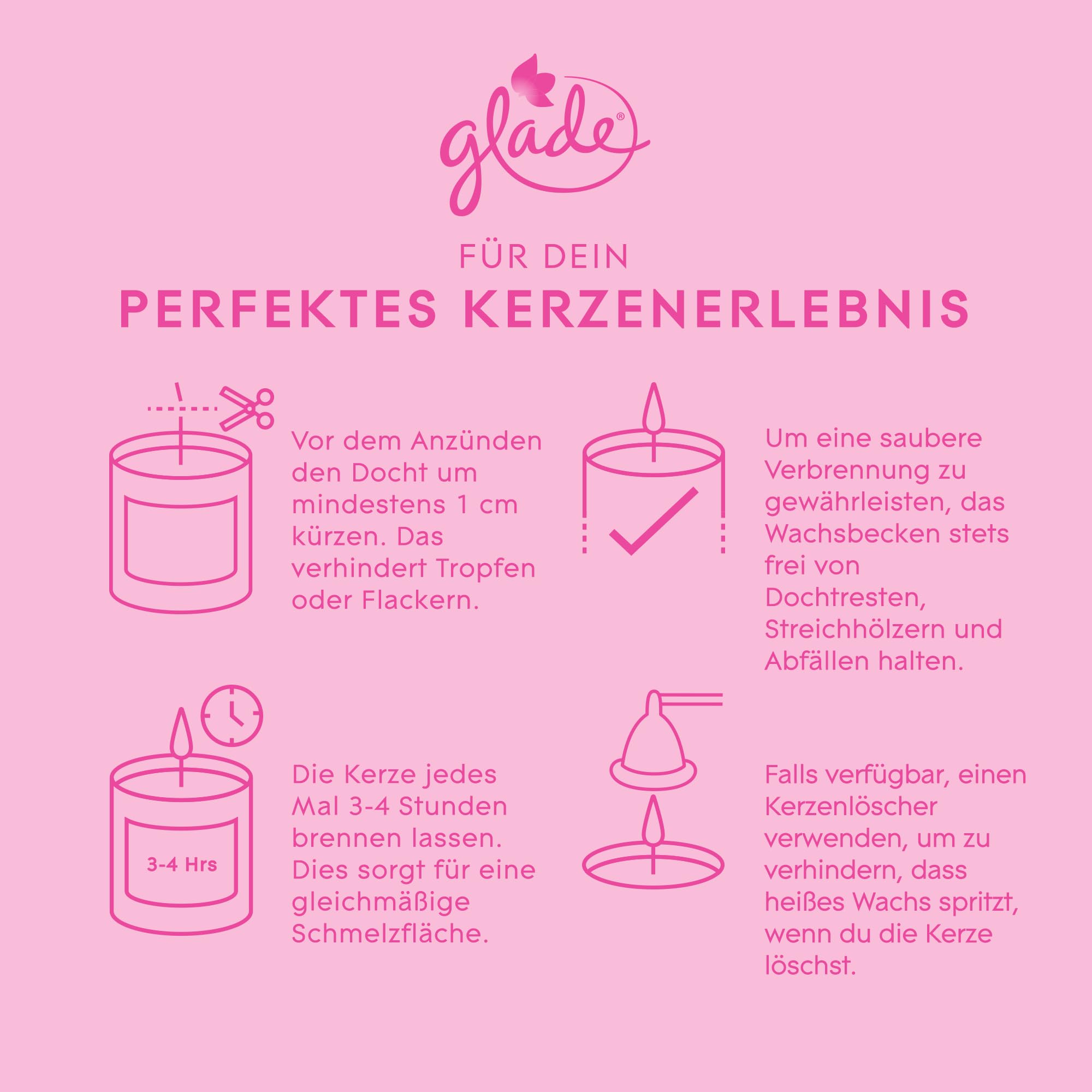 Erwecken Sie Ihre Sinne und verwandeln Sie jeden Raum in eine Wohlfühloase mit dem sanften, warmen Licht von Glade Duftkerzen. Diese meisterhaft komponierten Duftkerzen, angereichert mit natürlichen ätherischen Ölen, schaffen in Ihrem Zuhause eine einladende Atmosphäre. Wählen Sie aus einer Vielzahl exklusiver Duftkompositionen, die nicht nur für angenehme Raumluft sorgen, sondern auch Erinnerungen an besondere Momente, Kindheitserlebnisse oder vergangene Urlaube wecken. Düfte haben eine einzigartige Fähigkeit, Emotionen zu beeinflussen und ein Gefühl von Zufriedenheit zu erzeugen. Der menschliche Geruchssinn ist äusserst fein: Mit rund 20 Millionen Riechzellen ist er in der Lage, tausende von Duftnoten zu unterscheiden, oft reicht bereits ein einzelnes Duftmolekül. Ein wahrgenommener Duft wird automatisch mit früheren Erlebnissen verknüpft, wodurch Erinnerungen lebendig werden. Glade Duftkerzen sind für den Innenbereich konzipiert, können jedoch auch in geschützten Aussenbereichen verwendet werden. Stellen Sie sicher, dass der Docht nicht länger als 0,5 cm ist, und lassen Sie die Kerze bei der ersten Verwendung etwa drei Stunden brennen, damit das Wachs gleichmässig schmilzt. Verwenden Sie das leere Kerzenglas wieder, zum Beispiel für Dekorationszwecke, oder entsorgen Sie es umweltgerecht über Glas-Sammelstellen.