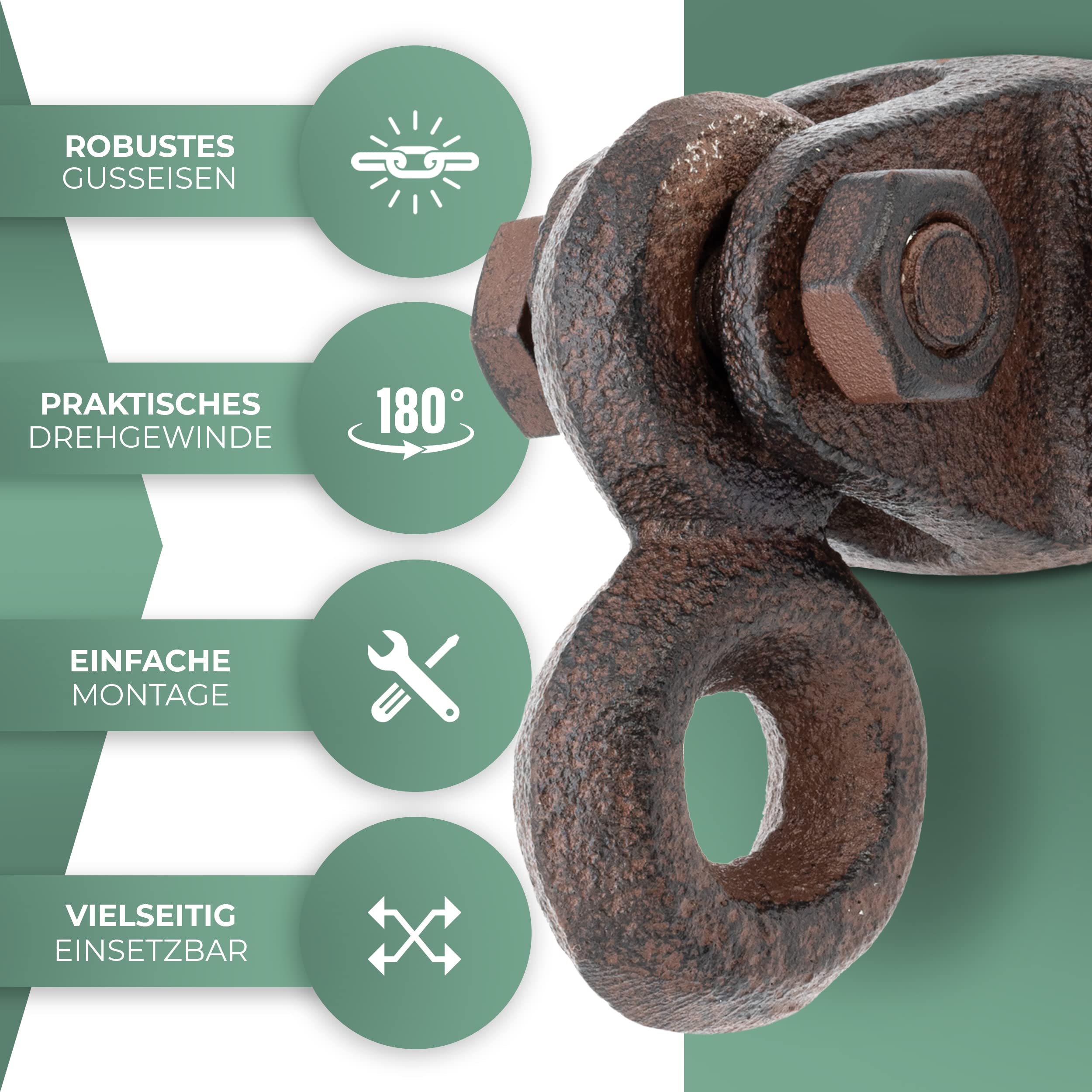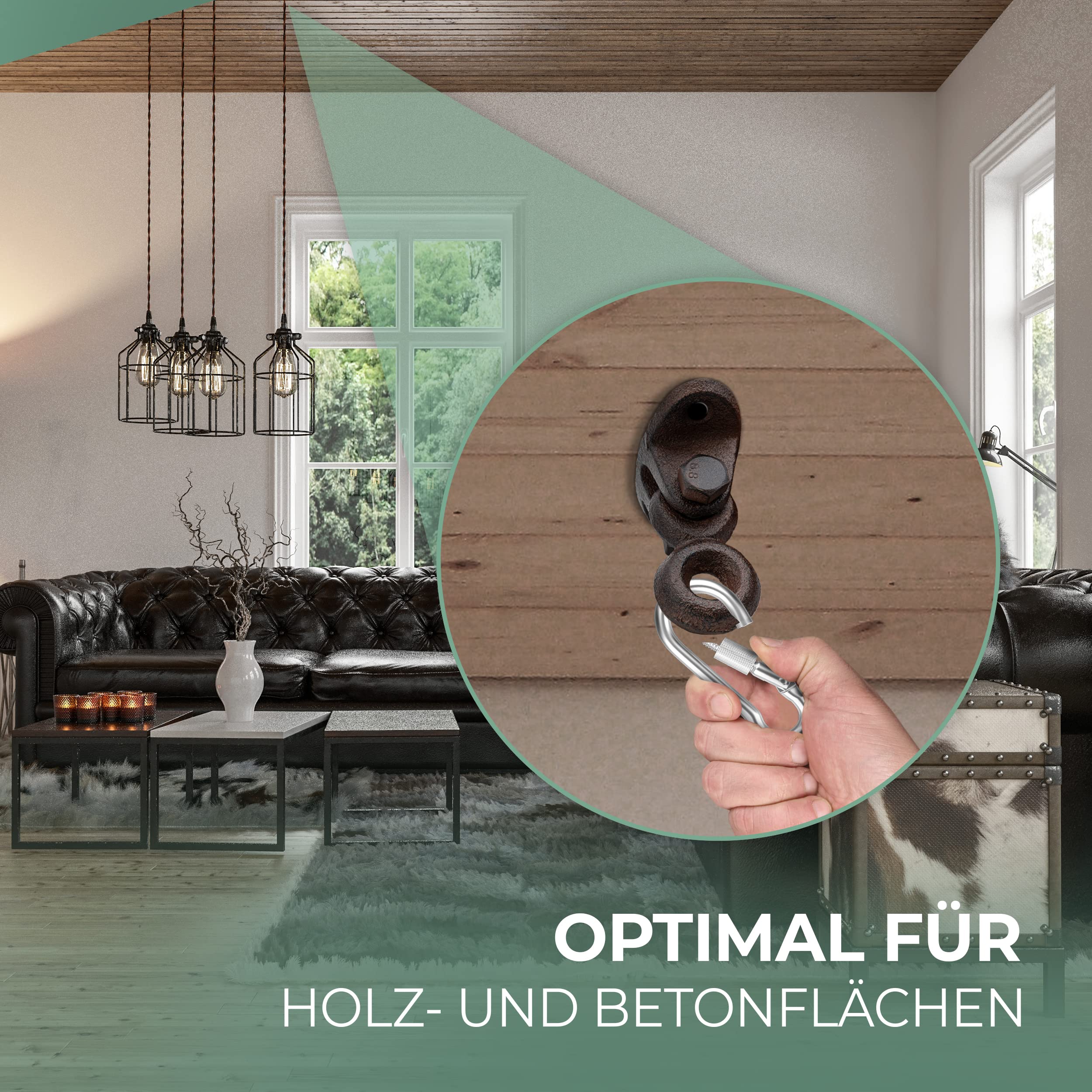 Glaskönig - Wand und Deckenhaken aus robustem GusseisenSie sind auf der Suche nach einer Lösung um Ihre Garderobe umzugestallten oder einfach um schöne Dinge an die Wand oder Decke zu hängen?Dann sind Sie bei uns genau richtig...Die Haken aus Gusseisen werden in alter Tradition und in Handarbeit gegossen. Leichte Unebenheiten in der Oberfläche sind Produktinsbedingt nicht zu vermeiden und ein Zeichen für die individuelle Herstellungsweise.Dank des mitgelieferten Befestigungsmaterials können die Wand oder Deckenhaken sofort befestigt und verwendet werden.Gusseisen ist ein sehr robustes Material und kann in so ziemlich jedem Bereich dekoriert und verwendet werden. Ob im Vanlife Bereich zum Ausbau und der Verschönerung Ihres Vans, oder um eine Lampe oder Pflanze von der Decke hängen zu lassen - Mit unseren Haken und Ösen setzen und hängen Sie jeden Gegenstand ins richtige Licht.✔️ Haken und Ösen aus robustem Gusseisen✔️ Einfache Montage Dank mitgeliefertem Befestigungsmaterial✔️ Belastbar bis 50kg✔️ Beweglich oder feststehend ✔️ Unzählige Einsatz und VerwendungsmöglichkeitenÜberzeugen Sie sich selbst und gestallten Sie Ihre Dekoration mit unseren Einrichtungsprodukten.Klicken Sie JETZT auf "in den Einkaufswagen"*Dekorationsartikel gehören nicht zum Leistungsumfang