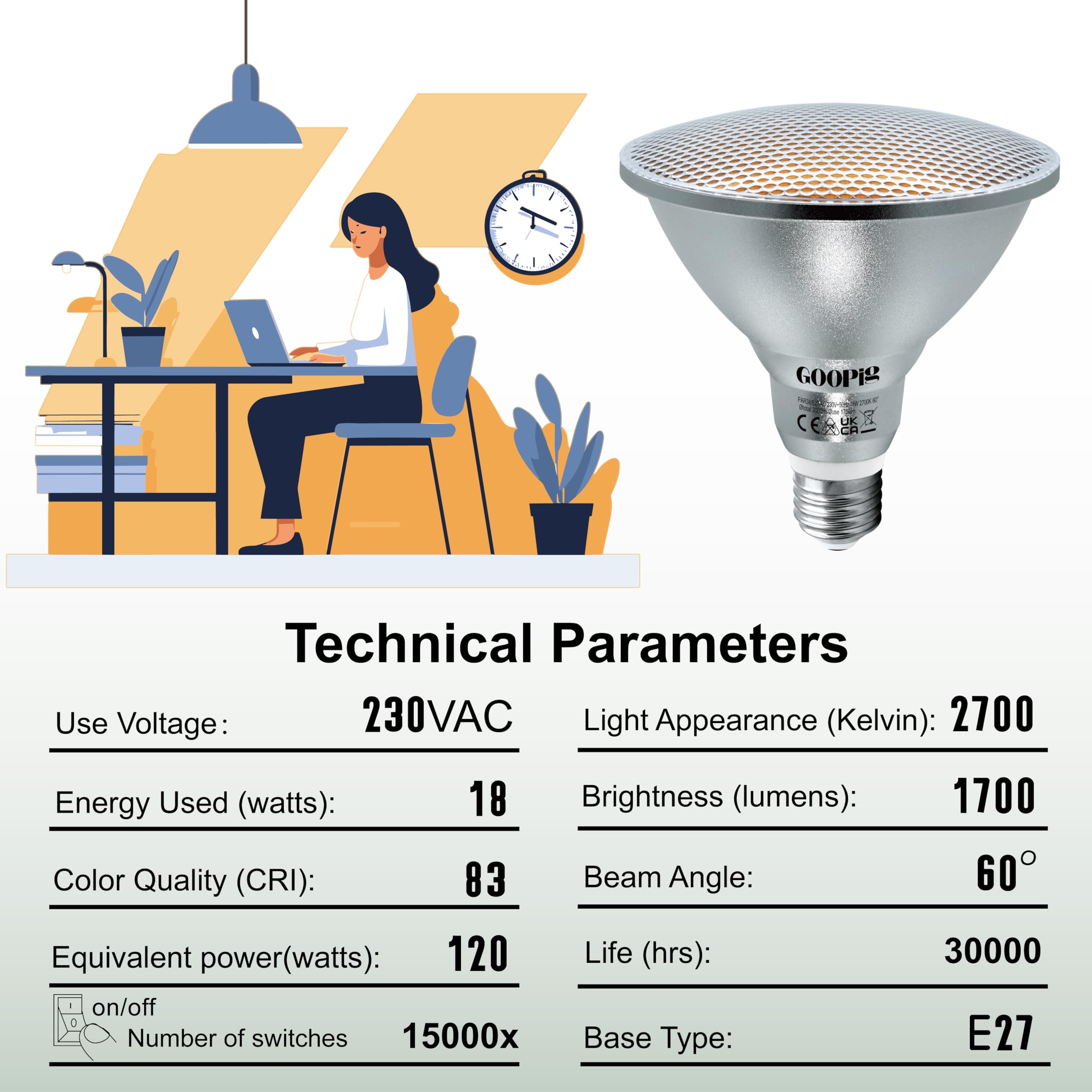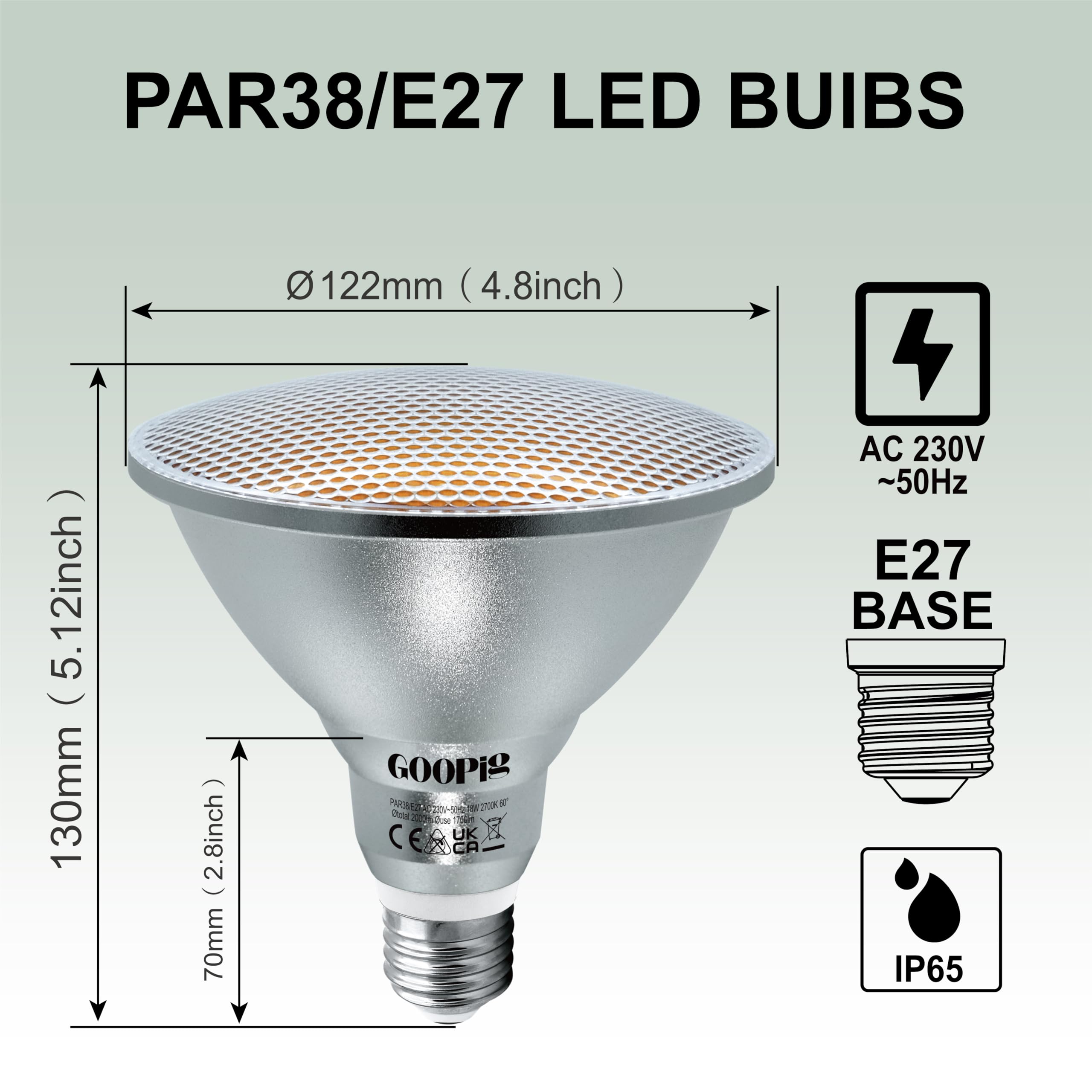 Goopig E27 PAR38 LED Lampe Nicht Dimmbar, 18W Warmweiss 2700K Ersetzt 120W Halogen Glühlampe, 2er-Pack, 2000lm AC 230V Leuchtmittel, Flimmerfrei Strahler, Reflektorlampe IP65 Abstrahlwinkel-60° Birnen