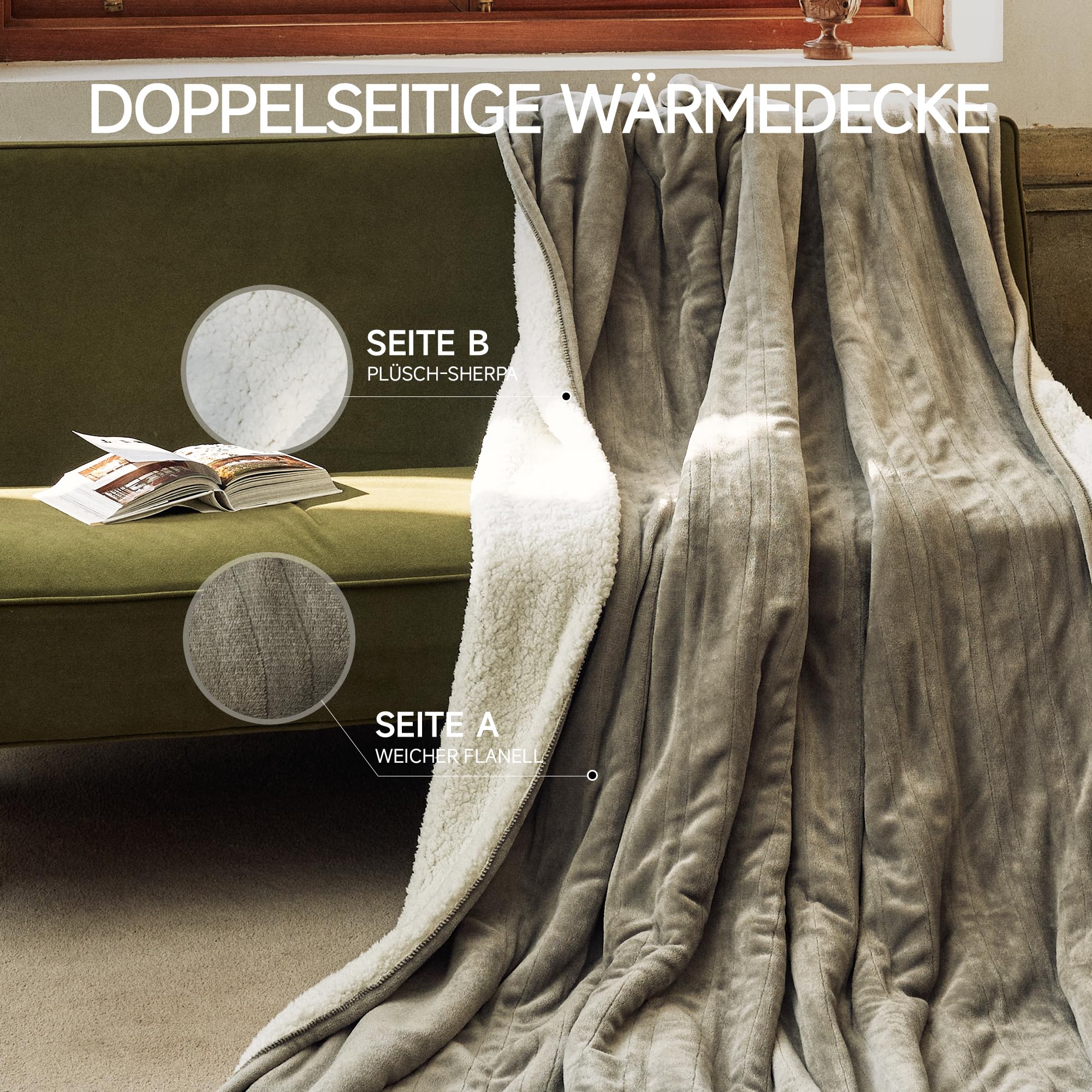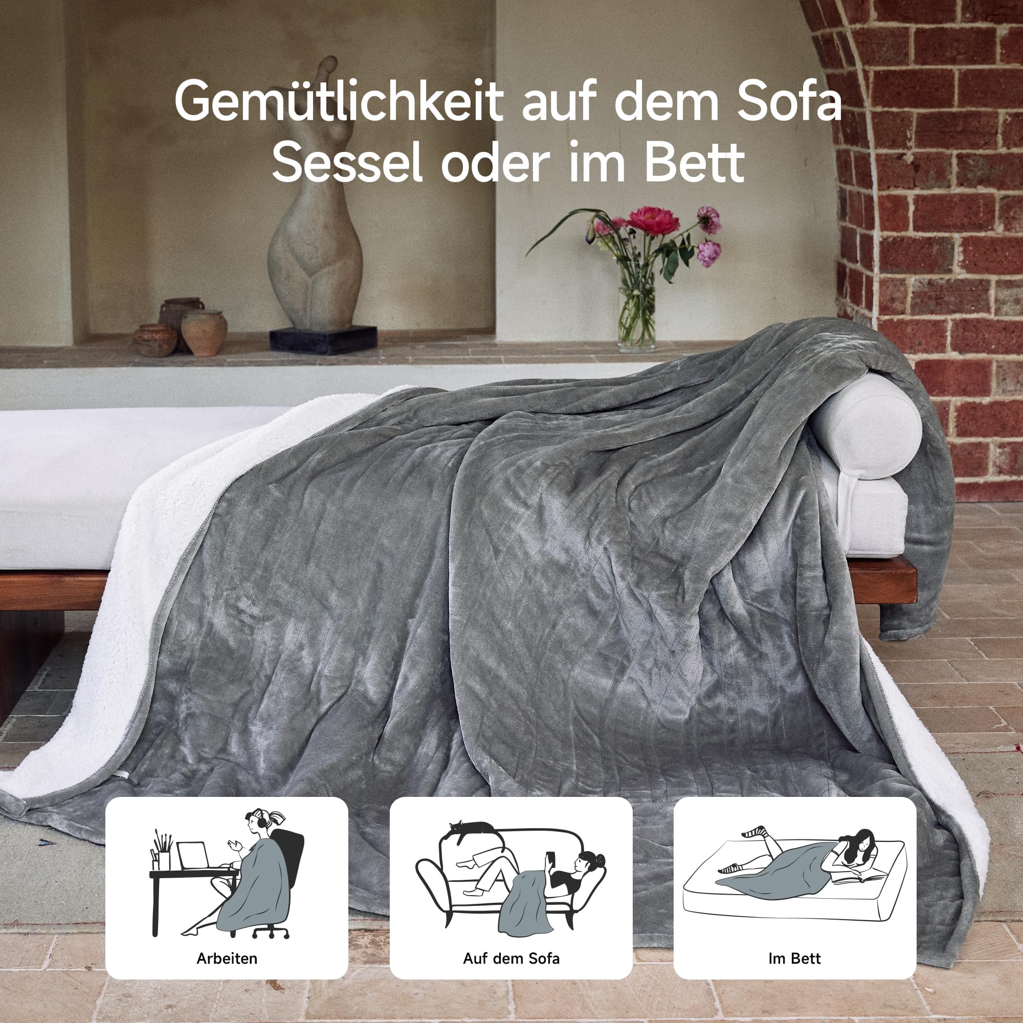 GOTCOZY Heizdecke 150x200 cm - Weicher seidiger Plüsch Wärmedecke Heizdecke 9 Heizstufen und 10 Stunden Auto-Off-Timer Überhitzungsschutz CE-Zertifiziert Kuscheldecke für Bett&Büro Waschbar(Grau)