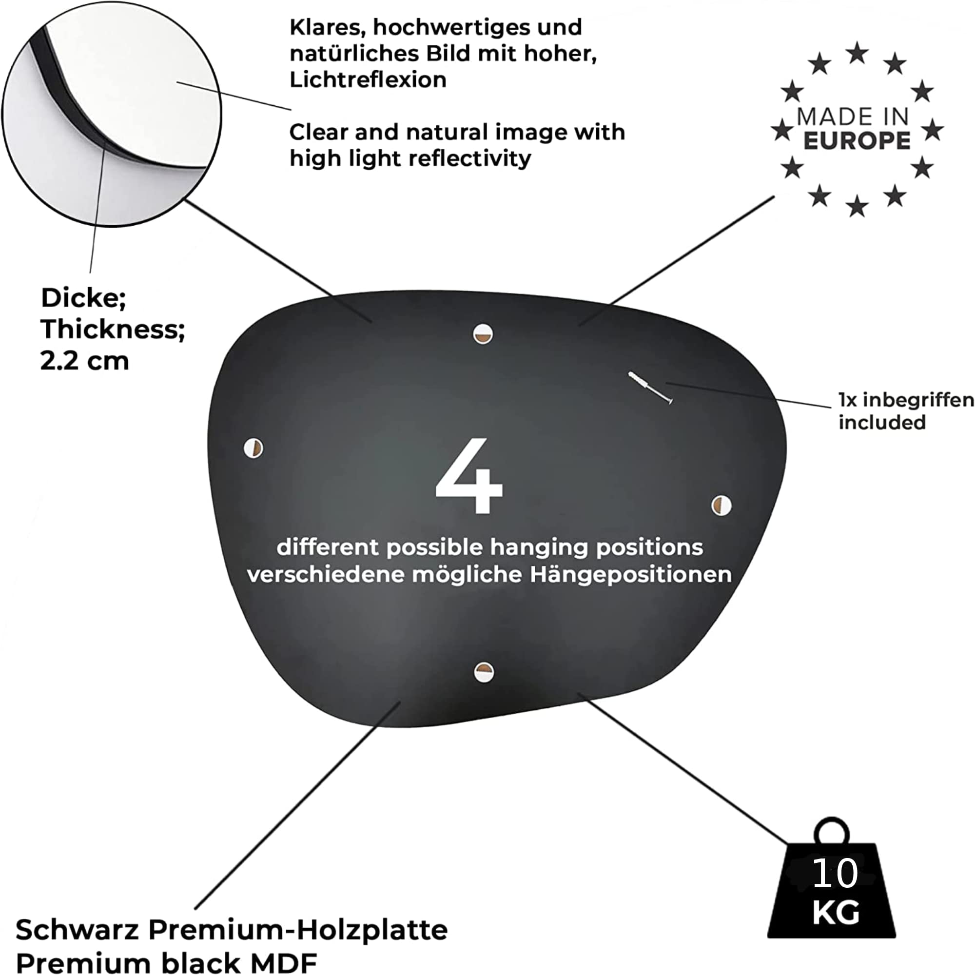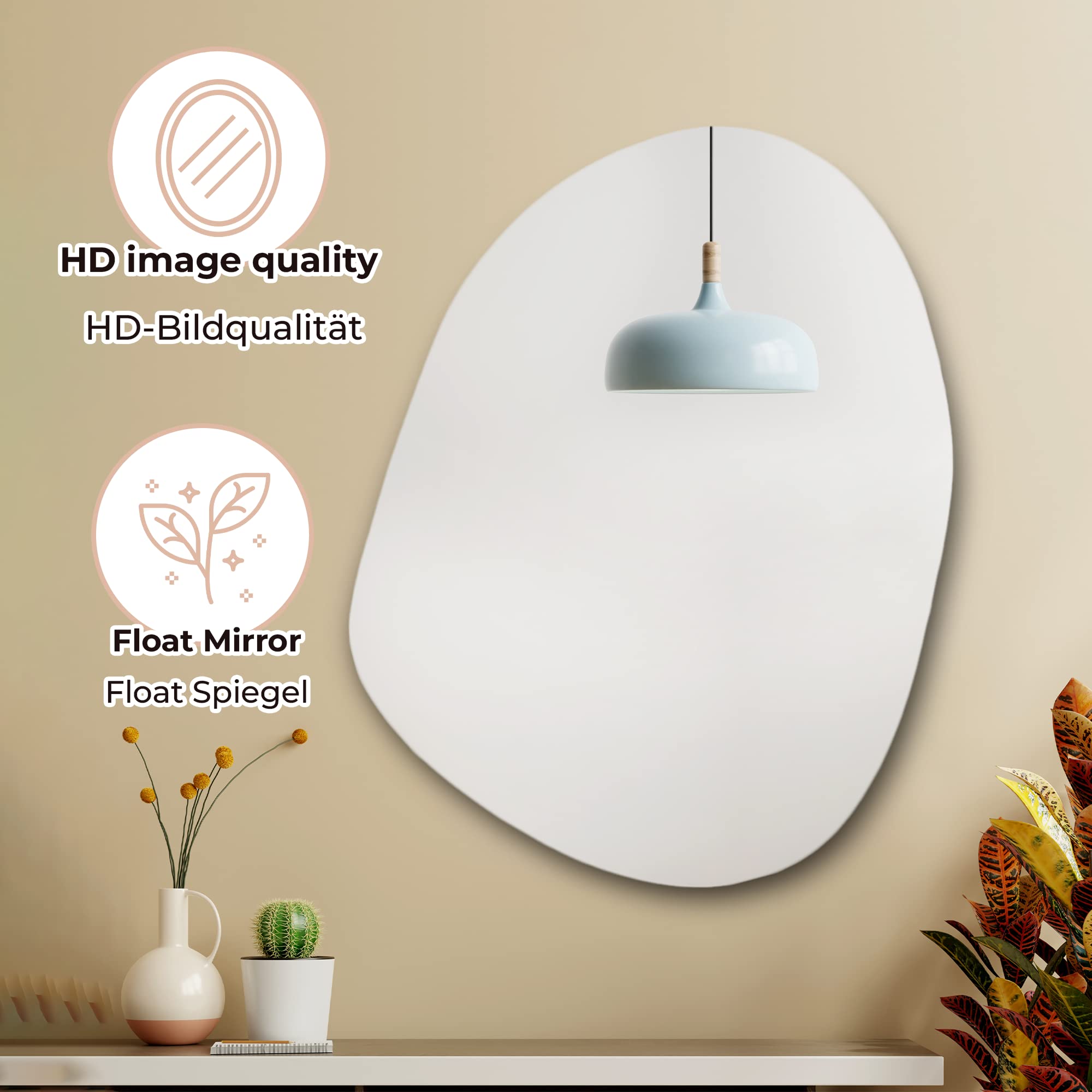 Der modische Wandspiegel lässt jeden Raum in Ihrem Haus etwas besonderer wirken. Das einzigartige Design ist nicht nur abwechslungsreich, sondern auch modern. Mit seiner runden Form sorgt der Spiegel für einzigartige Konturen. Das macht in zur perfekten Ergänzung im Eingangsbereich, über einem Sideboard oder frei platziert an der Wand. Als Ergebnis der Lichtreflexion im Spiegelglas ergibt sich ein klares und natürliches Bild. Das Spiegelglas ist auf einer schwarz lackierten Holzfaserplatte montiert. Die Kanten und die Platte sind miteinander verklebt, was einen nahtlosen Übergang der beiden Oberflächen ermöglicht. Diese simple Vorgehensweise sorgt für das randlose und dadurch so moderne Erscheinungsbild. Mit einer Gesamtgrösse von 75 x 55 cm und der asymmetrischen, geschwungenen Form macht sich der Spiegel in Räumen jeder Grösse als sehr gute Ergänzung. Sie können den Spiegel nach Belieben ausrichten und dank seines Designs zwischen vier verschiedenen Befestigungsmöglichkeiten wählen. Der Spiegel kann entweder stehend platziert oder an der Wand befestigt werden. Die 1 mitgelieferten Aufhänger zum Aufhängen an der Wand bieten sichern Halt. Gleichzeitig sind sie schnell und unkompliziert montiert. Alle benötigten Dübel und Schrauben sind im Lieferumfang enthalten. Das Design des Spiegels ist modern und zeitlos. Seine schlichte Optik fügt sich in jedem Raum gut ein und verlieht ihrem Zuhause das gewisse Etwas.
