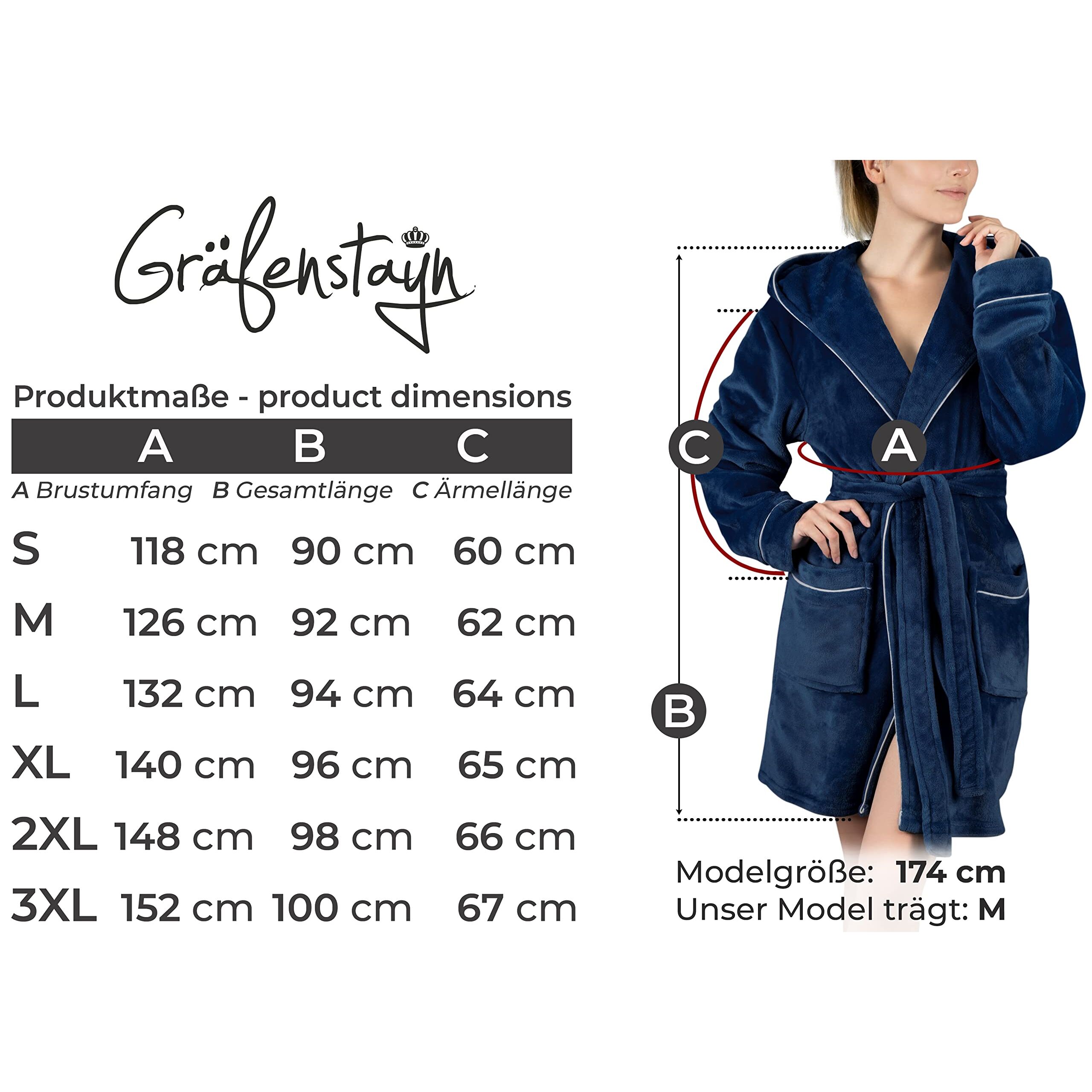 Gräfenstayn Bademantel Damen flauschig mit Kapuze - Kuschelfleece - Öko-Tex Standard 100 - Morgenmantel leicht & kurz - Grösse S - XXXL PREMIUM QUALITÄT: -Der stilvolle Bademantel für Frauen besteht aus hochwertigem Flanell-Fleece. Flanell-Fleece trocknet schnell, ist sehr leicht, temperaturausgleichend und dabei angenehm weich auf der Haut ÖKOTEX ZERTIFIZIERT: -Die Bademäntel sind mit dem ÖKO-TEX Siegel STANDARD 100 - Geprüftes Vertrauen - (06.RA.44916 Hohenstein HTTI) ausgezeichnet. Über 100 Prüfkriterien gewährleisten die gesundheitliche Unbedenklichkeit der Materialien" ELEGANTER LOOK: -Die eingefassten, weissen Paspeln am Kragen, den Taschen und den Ärmeln verleihen dem Morgenmantel ein exklusives und einmaliges Aussehen! Somit der perfekte Begleiter auf Reisen, beim Wellness-Urlaub, in der Sauna oder als Hausmantel DETAILS: -Der Hausmantel besticht durch einen knieumspielenden Schnitt, einer grosszügigen, doppellagigen Kapuze, aufgesetzte Taschen und Gürtelschlaufen PFLEGE: -Durch die pflegeleichte Qualität aus 100% Polyester ist eine Maschinenwäsche bei 40° möglich, trocknergeeignet und bügelfrei!