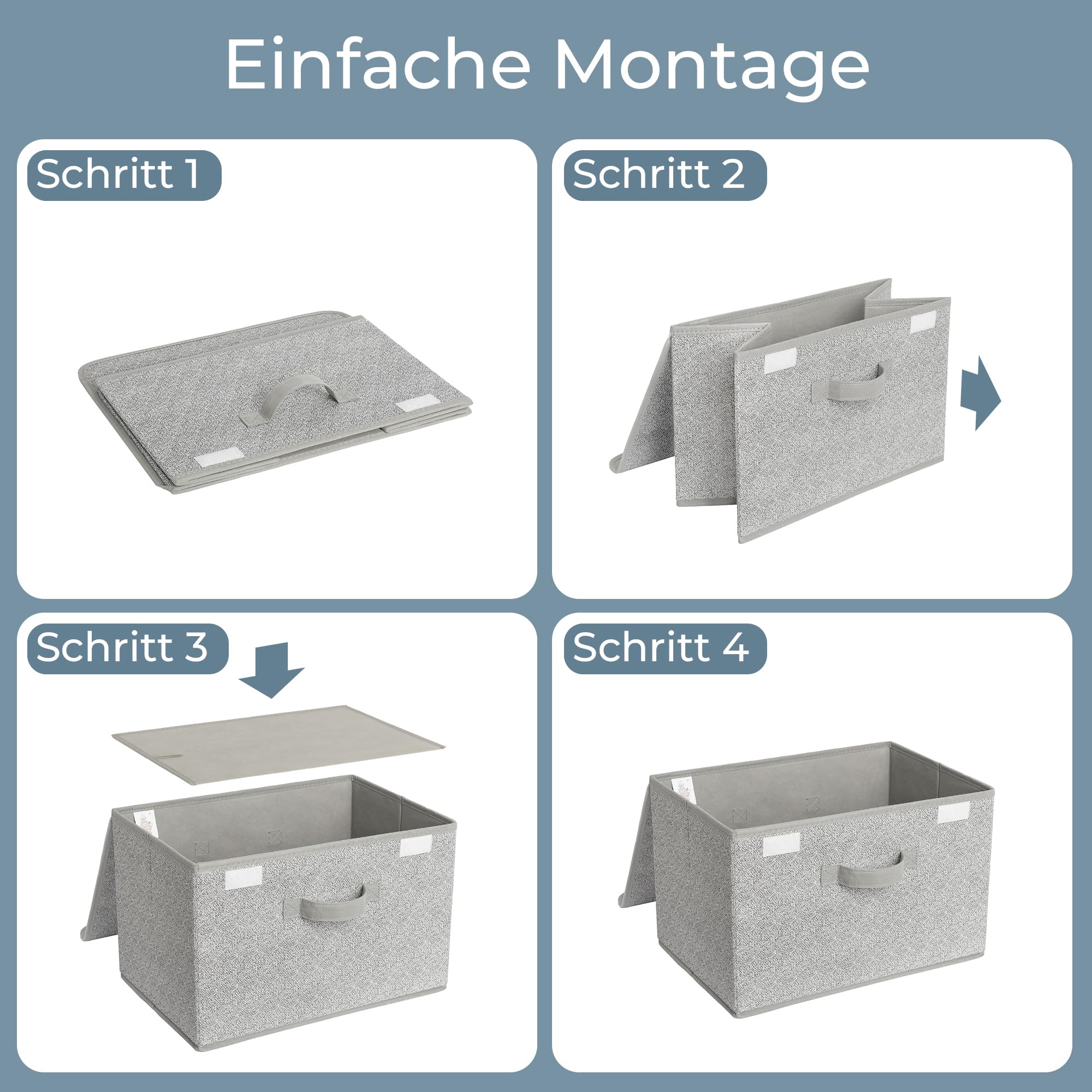 Hochfeste Materialien - Diese Faltbox aus verdicktem Vliesstoff ist an allen Seiten und am Boden mit PP-Pappe verstärkt, was für zusätzliche Festigkeit, Haltbarkeit und Stapelbarkeit sorgt. Ausserdem sind diese Faltboxen leicht zu reinigen mit einem feuchten Tuch ab.