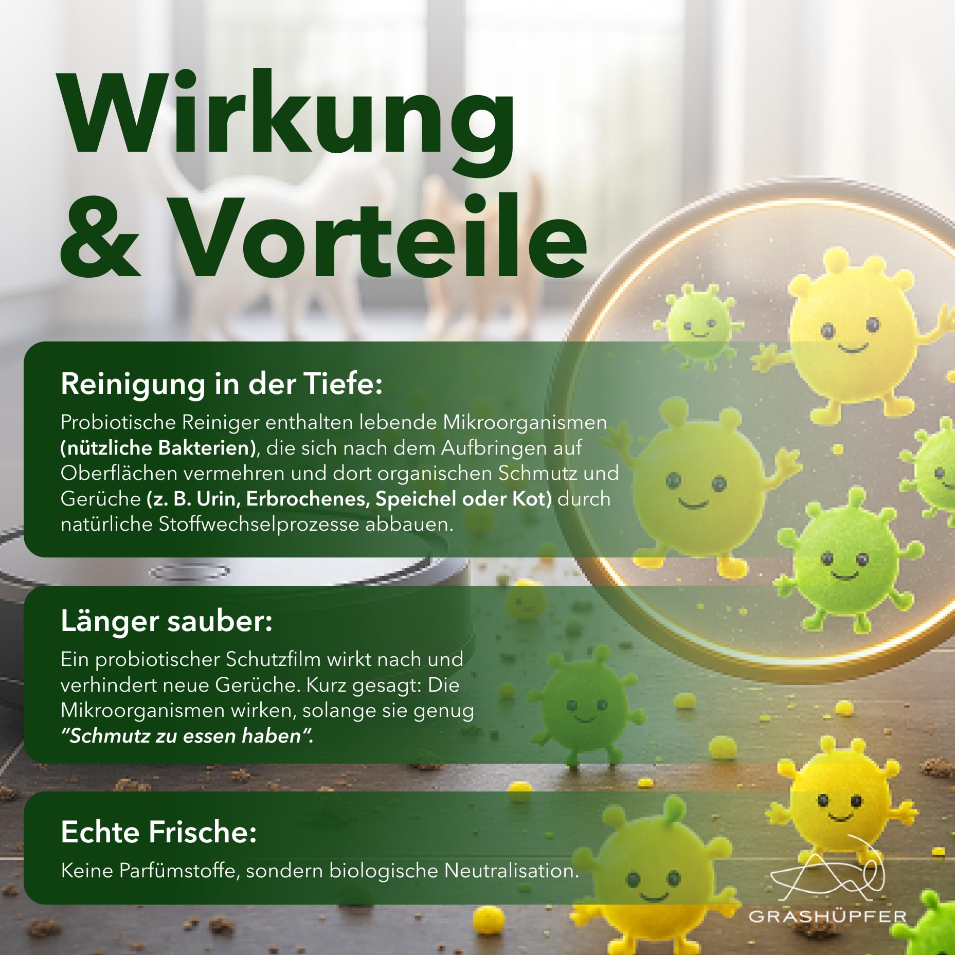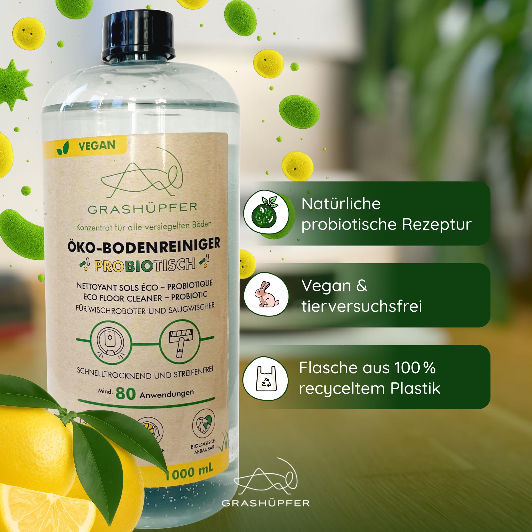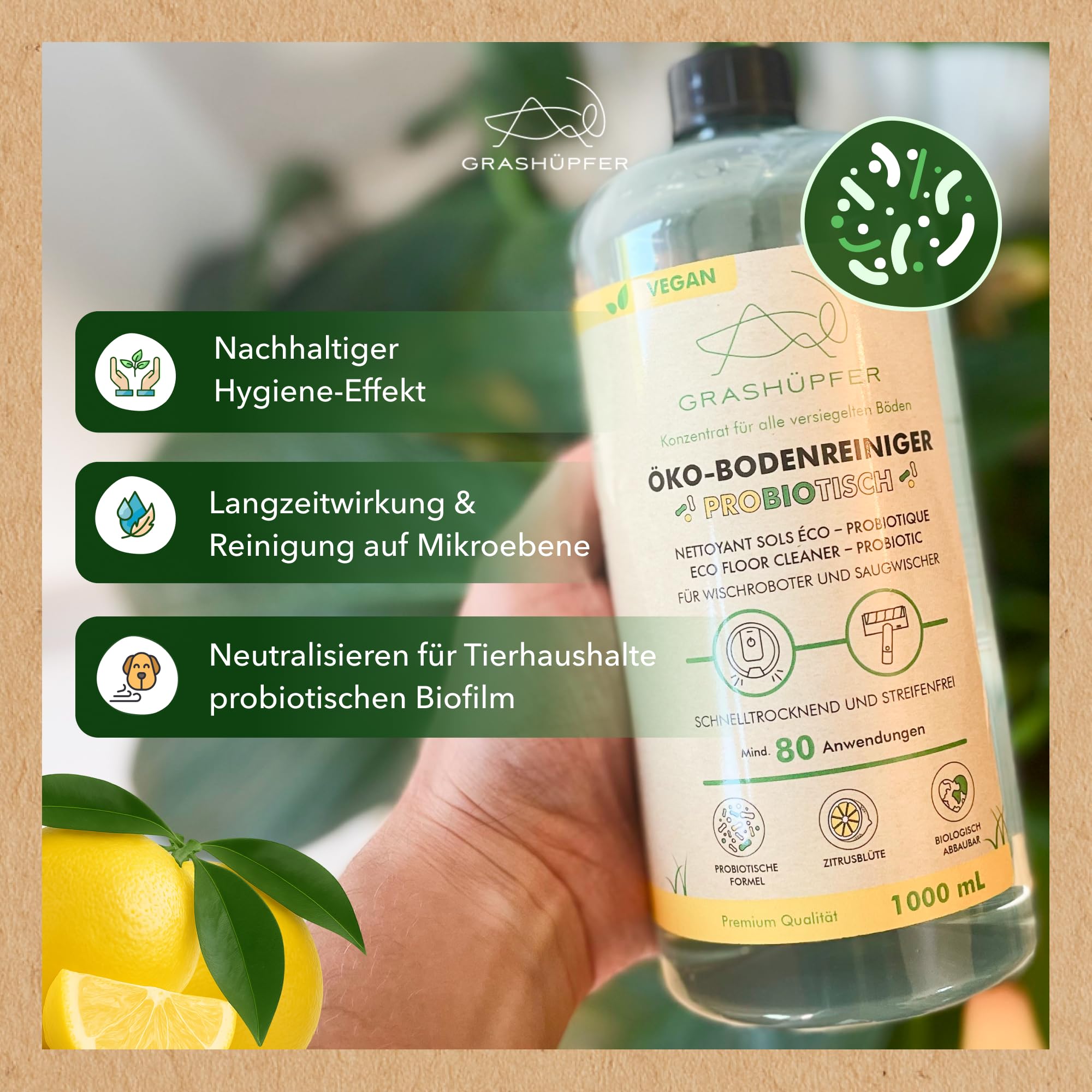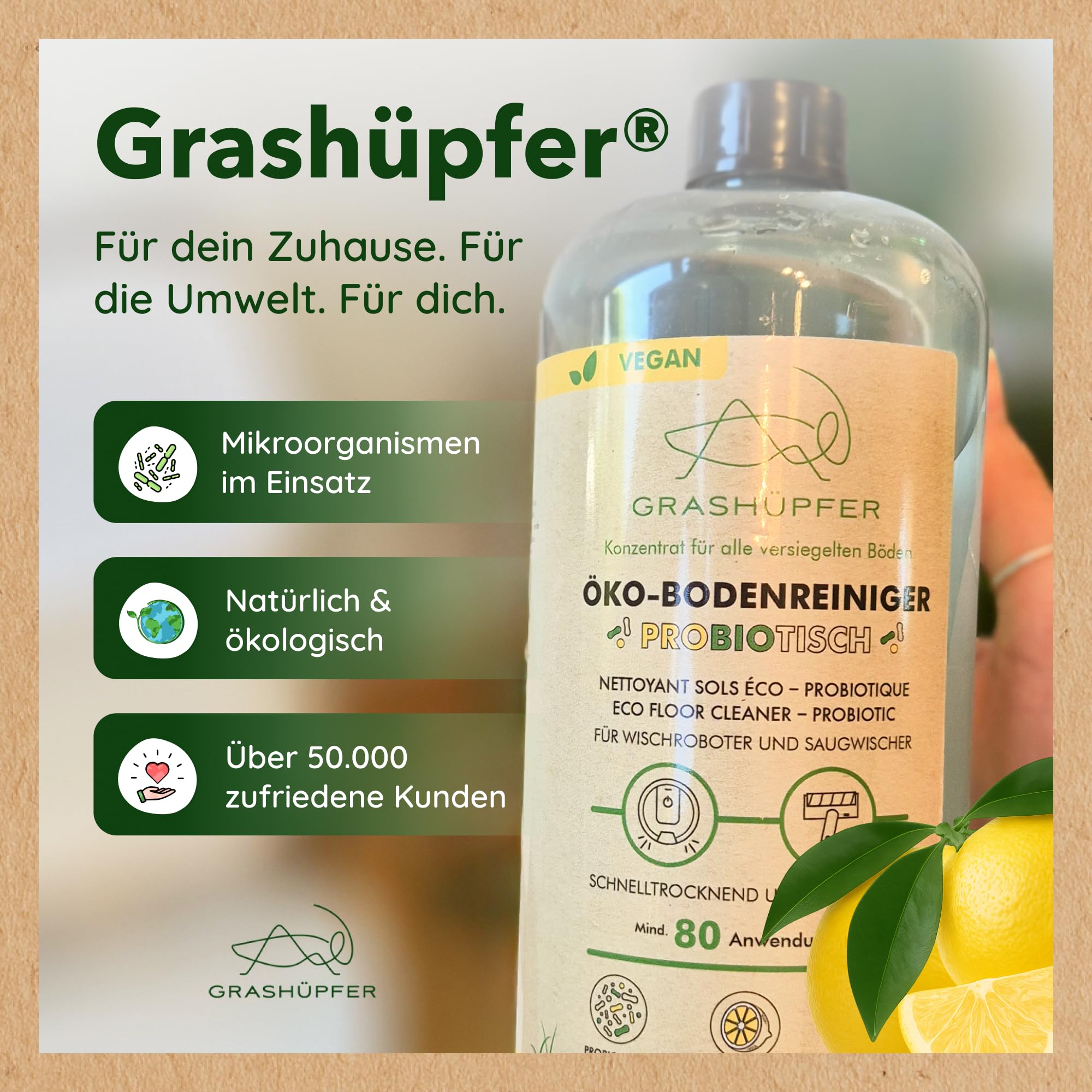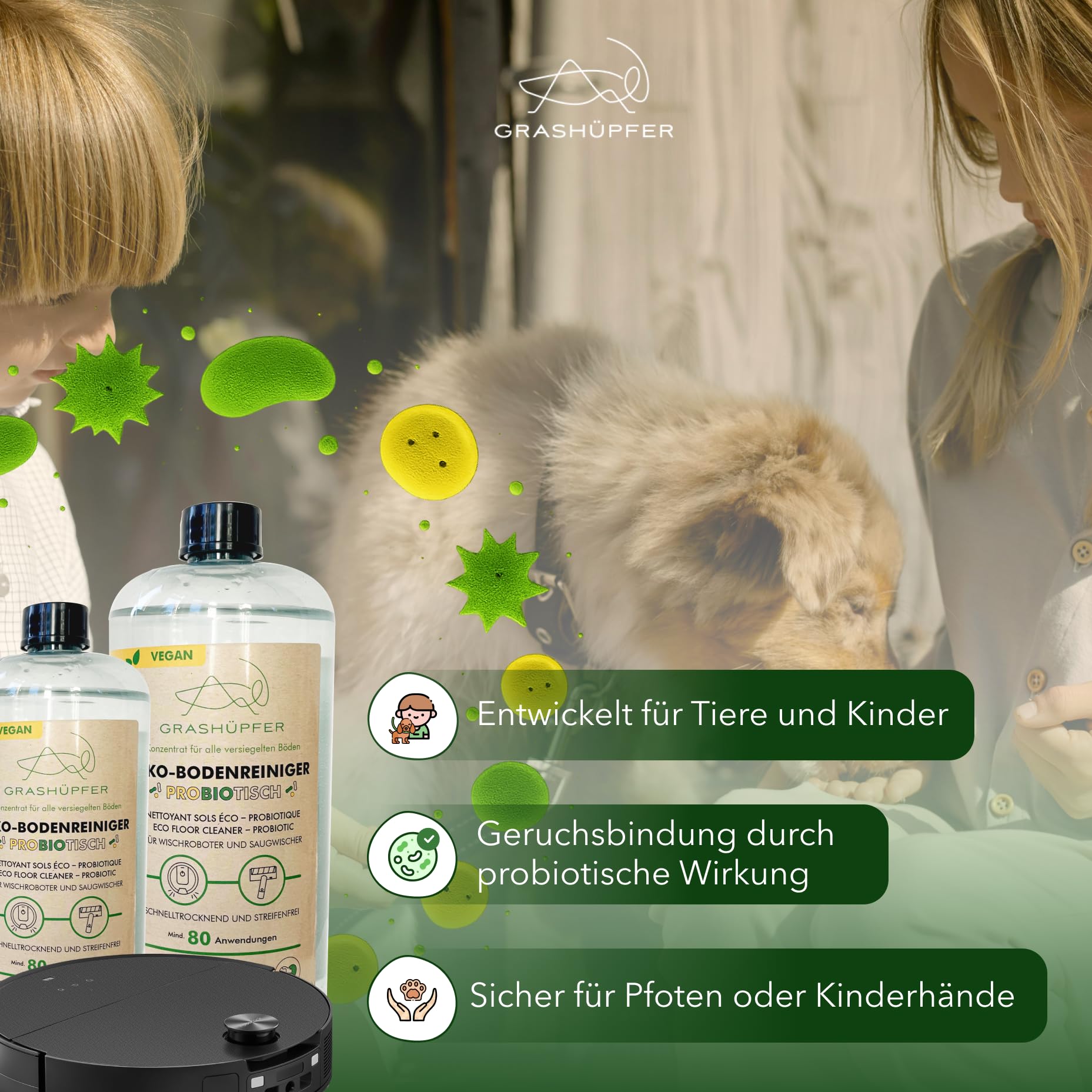 GRASHÜPFER® Probiotischer Öko Wischroboter Reiniger [FÜR TIERHAUSHALTE] – reinigt und entfernt Tiergerüche biologisch, für Wischroboter und Saugwischer, sicher für Haustiere & Kinder - 1000 ml