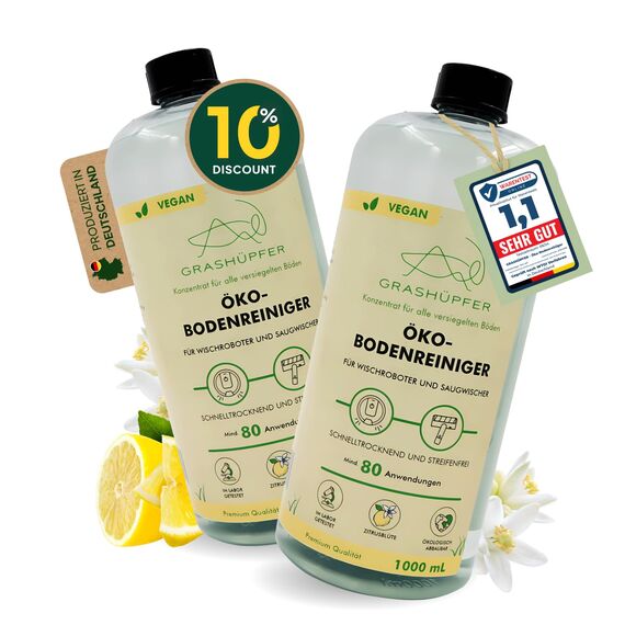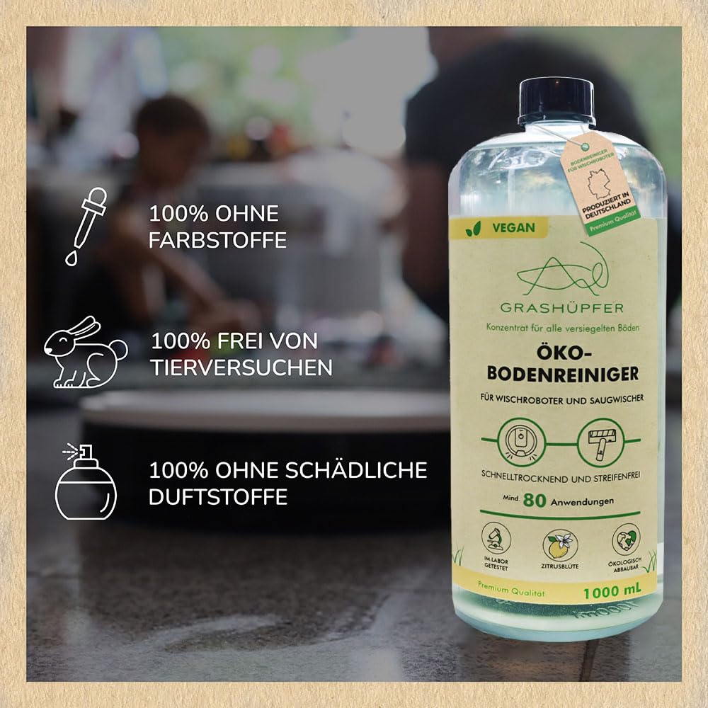 Der Grashüpfer Öko-Bodenreiniger ist ein hochwertiger, umweltfreundlicher Bodenreiniger, der speziell für die Verwendung mit Wischrobotern und Saugwischern entwickelt wurde. Mit seiner schaumarmen, schnell trocknenden Formel eignet er sich ideal für alle wasserfesten Bodenarten wie Fliesen, Laminat, Parkett, Vinyl oder PVC. Das Konzentrat ist besonders ergiebig – 1 Liter reicht für bis zu 80 Anwendungen bei einer empfohlenen Verdünnung von 1:100. Der Reiniger ist frei von Farbstoffen, vegan, tierversuchsfrei und biologisch abbaubar – ideal für Haushalte mit Kindern oder Haustieren. Die angenehmen Duftnoten tropischer Früchte oder frischer Zitrusblüte sorgen zusätzlich für ein sauberes und frisches Raumgefühl. Der Grashüpfer Öko-Bodenreiniger ist Teil der nachhaltigen Grashüpfer-Reinigungsserie und wird klimaneutral in Deutschland hergestellt. Für alle, die Wert auf effektive Reinigung und Umweltschutz legen – eine zuverlässige, grüne Lösung für moderne Haushalte.