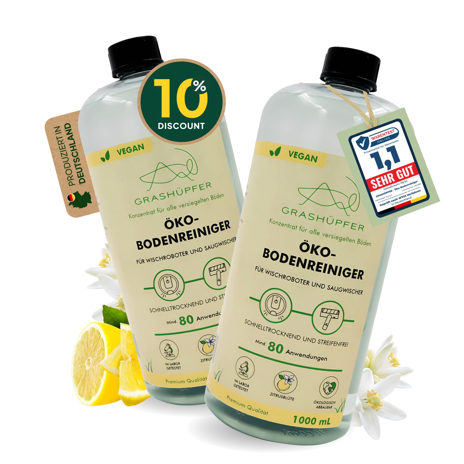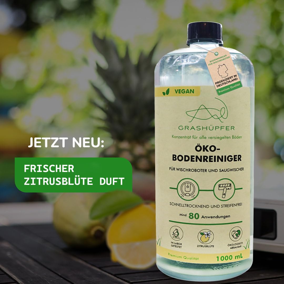 2er Set GRASHÜPFER® Öko Bodenreiniger für Wischroboter [ZITRUSBLÜTE] - Wischroboter und Akkuwischsauger Reiniger kompatibel mit Roborock, Dreame, Ecovacs & Co. für alle Böden - 2x1000 ml