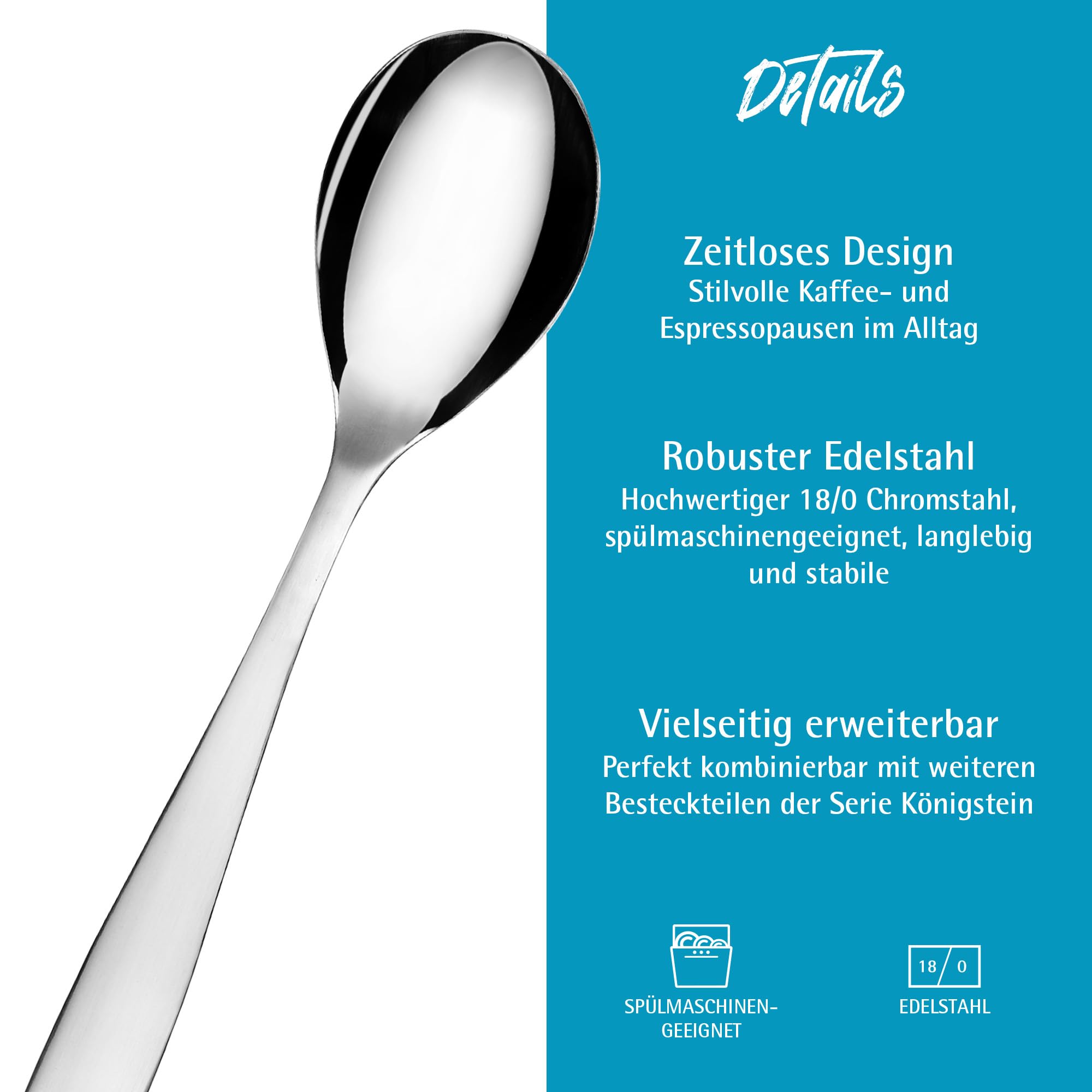 Die kleinen Teelöffel mit einer Länge von ca. 10,5 cm sind aus robustem Edelstahl (18 % Chromstahl) gefertigt und damit besonders langlebig sowie formstabil. Die sorgfältige Politur sorgt für ein glänzendes Finish, das sich harmonisch in jede Tischdekoration einfügt ganz gleich, ob klassisch, modern oder rustikal. Dank der nickelfreien Legierung sind die Löffel auch für Allergiker bestens geeignet.