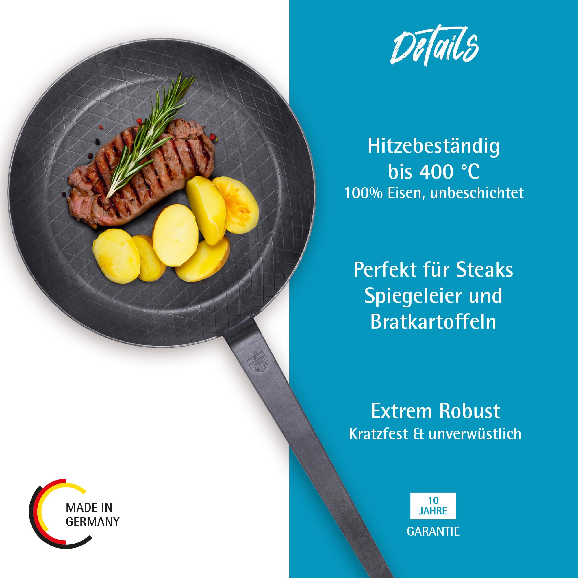 + Inklusive Edelstahl-Pfannenwender und ausführlicher Gebrauchs- und Pflegeanleitung zum Einbraten