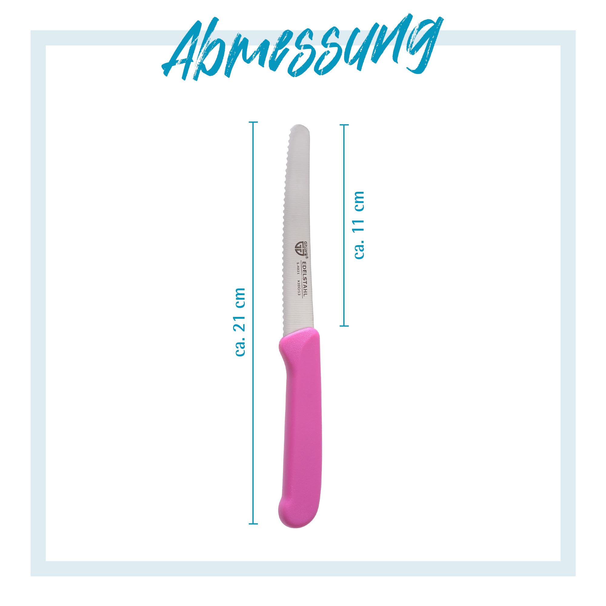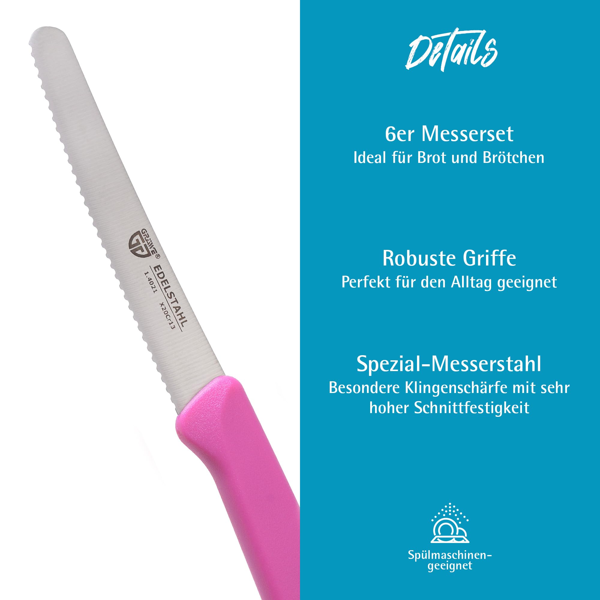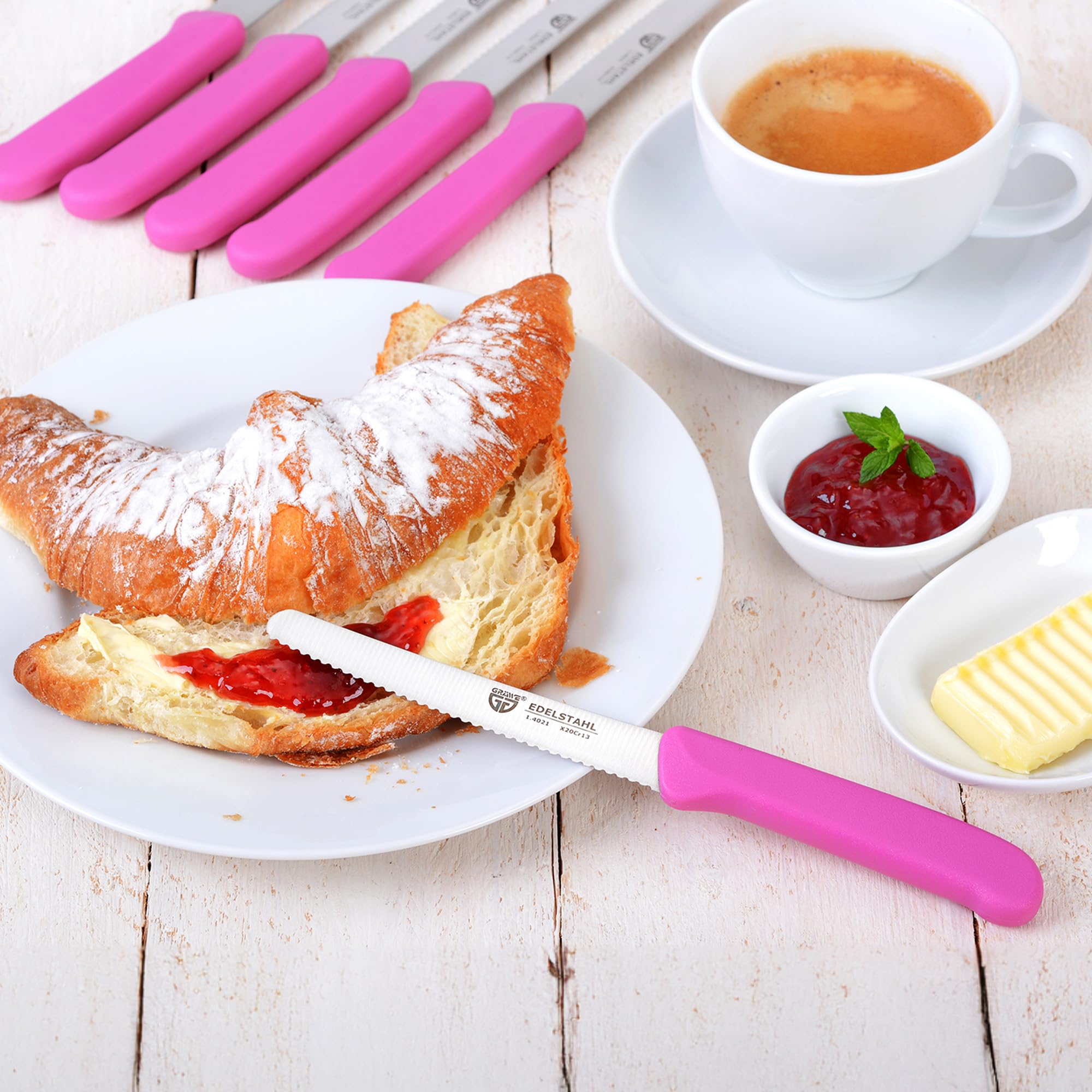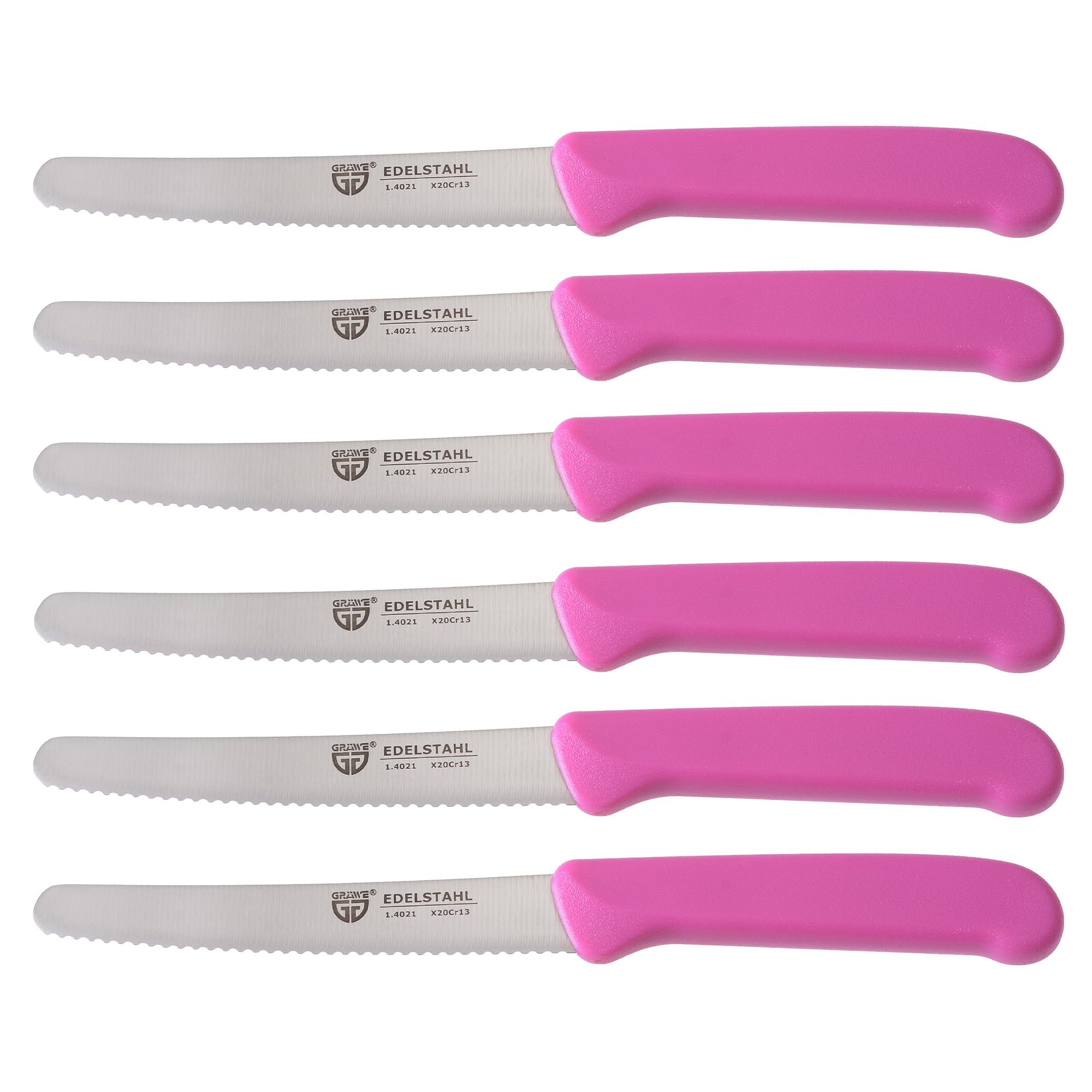GRÄWE Tafelmesser 6 Stück, Messerset zum Schneiden, 6er Pack Brötchenmesser, Frühstücksmesser mit einseitigem Wellenschliff, Brotmesser, scharfe Messer für Brotzeit, 21 cm - Pink