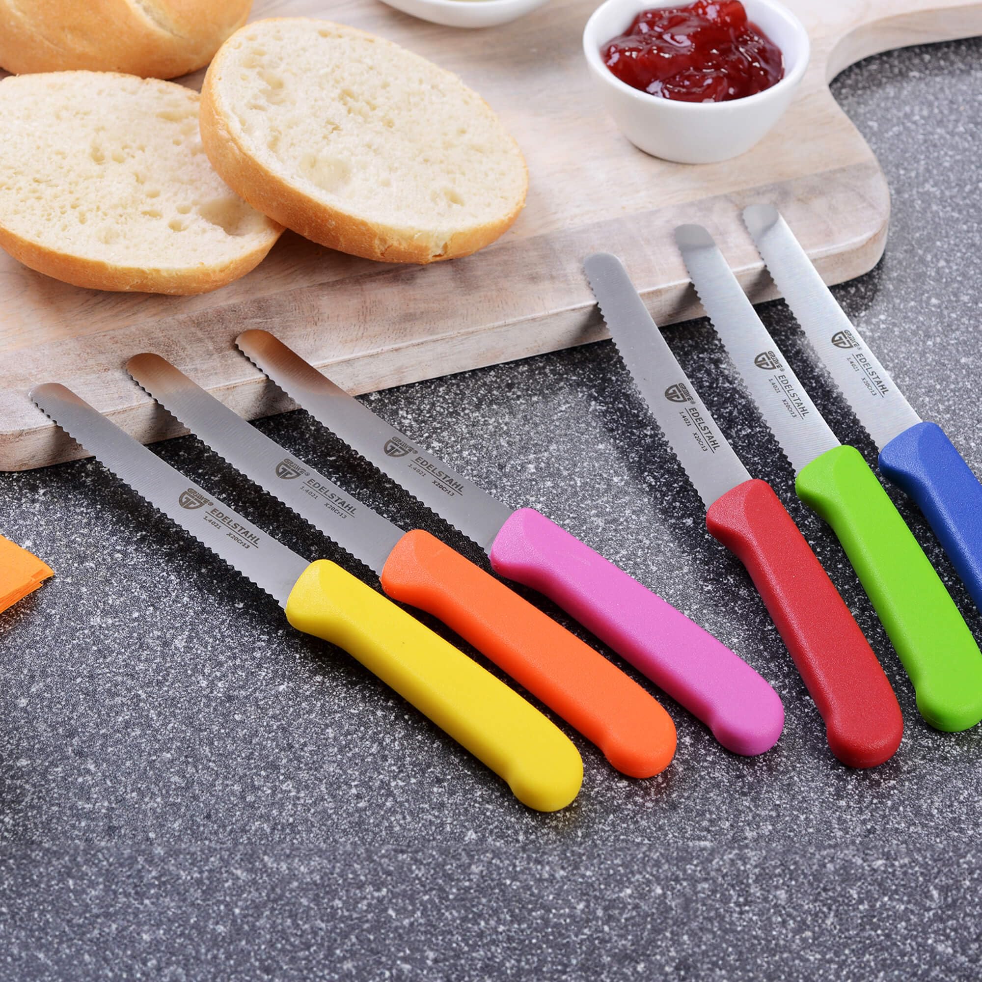GRÄWE Tafelmesser 12 Stück, Messerset zum Schneiden, 12er Pack Brötchenmesser, Frühstücksmesser mit einseitigem Wellenschliff, Brotmesser, scharfe Messer für Brotzeit, 21 cm - Bunt