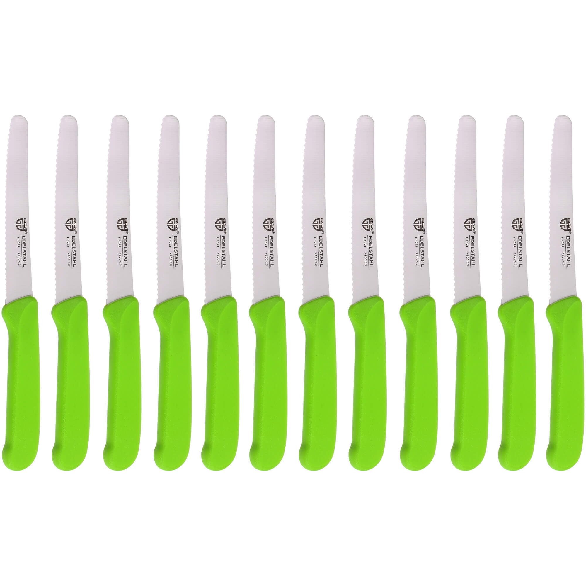 GRÄWE Tafelmesser 12 Stück, Messerset zum Schneiden, 12er Pack Brötchenmesser, Frühstücksmesser mit einseitigem Wellenschliff, Brotmesser, scharfe Messer für Brotzeit, 21 cm - Grün