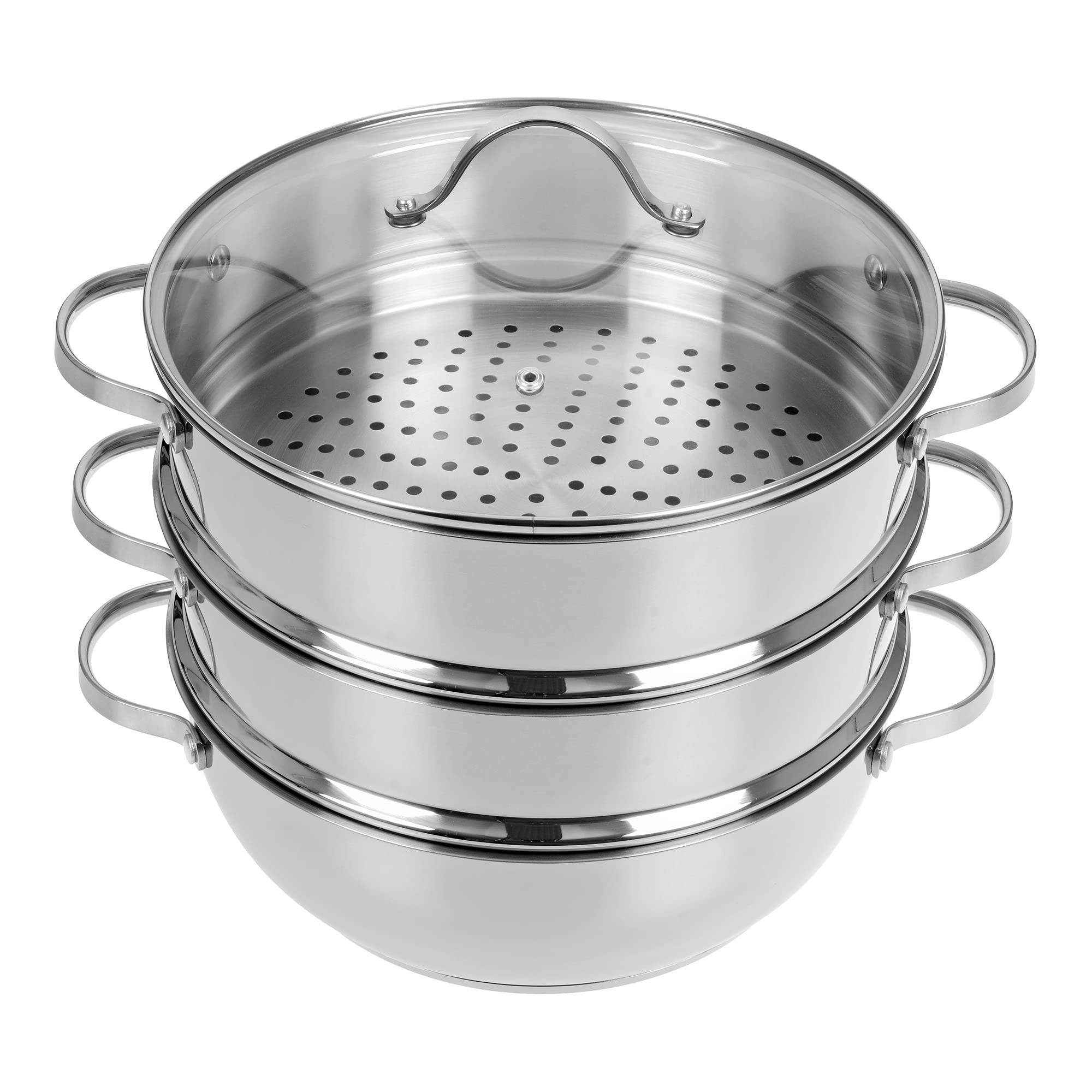 Entdecken Sie mit dem GRÄWE Pro-Line Topf einen vielseitigen Küchenhelfer, der Ihre Kochkünste erweitert. Sein grosszügiger Durchmesser von 28 cm macht ihn ideal zum Dämpfen, Braten und für zahlreiche kulinarische Kreationen. Hergestellt aus hochwertigem Edelstahl 18/10, bietet diese Kasserolle mit ihrem Thermokapselboden aus Aluminium und verchromtem Stahl eine hervorragende Wärmeverteilung. Die beiden mitgelieferten Dampfgar-Einsätze eröffnen Möglichkeiten zum Dampfgaren von Gemüse und Kartoffeln sowie zahlreiche Dampfgar-Varianten. Der Deckel aus gehärtetem Glas mit Edelstahlring und speziellem Dampfauslass sorgt für eine präzise Kontrolle des Kochvorgangs. Mit gebürsteter Innen- und polierter Aussenseite ist der Topf spülmaschinengeeignet und für Induktion geeignet, für müheloses Reinigen und maximale Kompatibilität in der Küche. Mit einem grosszügigen Durchmesser von etwa 28 cm oben, etwa 22 cm unten und einer Höhe von etwa 9 cm bietet der Topf ausreichend Platz für Ihre kulinarischen Meisterwerke. Der Dampfkorb rundet dies mit einem Durchmesser von ca. 28 cm und einer Höhe von ca. 8,5 cm / 3,8 Zoll ab. Das Set enthält 1 Topf, 2 Dampfeinsätze und 1 Glasdeckel. Qualität, Vielseitigkeit und einfache Handhabung machen die GRÄWE Pro-Line Kasserolle mit Dampfkorb und Glasdeckel zu einem unverzichtbaren Begleiter in jeder Küche für leidenschaftliche Köche und Kochliebhaber. Masse: Topf: Durchmesser oben: ca. 28 cm - Durchmesser unten: ca. 22 cm - Höhe: ca. 9 cm. Dampfeinsatz: ca. 28 cm - Höhe: ca. 8,5 cm. Gesamtgewicht: ca. 3,5 kg