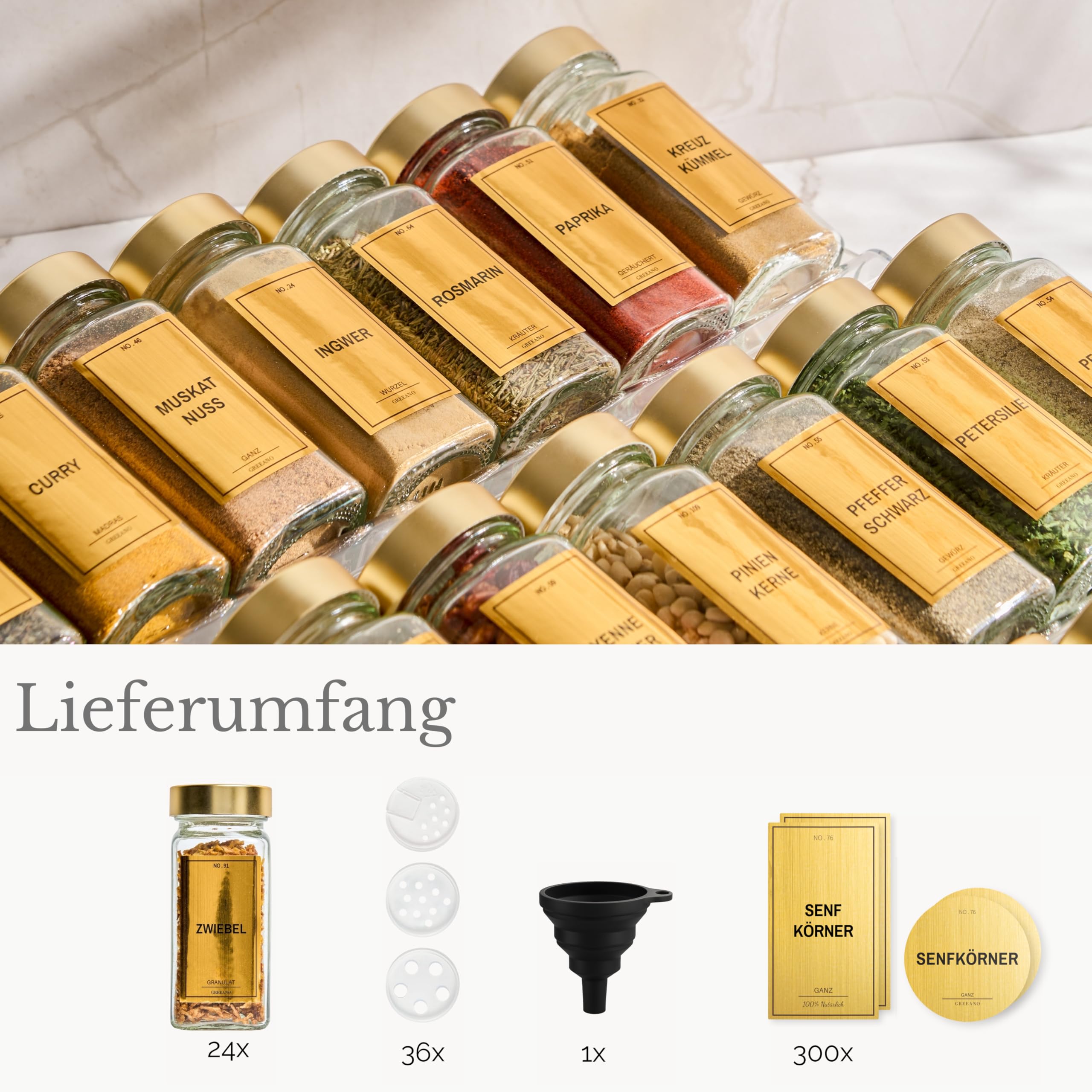 Greeano Gewürzgläser Set [24 x 120ml] mit 300 Gewürzetiketten [DE] - Gewürze Aufbewahrung mit Streueinsatz - Gewürzdosen Glas - Gewürzbehälter Glas - Gewürz Organizer - Spice Jars Gold