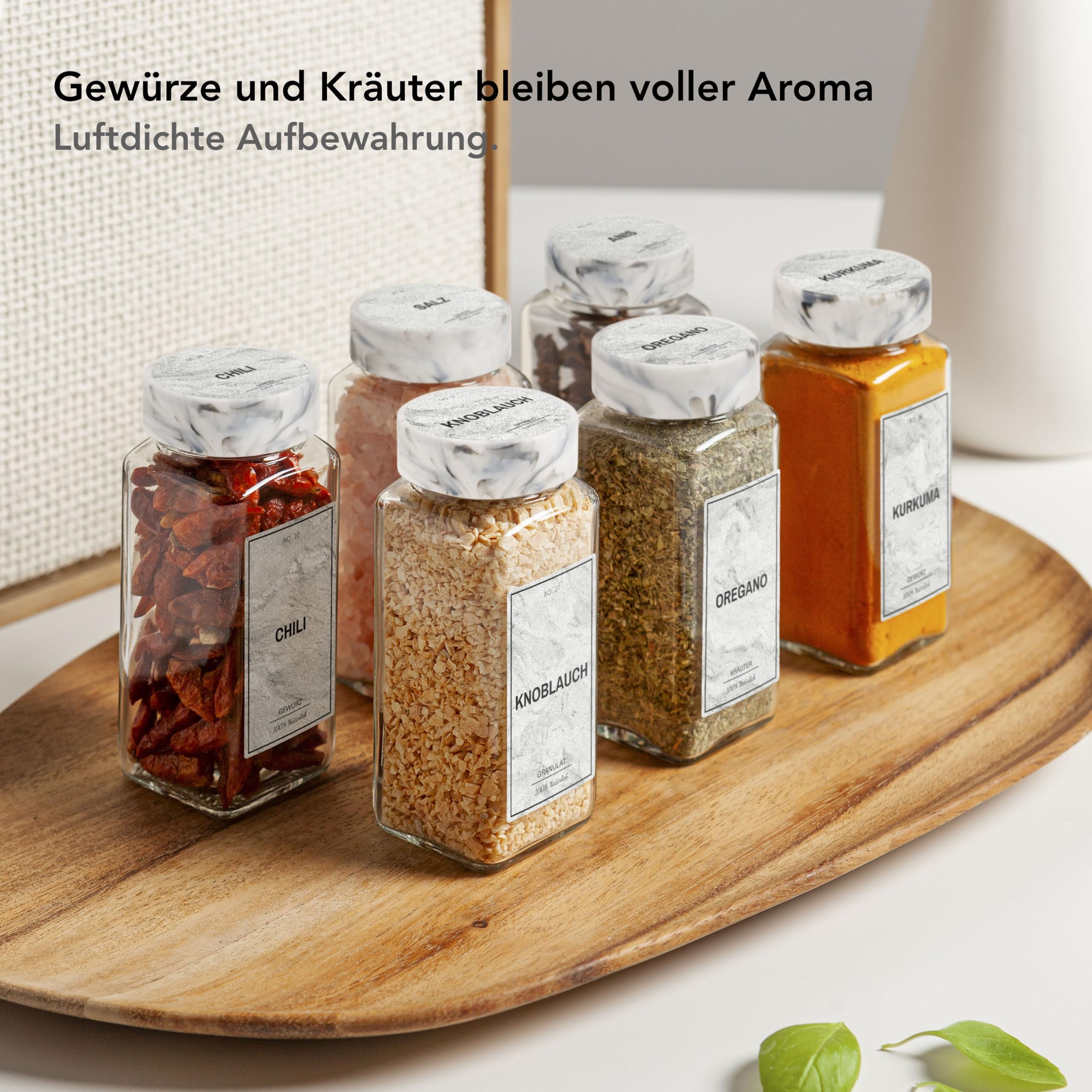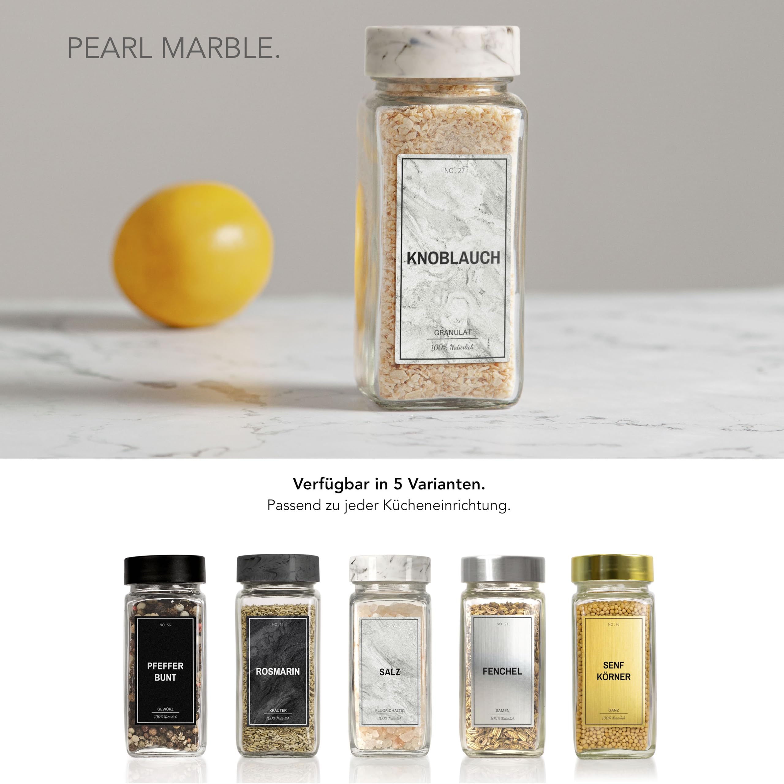 Greeano Mamor Weiss Gewürzgläser Set [24 x 120ml] mit 300 Gewürzetiketten [DE] - Gewürzgläser eckig mit Streueinsatz - Gewürzdosen Set - Gewürzbehälter Glas - mit Streueinsatz