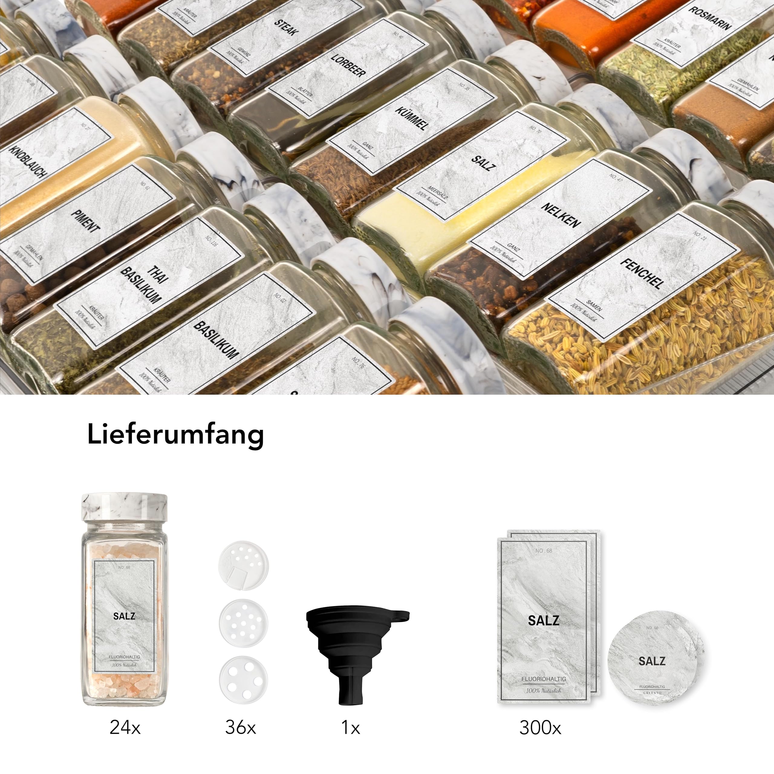 KOMPLETTES GEWÜRZGLÄSER SET – 24 hochwertige Gewürzgläser zum Befüllen. Die Gewuerzglaeser mit Deckel kommen mit 300 wasserfesten Gewürzetiketten [DE] im minimalistischen Design, einem Stift, 48 Streueinsätzen, und einem Trichter. Wir senden unser Set in einer schönen & bruchsicheren Verpackung zu dir. ORDNUNG IN DER KÜCHE – Unser (24 x 120ml) Gewürzstreuer set (DE) dient nicht nur der Ordnung, sondern kann auch auf deinem Gewürzregal, Küchenschrank oder in deiner Gewürzschublade dekorativ in Szene gesetzt werden. LUFTDICHTE GEWÜRZAUFBEWAHRUNG – Volles Aroma statt verklumpten Gewürzen! Unsere Gewürzgläser mit Deckel sind dank dem Drehverschluss luftdicht / wasserdicht. Zudem ist das Set Spülmaschinen fest. Optimal als Gewuerzdosen Set geeignet. ROBUSTES GLAS – Unser Gewürzbehälter Set wird mit grosser Sorgfalt und Liebe hergestellt. Unsere Gewürzgläser bestehen aus sehr bruchsicherem Glas, sind BPA-frei und lebensmittelecht. Weiterer Vorteil: Eckige Gewürzgläser können optimal aneinandergereiht werden, somit nutzen sie ihren Platz nicht nur dekorativ, sondern auch effizient. SO MACHT KOCHEN FREUDE – Für eine ideale Portionierung deiner Gewürze kommt jedes Gewürzdosen Glas Set mit 24 Streueinsätze für feine und 24 Streueinsätze für grobe Gewürze. Ausserdem liegt ein faltbarer Küchentrichter zum einfachen Befüllen der Gewürz Glasbehälter bei.