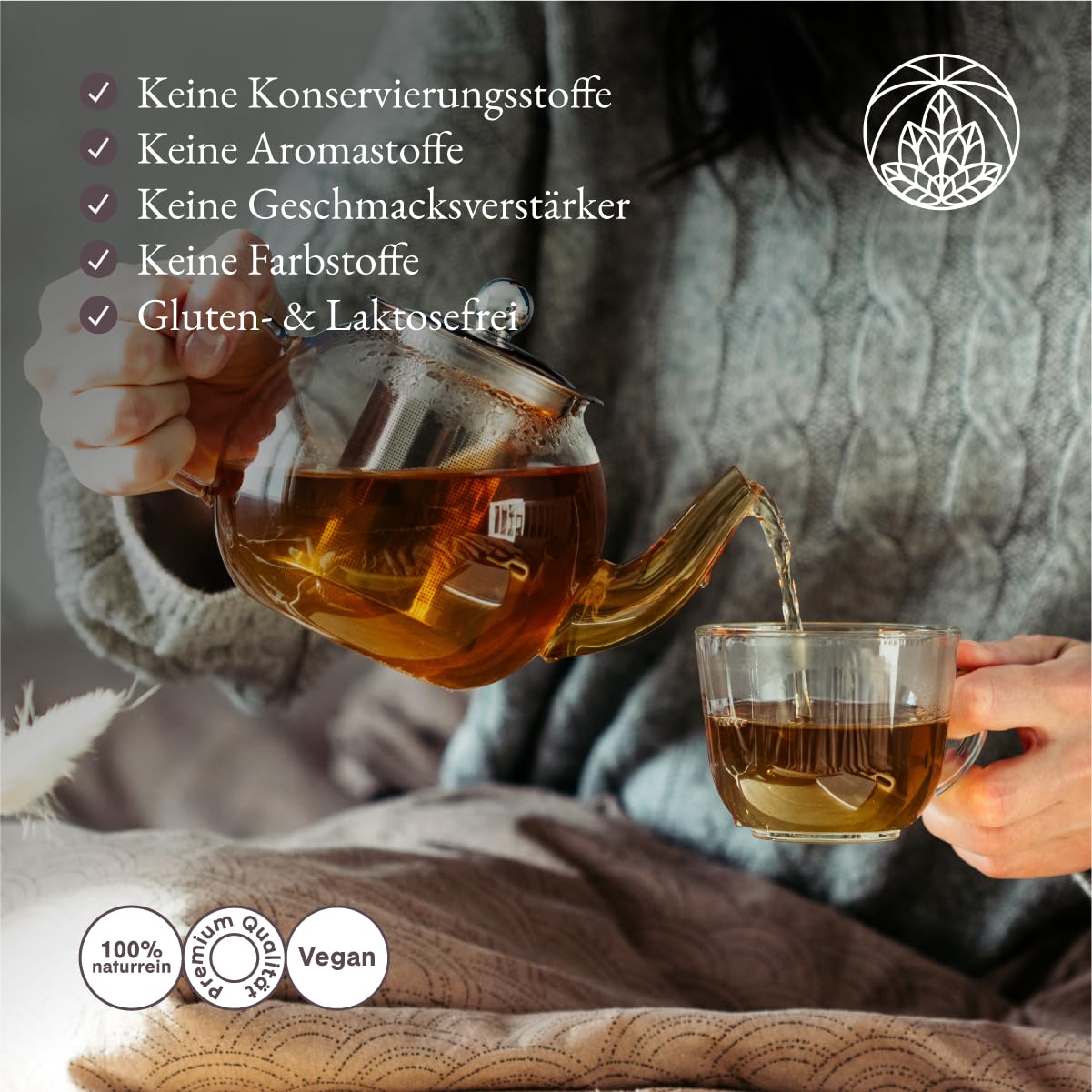 • Grosse Packung mit Wiederverschluss – durchdacht & umweltbewusst – Unsere Verpackung ist praktisch, minimalistisch und wiederverschliessbar – damit dein Tee lange frisch bleibt und wir gleichzeitig unnötige Materialien vermeiden.
