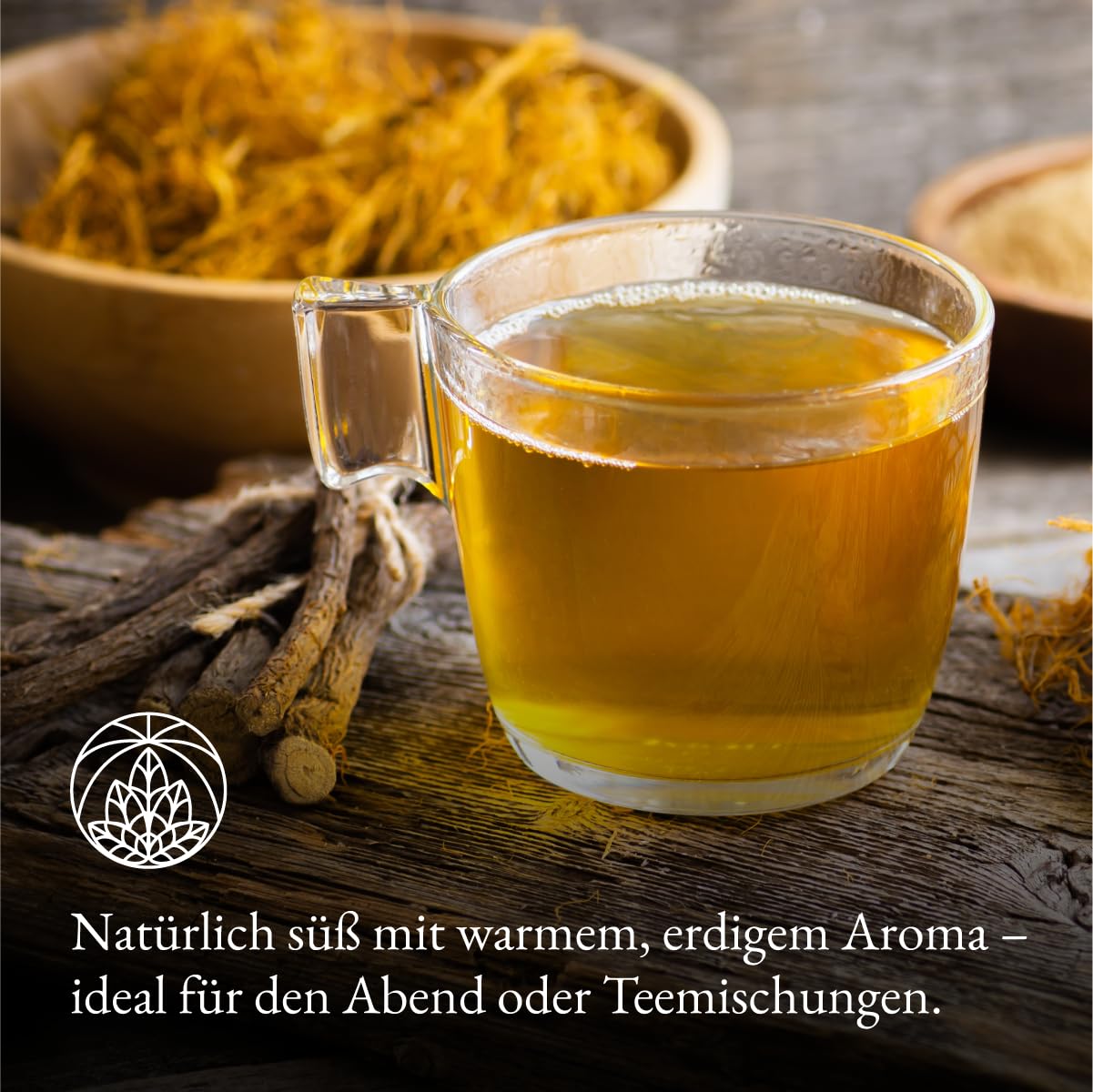 • Aromatisch & voller Geschmack – Bekannt für sein tiefes, reiches Aroma und die charakteristische Süsse, bietet Süssholzwurzeltee einen weichen, erdigen Geschmack, der angenehm auf der Zunge bleibt. Ob pur oder in Kombination mit anderen Kräutern – diese wohltuende Infusion ist wärmend, befriedigend und rundum genussvoll – ideal für jede Tageszeit.