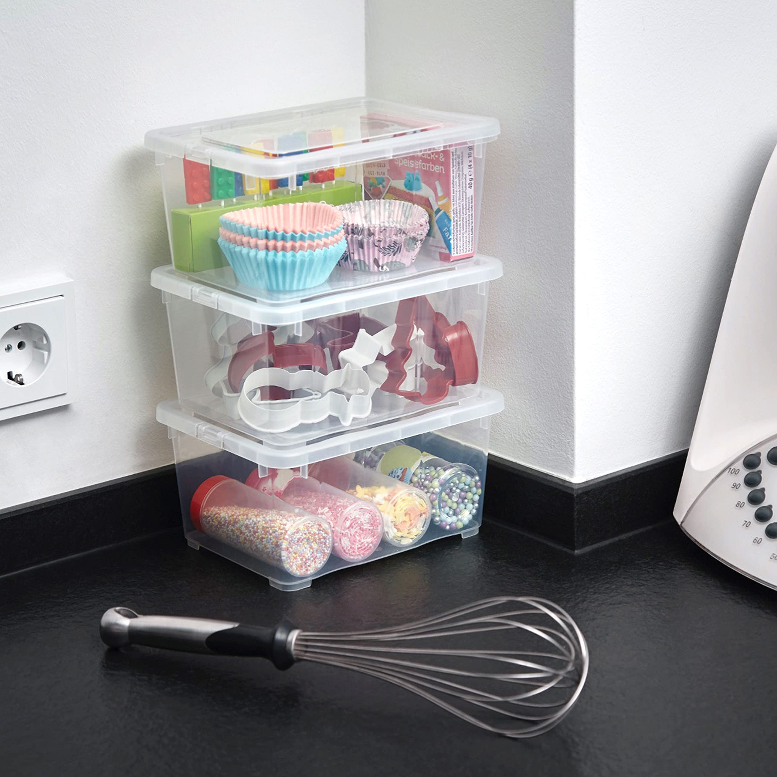 Bewahren Sie Ihre Sachen einfach auf und schützen Sie Ihre Sachen mit diesem Set aus 12 Aufbewahrungsboxen aus Kunststoff mit Deckel.