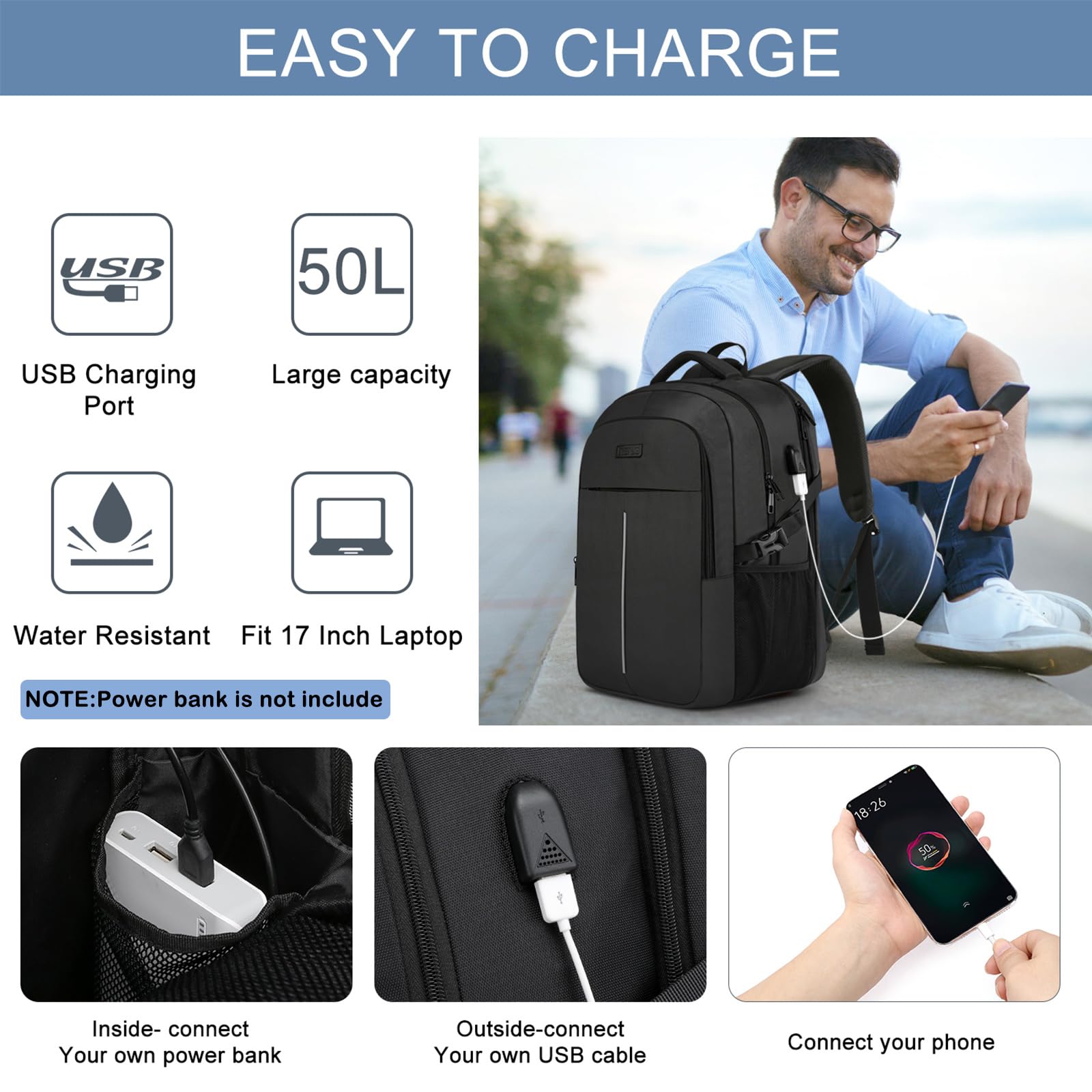 Gross Herren Laptop Rucksack 17 Zoll Laptoptasche für Schule Arbeit mit USB Ladeanschluss Wasserdicht Business Reisen Notebook Tasche Schulrucksack für Männer Frauen Jungen Teenager Schwarz