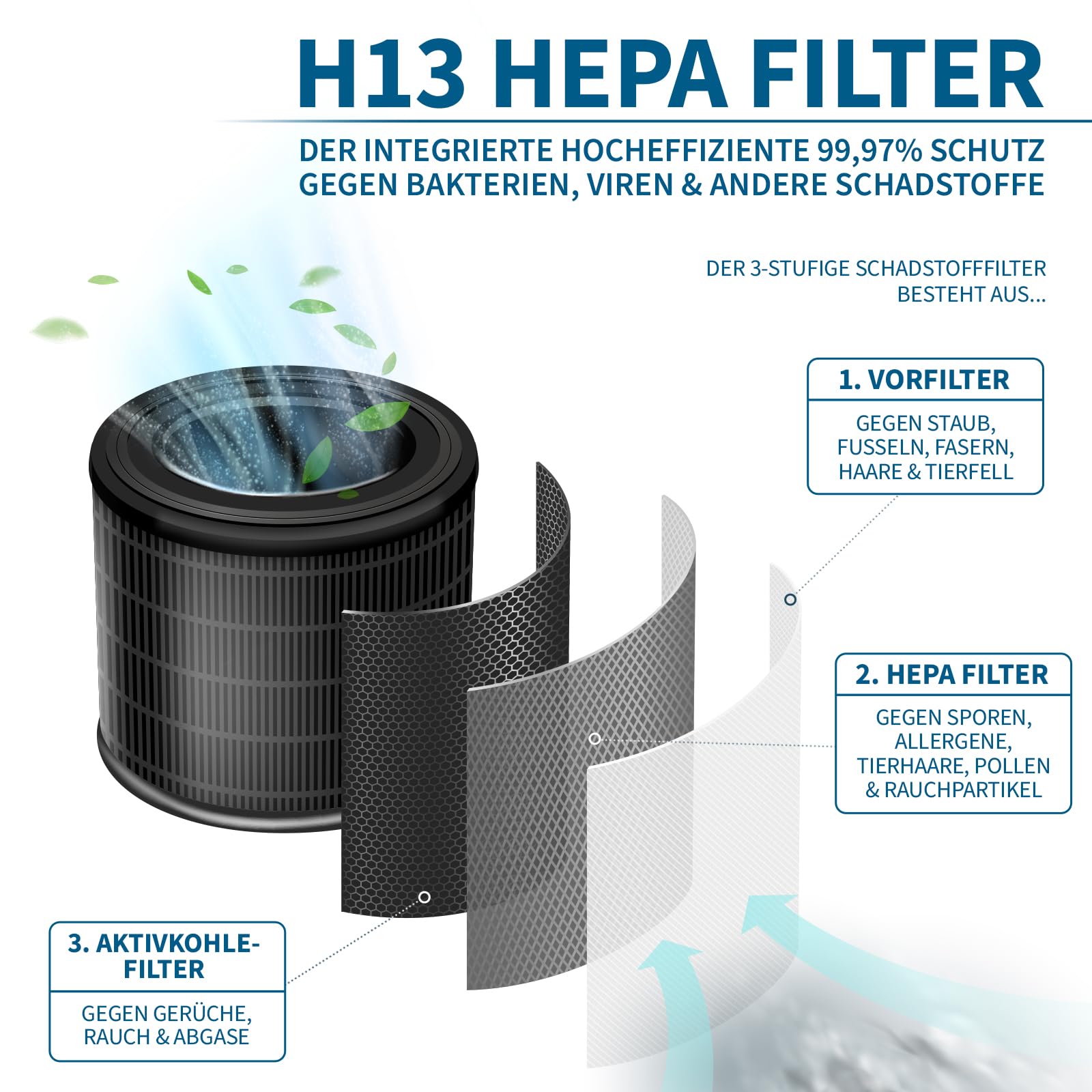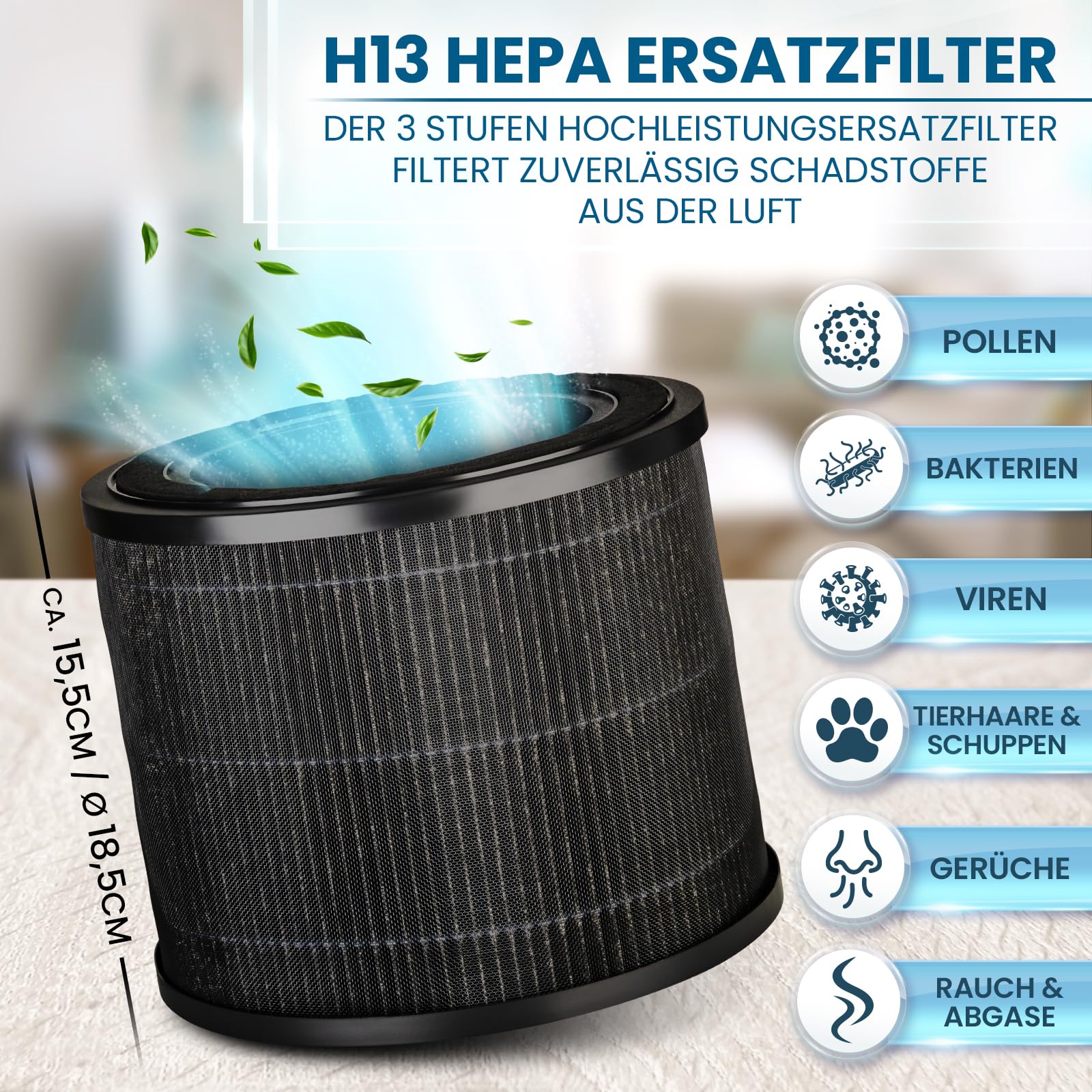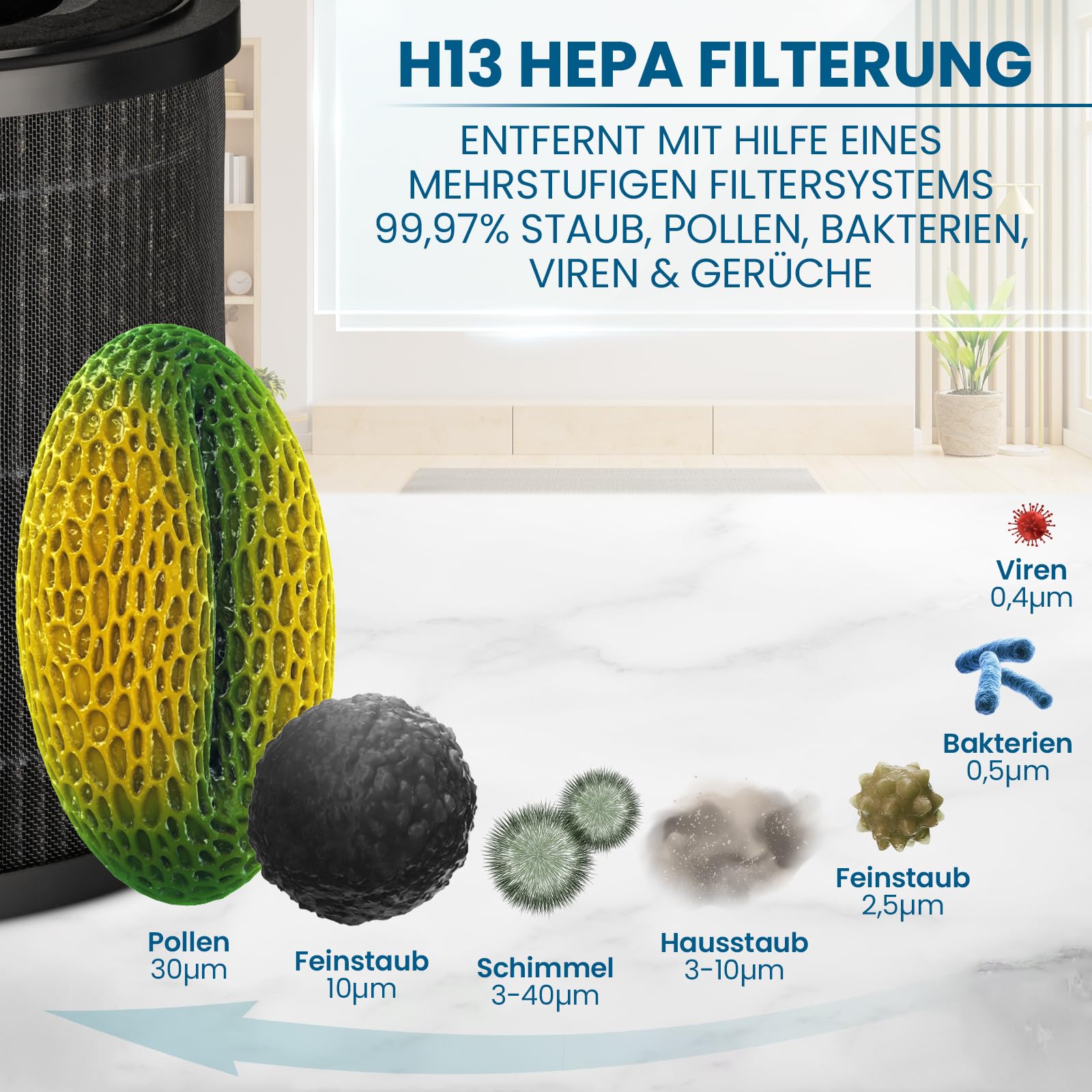 EXTRA LEISE und gleich mit Premium Carbon+ AKTIVKOHLEFILTER gegen Gerüche: Mit dem Grundig Luftreiniger lehnen Sie sich bequem zurück und lassen das Gerät einfach alles machen. Das One-Touch Automatikprogramm misst die Partikelbelastung mittels Laser und steuert die Lüftergeschwindigkeit selbsttätig. Dabei wird die Luftbelastung zur Ihrer Information auf dem grossen Display ganz einfach angezeigt. Mit Apps, Updates, Wifi und Bluetooth Inkompatibilitäten müssen Sie sich nicht beschäftigen. Der Lieferumfang und Ihre Vorteile:1x Unser Original Grundig Luftreiniger mit 190 Kubikmeter Luftdurchsatz /h1x Grundig H13 Hepa Premium Filter mit Aktivkohle Stufe Carbon+ gegen Gerüche, Rauch und AbgaseKompakte Grösse und schlankes Design ca. 22 x 20 x 31,6 cmLeiser 24 dB Luftreiniger mit LED und DISPLAY Abschaltung im Sleep ModusHepa Filter bindet Sporen, Allergene, Tierhaare, Bakterien, Viren, Pollen und RauchpartikelVorfilter gegen Staub, Fusseln, Fasern, Haaren und Tierfell4 Lüfterstufen: Schlafen, niedrig, mittel, hochGeeignet für Räume bis zu 49 m2 nach NRCC-54013 Standard mit Zigaretten-Rauch (auch grössere Räume)CAD Test nach GB/T18801-2015 (bei angenommener Raumgrösse 20m2 mit 2,4 Meter Raumhöhe)besonders energiesparend mit nur 21 Watt bzw. weniger als 2 Watt im Standby BetriebTimerfunktion 1-24 StundenKindersicherungFiltertauschanzeige (Tausch je nach Partikel Belastung zwischen 3 - 6 Monate)Sie möchten die Bedienung ihrer neuen Luft Reiniger besonders einfach halten und die Vorteile eines integrierten Aktivkohle Filters ohne Aufpreis nutzen? Dann bitte einfach oben rechts auf "Jetzt kaufen" klicken.