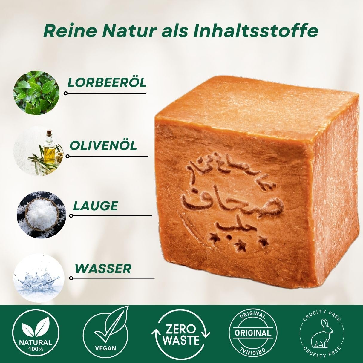 Dank der reinen, handgefertigten Rezeptur kommt die Aleppo Seife ohne synthetische Duftstoffe, Konservierungsmittel oder Farbstoffe aus. Sie ist vielseitig einsetzbar – fuer Haende, Gesicht, Koerper und Haare – und eine bewusste Wahl fuer naturnahe Koerperpflege.