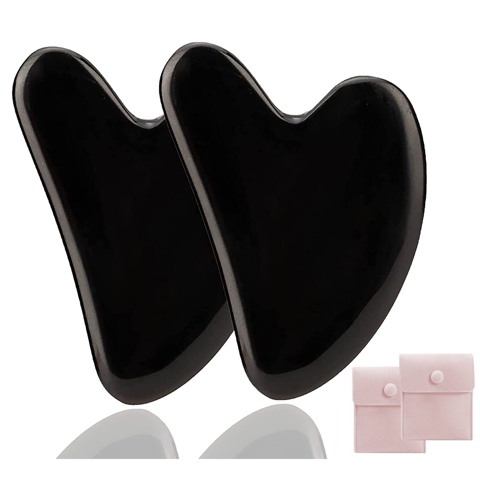 Jade Gua Sha Steine Herzform 2er-Set Schwarz – Naturstein Massage-Tool fuer Gesicht, Augen und Hals, mit Tasche