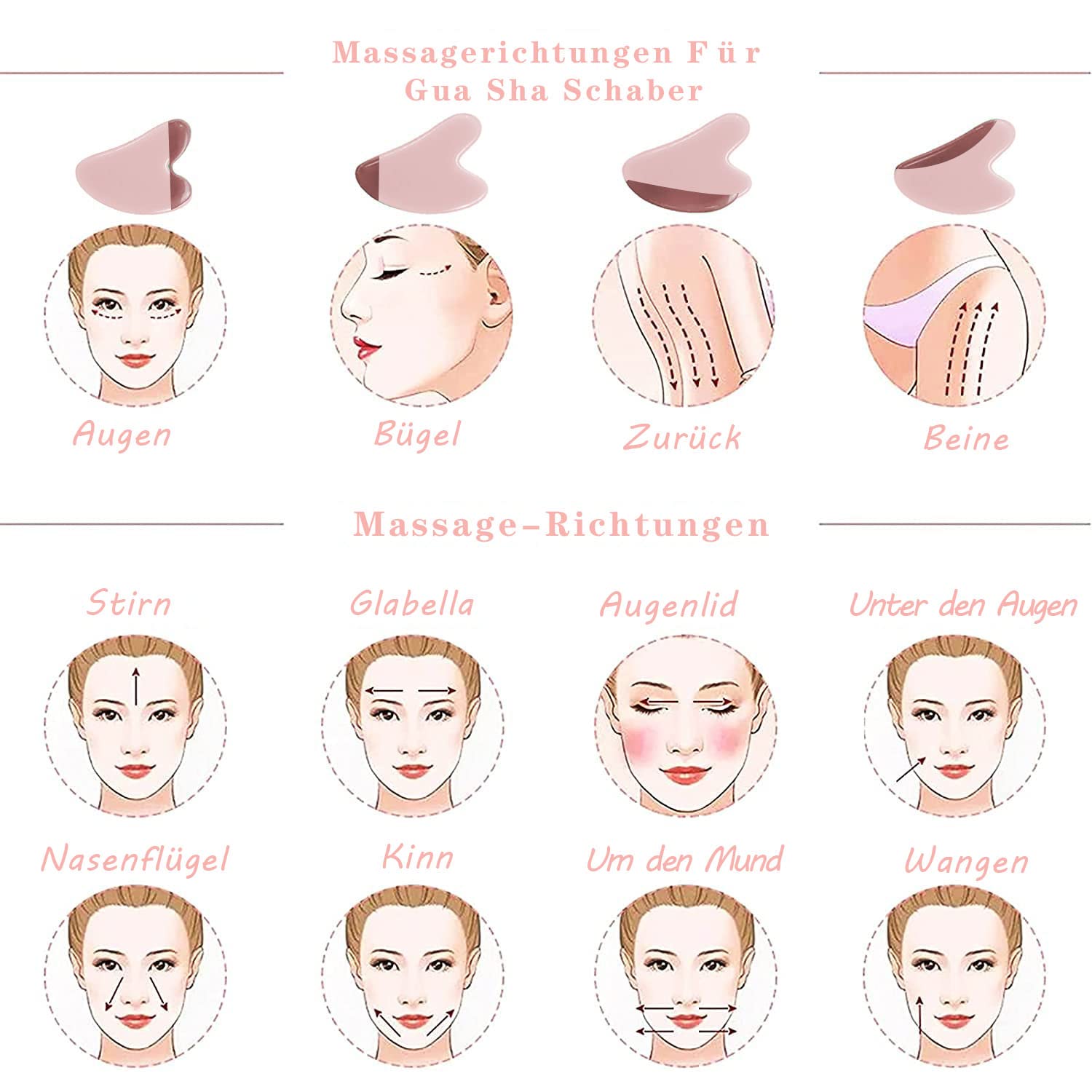 Die Herzform ist nicht nur optisch, sondern funktional. Du bekommst mehrere Kanten und Rundungen, mit denen du unterschiedliche Gesichtszonen sauber bearbeiten kannst: breite Seiten fuer Stirn, Wangen und Hals, schmalere Bereiche fuer praezise Zuege entlang der Kieferlinie, Nase und besonders fuer die empfindliche Augenpartie. Damit eignet sich der Gua Sha sowohl fuer klassische Gua-Sha-Routinen als auch fuer kurze Anwendungen zwischendurch.