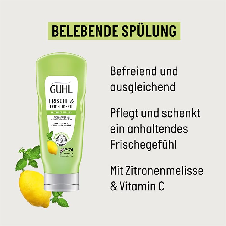 Guhl Frische & Leichtigkeit - Anti-Fett Shampoo Bei schnell fettendem Haaransatz und geschädigten Spitzen ist das Shampoo von Guhl die perfekte Wahl! Denn das Shampoo reinigt effektiv Haar und Kopfhaut und befreit diese von überschüssigem Fett, ohne dabei den Ansatz und die Spitzen auszutrocknen. Zugleich hilft es schnelles Nachfetten zu verzögern und spendet intensiv Feuchtigkeit. Dank der durchdachten, veganen Formel mit Zitronenmelisse und Vitamin C verleiht das Shampoo ein anhaltendes Frischegefühl voller Leichtigkeit. Das Haarshampoo ist bestens für normales bis schnell fettendes Haar geeignet. Jetzt noch umweltfreundlicher Dermatologisch bestätigt Ohne Silikone Vegane Formulierung ohne Inhaltsstoffe tierischen Ursprungs Inhaltsstoffe zu 92% natürlichen Ursprungs und zu 99% biologisch abbaubar Flaschenkörper zu 99% aus recyceltem Material Hergestellt in Deutschland Anwendung Eine kleine Menge Frische & Leichtigkeit Shampoo sanft ins nasse Haar einmassieren und anschliessend gut ausspülen. Für optimale Ergebnisse empfehlen wir zusätzlich die Frische & Leichtigkeit Spülung zu verwenden.