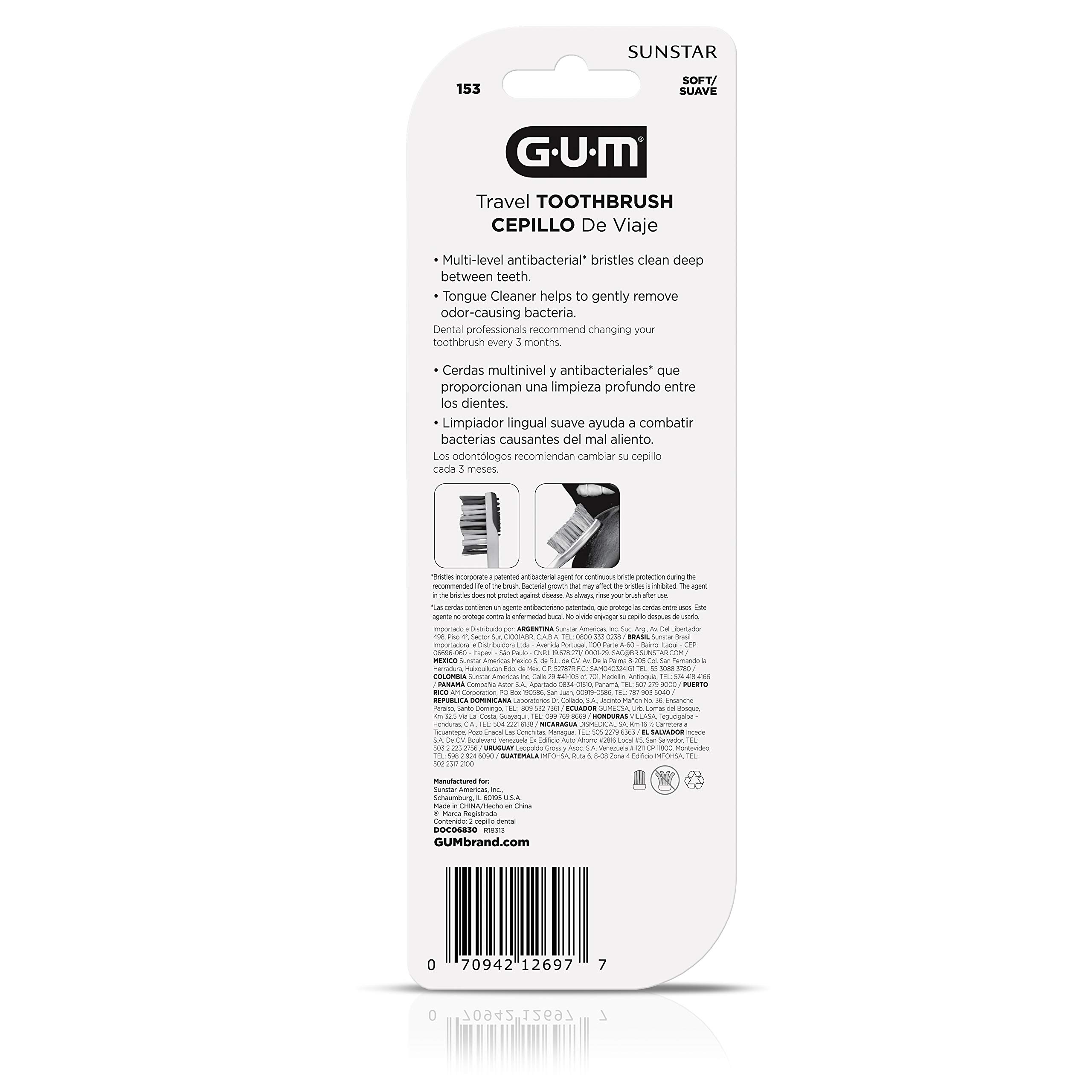 GUM Reise-Zahnbürste mit antibakteriellen Borsten und klappbarem Griff, weiche Borsten, 2 Stück (6 Stück)
