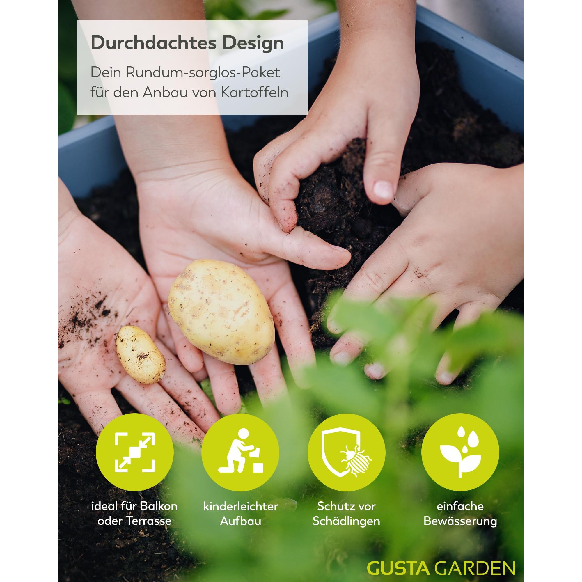 Das Pendant zum klassischen Hochbeet, jedoch speziell für den Anbau von Kartoffeln. PAUL POTATO ist ein weltweit einzigartiges Produkt und erfreut sich grosser Beliebtheit. Die einfachste Variante Kartoffeln im PAUL POTATO anzubauen ist in der Anbauvariante SIMPLE. In allen Etagen werden zeitgleich Kartoffeln angepflanzt - ganz unabhängig davon, ob du eine oder mehrere unterschiedliche Kartoffelsorten anpflanzen willst. Die Ernte erfolgt entweder etagenweise oder auf einmal. Mit einem Volumen von 14 Liter pro Ebene hast du pro Ebene die Möglichkeit an jeder Ecke eine Pflanze anzusähen - anschliessend die Ebenen einfach übereinenader stapeln und die Saat mit ausreichend Wasser und Dünger versorgen. Die Kartoffeln sind erntereif, sobald die Pflanze braun wird. Paul Potato eignet sich auch hervorragend für die Aufzucht anderer Pflanzen angefangen bei anderem Gemüse wie Karotten, Chili oder Paprika bis hin zu Kräutern. Durch die platzsparende Stapelung der Eben findest du sicherlich Platz in deinem Zuhause und erntest zukünftig dein eigenes Gemüse. Paul Potato ist in zwei verschiedenen Varianten erhältlich: 3 Lagen im Set oder 4 Lagen im Set. Bitte beachten Sie, das im Lieferumfang keine Erde und kein Saatgut enthalten ist