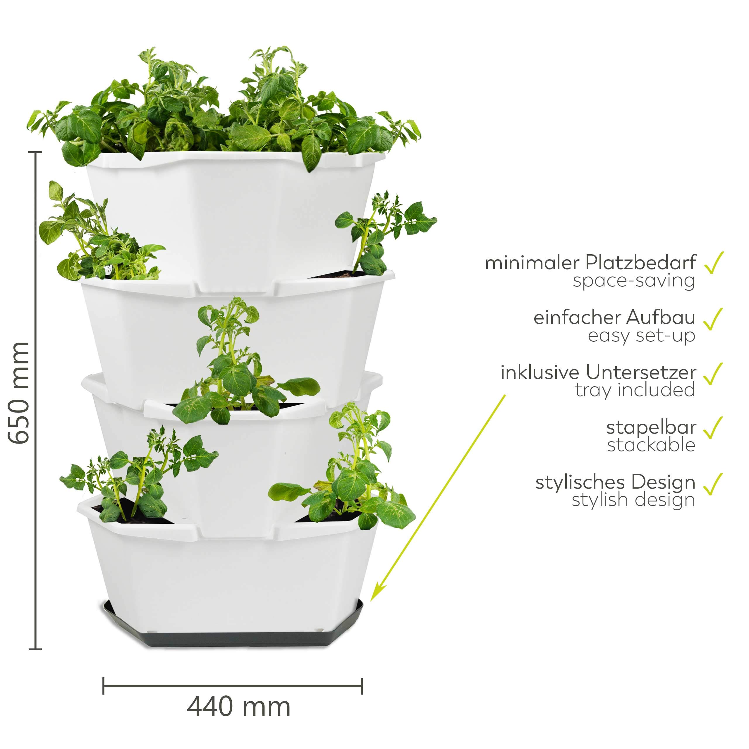 GUSTA GARDEN Paul Potato Starter Kartoffelturm - stapelbar - Hochbeet/Pflanzgefäss/Blumentopf für Balkon, Garten und Terrasse (4 Etagen, Weiss) inkl. Untersetzer