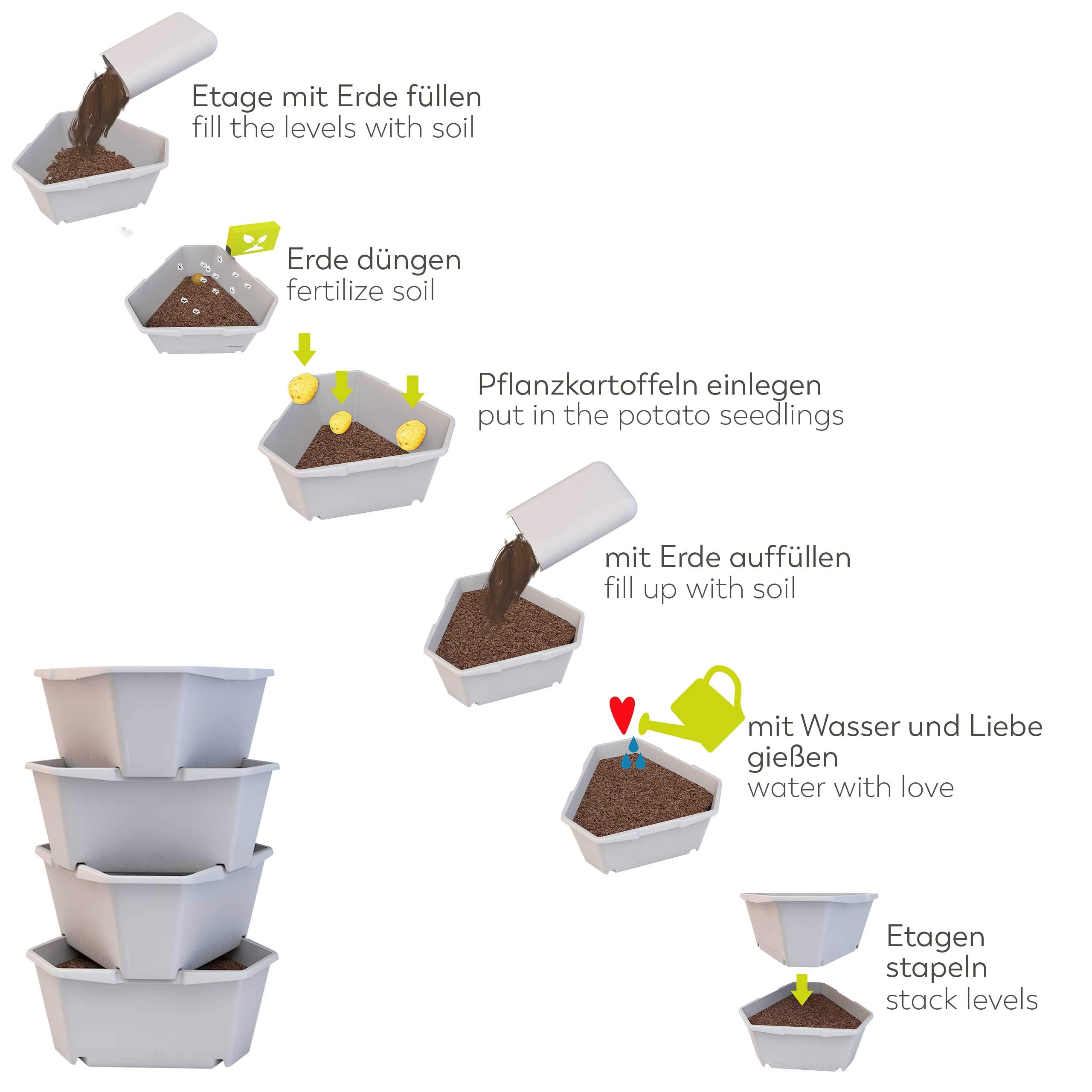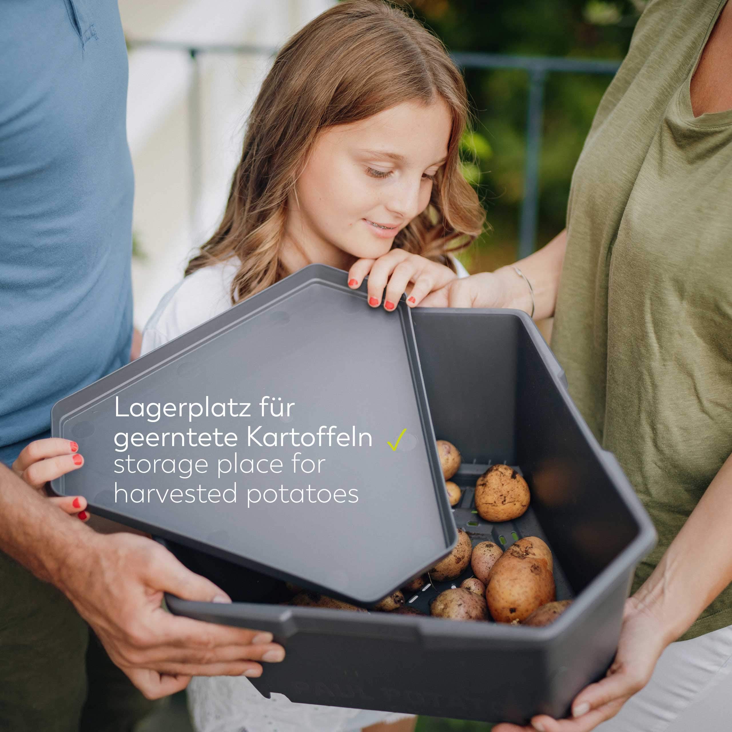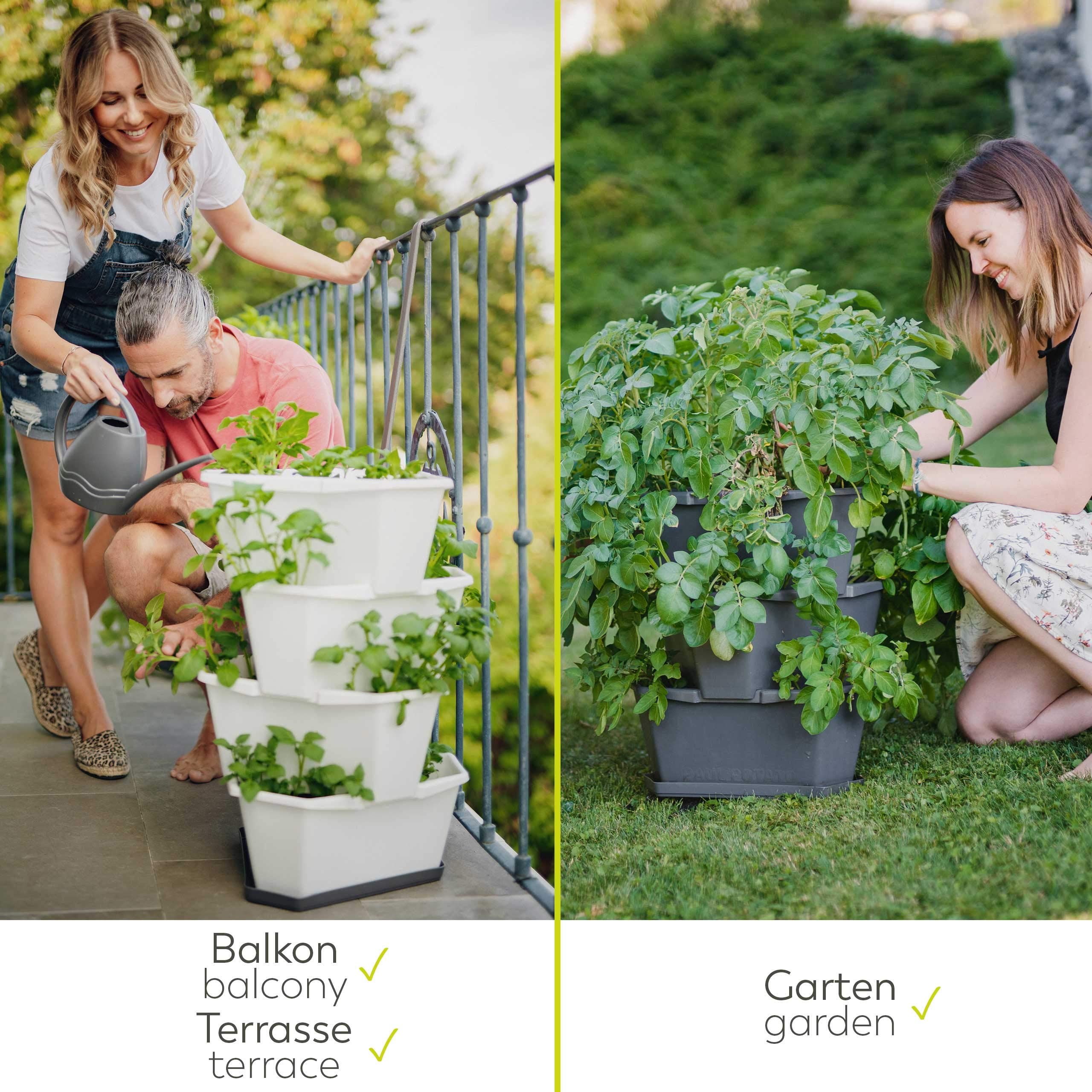 Das Pendant zum klassischen Hochbeet, jedoch speziell für den Anbau von Kartoffeln. PAUL POTATO ist ein weltweit einzigartiges Produkt und erfreut sich grosser Beliebtheit. Die einfachste Variante Kartoffeln im PAUL POTATO anzubauen ist in der Anbauvariante SIMPLE. In allen Etagen werden zeitgleich Kartoffeln angepflanzt - ganz unabhängig davon, ob du eine oder mehrere unterschiedliche Kartoffelsorten anpflanzen willst. Die Ernte erfolgt entweder etagenweise oder auf einmal. Mit einem Volumen von 14 Liter pro Ebene hast du pro Ebene die Möglichkeit an jeder Ecke eine Pflanze anzusähen - anschliessend die Ebenen einfach übereinenader stapeln und die Saat mit ausreichend Wasser und Dünger versorgen. Die Kartoffeln sind erntereif, sobald die Pflanze braun wird. Paul Potato eignet sich auch hervorragend für die Aufzucht anderer Pflanzen angefangen bei anderem Gemüse wie Karotten, Chili oder Paprika bis hin zu Kräutern. Durch die platzsparende Stapelung der Eben findest du sicherlich Platz in deinem Zuhause und erntest zukünftig dein eigenes Gemüse. Paul Potato ist in zwei verschiedenen Varianten erhältlich: 3 Lagen im Set oder 4 Lagen im Set. Bitte beachten Sie, das im Lieferumfang keine Erde und kein Saatgut enthalten ist