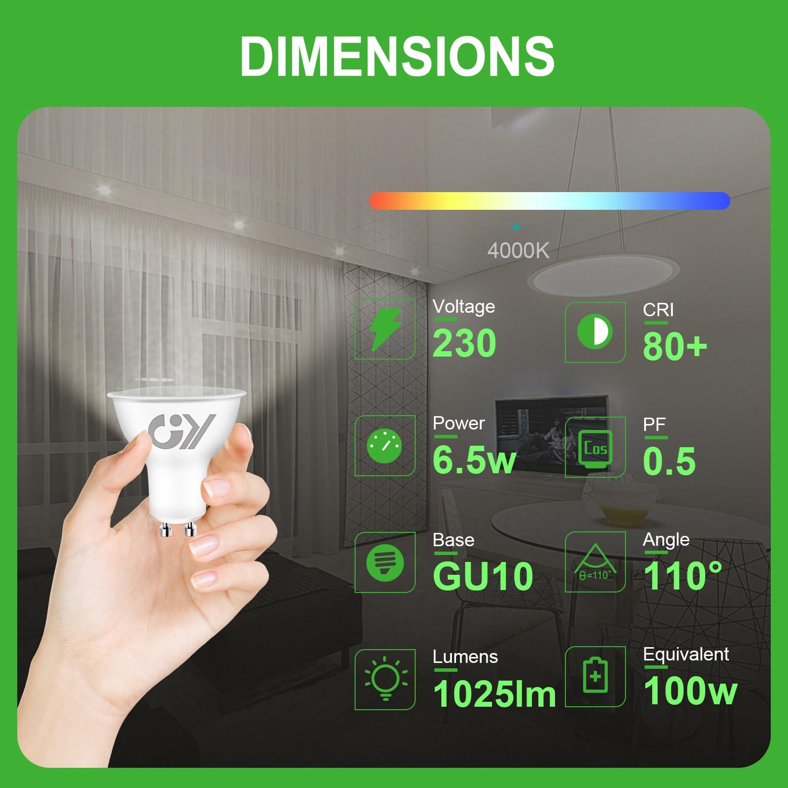 1025 lm, 4000 K, LED-Leuchtmittel GU10, neutralweiss, energiesparend und langlebig, extrem lange Lebensdauer, energiesparend, nicht dimmbar, GU10 LED, nicht dimmbar, neutralweiss, 4000 K, LED-Leuchtmittel GU10, neutralweiss, GY LED-Lampe ist eine hervorragende energiegeladene Lösung für die Beleuchtung Ihres Hauses oder Ihres Arbeitsbereichs. Diese 6,5 W GU10 LED-Lampe bietet eine Helligkeit wie eine herkömmliche 60 W Glühbirne, mit einem Lichtstrom von 1025 Lumen. Sie ist in drei Farbtemperaturen erhältlich: 3000 K, 4000 K und 6500 K, sodass Sie die Lichtstimmung wählen können, die am besten zu Ihren Bedürfnissen passt. Dank des fortschrittlichen Designs beträgt der Lichtwinkel der GY LED GU10 Leuchtmittel 110 Grad, was eine gleichmässige Lichtverteilung im Raum gewährleistet. Darüber hinaus ist diese GU10 LED-Lampe nicht dimmbar, was bedeutet, dass sie nicht mit einem Dimmer verwendet werden kann. Zertifiziert nach der neuen europäischen Norm der Klasse B für Energieeffizienz, die GY GU10 LED-Lampe 6,5 W 1025 lm bietet eine höhere Helligkeit bei geringerem Stromverbrauch. Im Gegensatz zu einer normalen GU10 LED-Lampe mit 6 W in der Klasse E, die nur 600 lm produziert, erreicht die GY GU10 6,5 W Glühbirne 1025 lm, entspricht der Helligkeit einer normalen Glühbirne der Klasse E mit 10 W. So können Sie Energie sparen und gleichzeitig eine stärkere Beleuchtung geniessen. Die Wahl der GY GU10 LED Leuchtmittel ist eine nachhaltige, wirtschaftliche und umweltfreundliche Beleuchtungslösung. Lassen Sie diese Gelegenheit nicht entgehen, Ihren Raum mit einer effizienten und hochwertigen LED-Lampe zu beleuchten. 5 nicht dimmbare LED-Lampen mit 6,5 W pro Leuchtmittel
