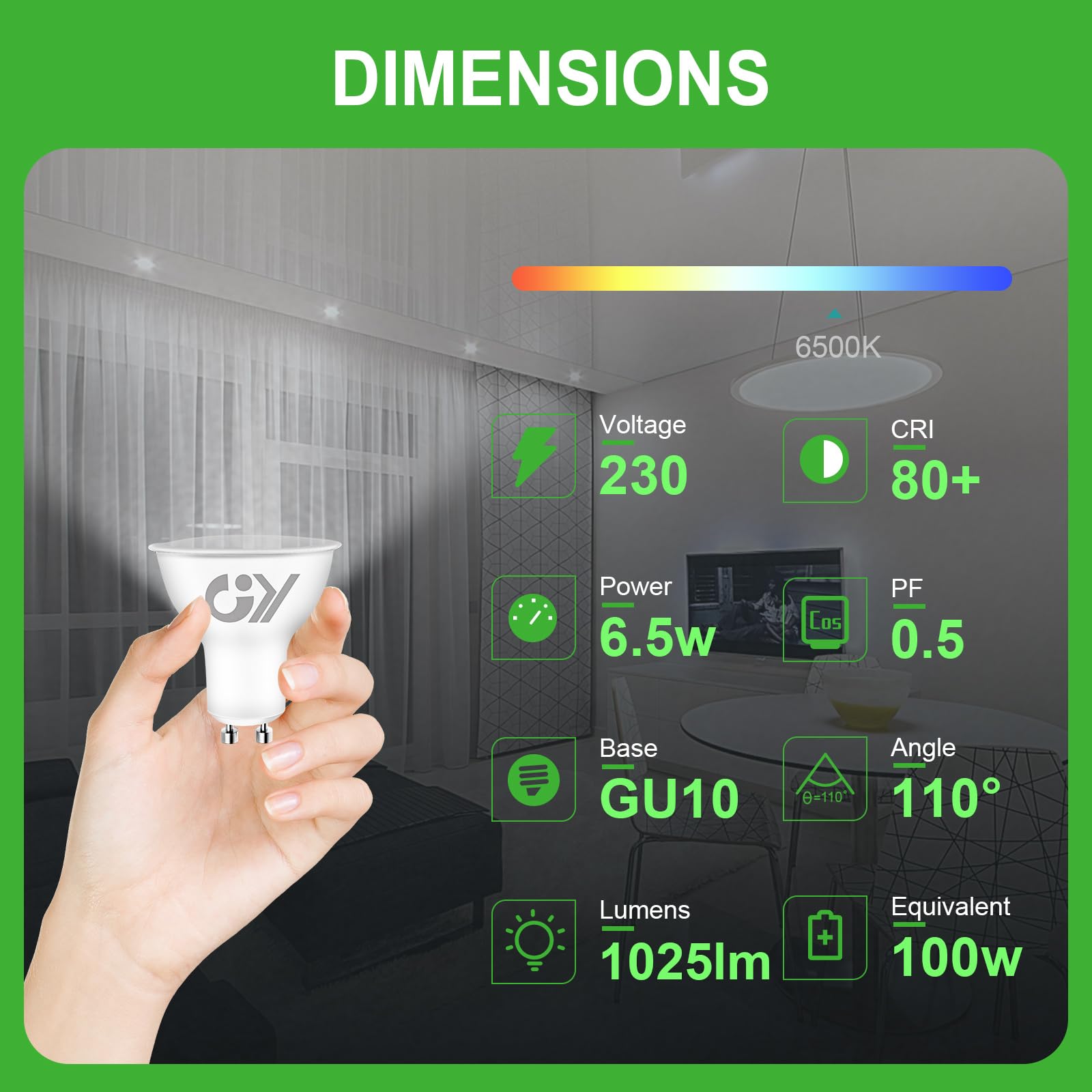 1025 lm, 6500 K, LED-Leuchtmittel GU10, kaltweiss, energiesparend und langlebig, extrem lange Lebensdauer, energiesparend, nicht dimmbar, GU10 LED, nicht dimmbar, Kaltweiss, 6500 K, LED-Leuchtmittel GU10, Kaltweiss, GY LED-Lampe ist eine hervorragende energieeffiziente Lösung für die Beleuchtung Ihres Hauses oder Ihres Arbeitsbereichs. Diese 6,5 W GU10 LED-Lampe bietet eine Helligkeit wie eine herkömmliche 60 W Glühbirne, mit einem Lichtstrom von 1025 Lumen. Sie ist in drei Farbtemperaturen erhältlich: 3000 K, 4000 K und 6500 K, sodass Sie die Lichtstimmung wählen können, die am besten zu Ihren Bedürfnissen passt. Dank des fortschrittlichen Designs beträgt der Lichtwinkel der GY LED GU10 Leuchtmittel 110 Grad, was eine gleichmässige Lichtverteilung im Raum gewährleistet. Darüber hinaus ist diese GU10 LED-Lampe nicht dimmbar, was bedeutet, dass sie nicht mit einem Dimmer verwendet werden kann. Zertifiziert nach der neuen europäischen Norm der Klasse B für Energieeffizienz, die GY GU10 LED-Lampe 6,5 W 1025 lm bietet eine höhere Helligkeit bei geringerem Stromverbrauch. Im Gegensatz zu einer normalen GU10 LED-Lampe mit 6 W in der Klasse E, die nur 600 lm produziert, erreicht die GY GU10 6,5 W Glühbirne 1025 lm, entspricht der Helligkeit einer normalen Glühbirne der Klasse E mit 10 W. So können Sie Energie sparen und gleichzeitig eine stärkere Beleuchtung geniessen. Die Wahl der GY GU10 LED Leuchtmittel ist eine nachhaltige, wirtschaftliche und umweltfreundliche Beleuchtungslösung. Lassen Sie diese Gelegenheit nicht entgehen, Ihren Raum mit einer effizienten und hochwertigen LED-Lampe zu beleuchten. 5 nicht dimmbare LED-Lampen mit 6,5 W pro Leuchtmittel