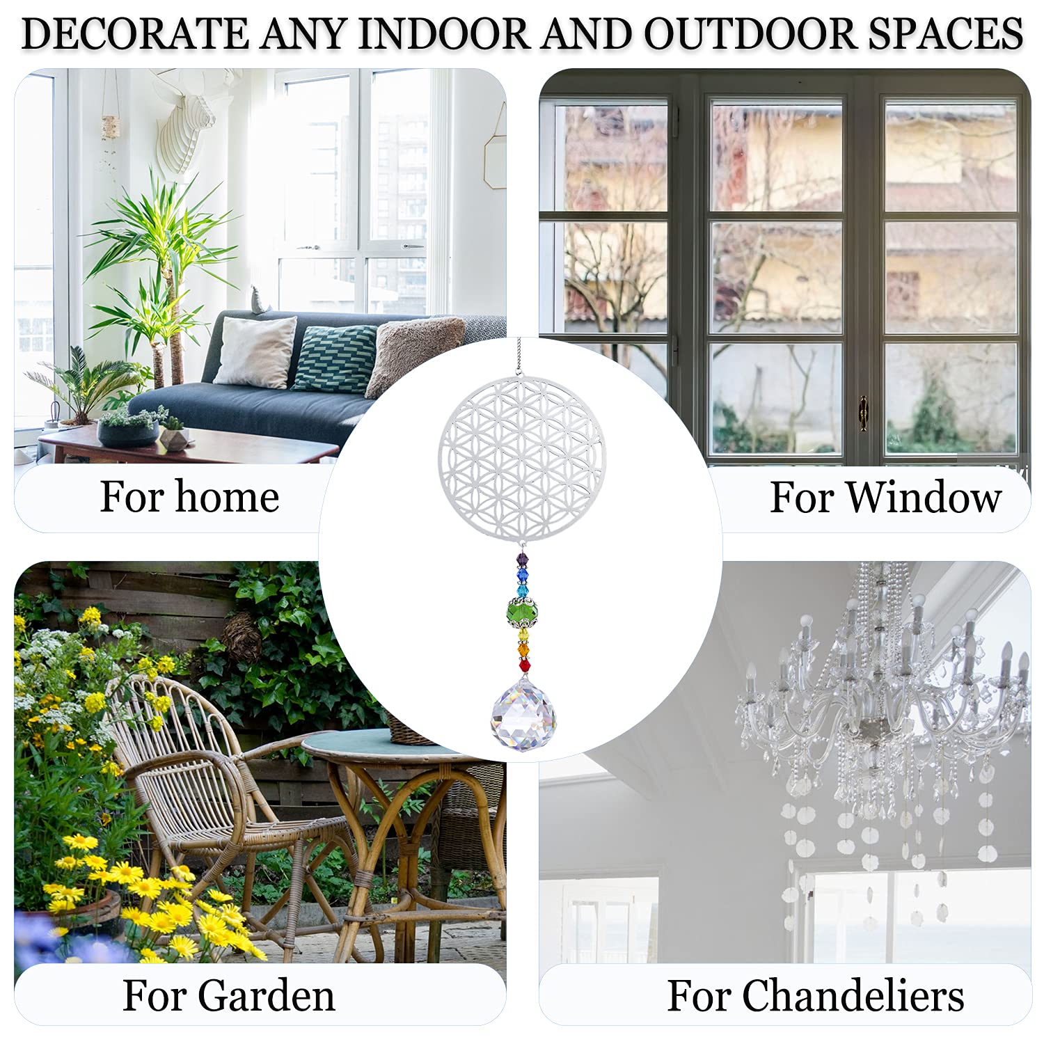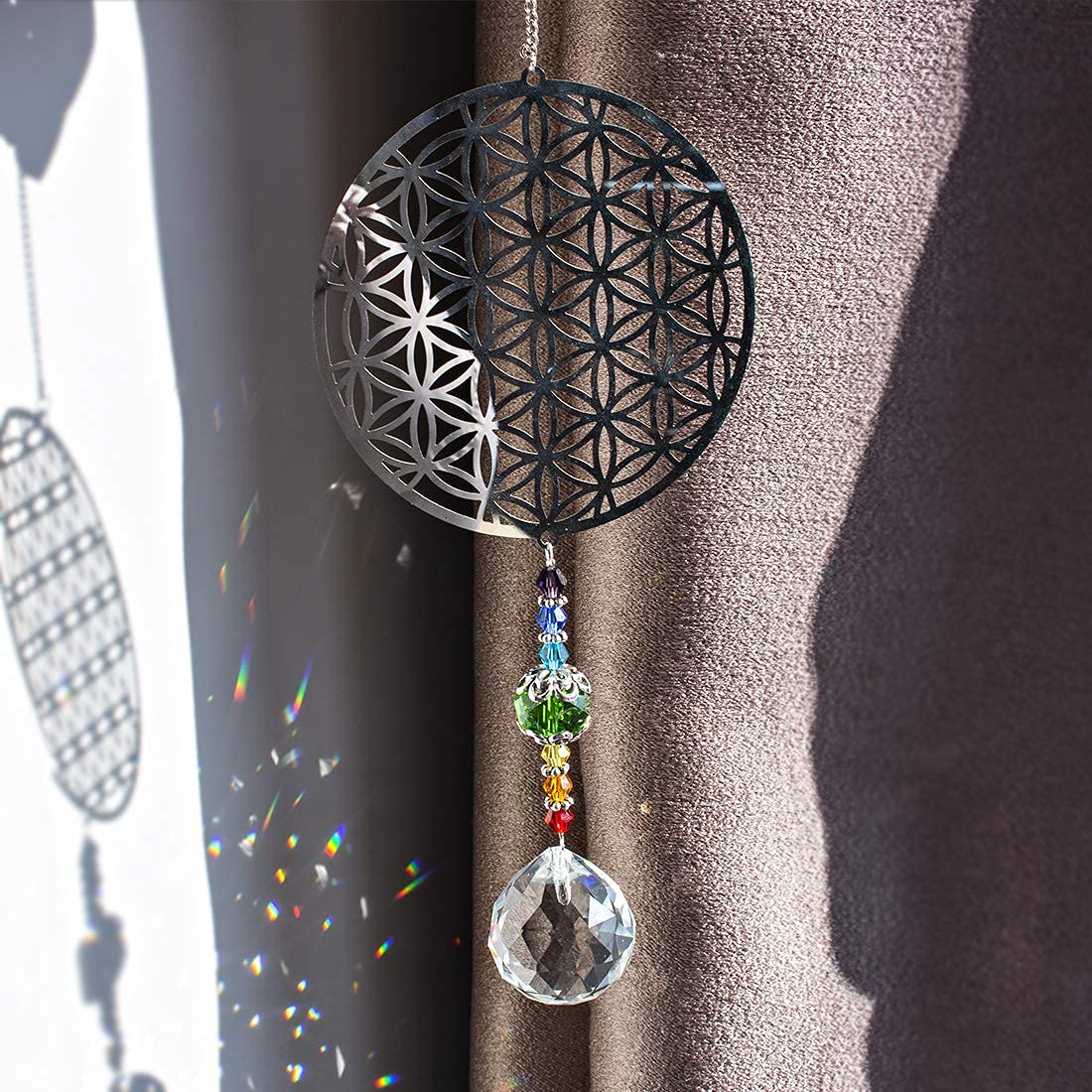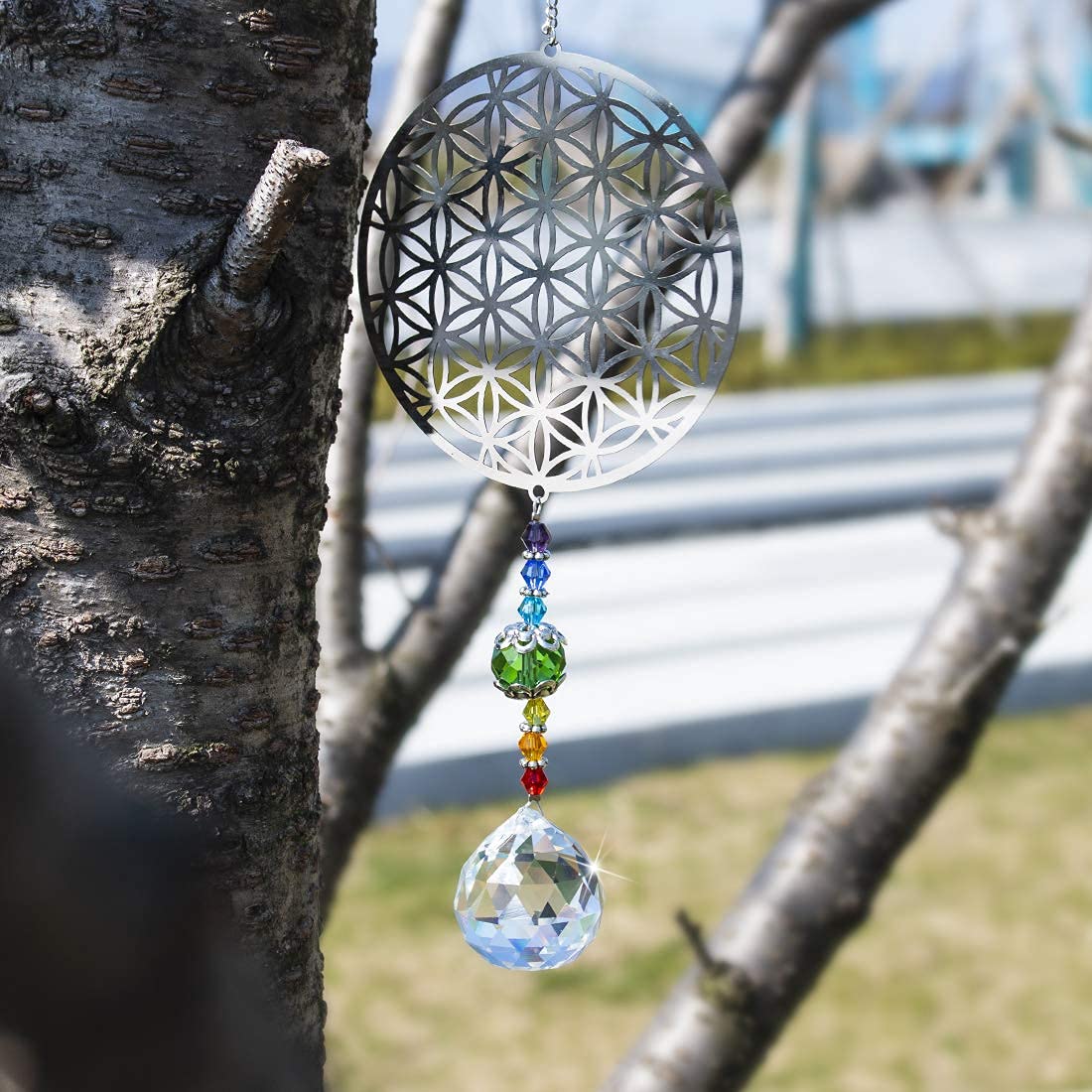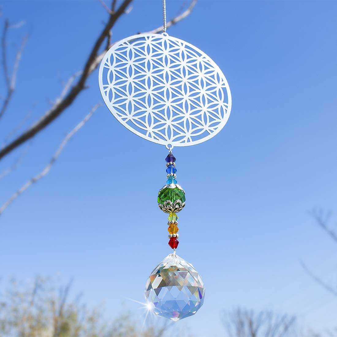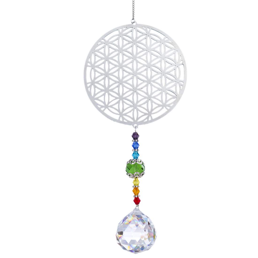 H&D Kristall Regenbogen Sonnenfänger Metall Blume des Lebens Anhänger Glas Chakra Kugelprisma
