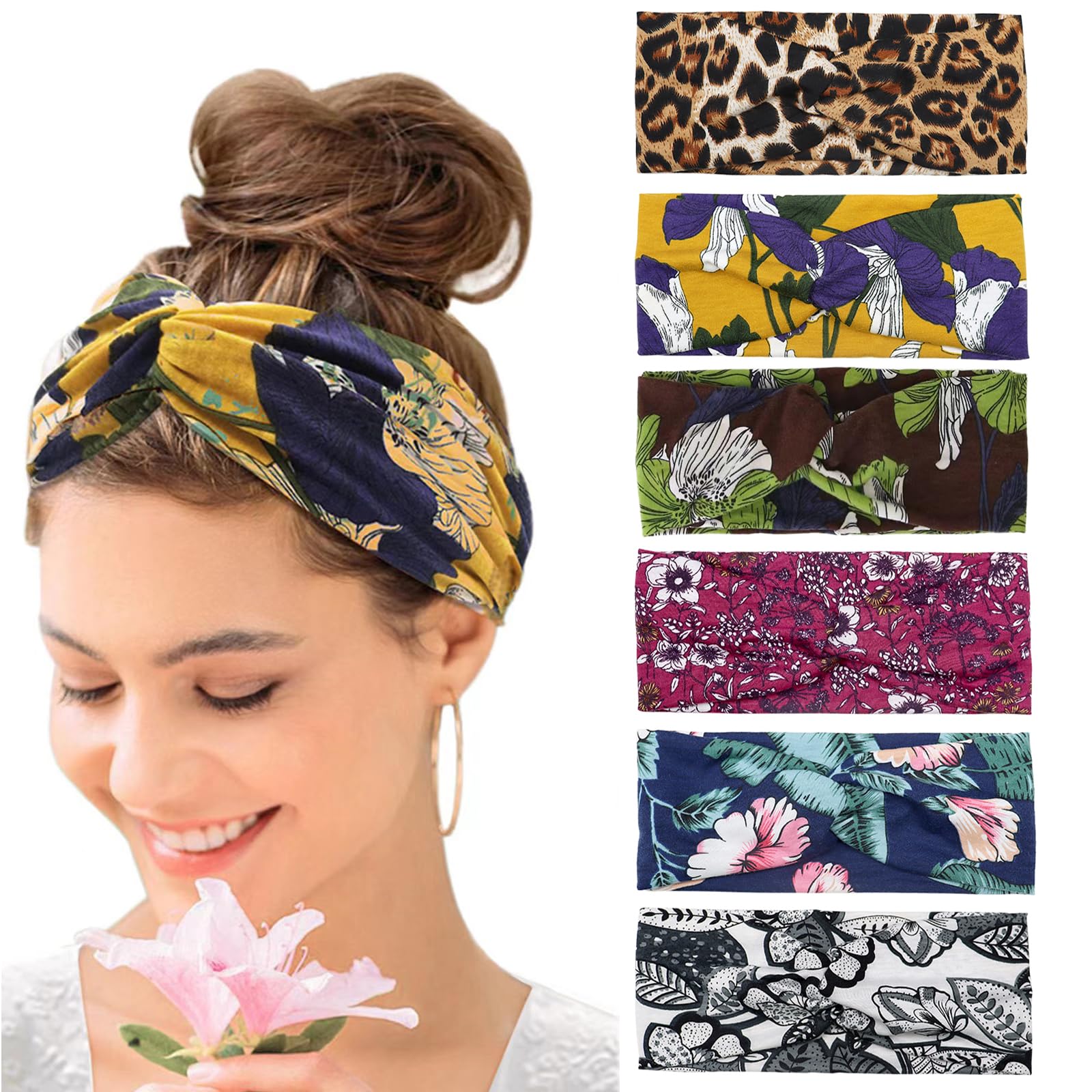 Haarbänder Damen Breite Elastische Weiche 6 Pcs Sommer Boho Stirnband Print Haarschmuck Yoga Sport Haarband Mehrfarbig Dünn Stirnbänder