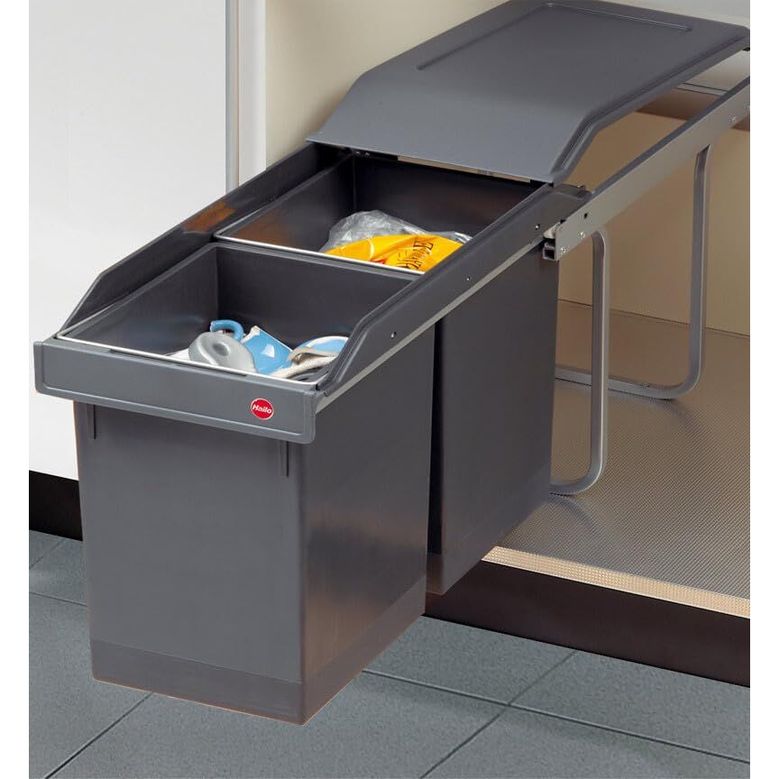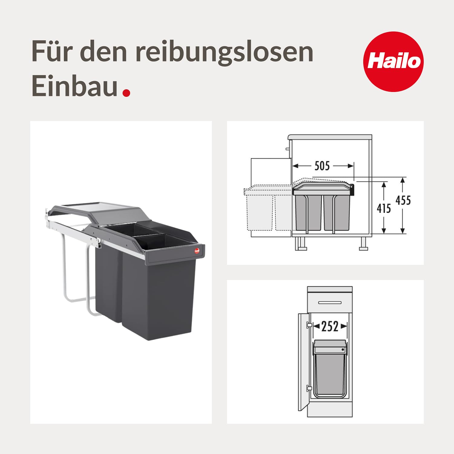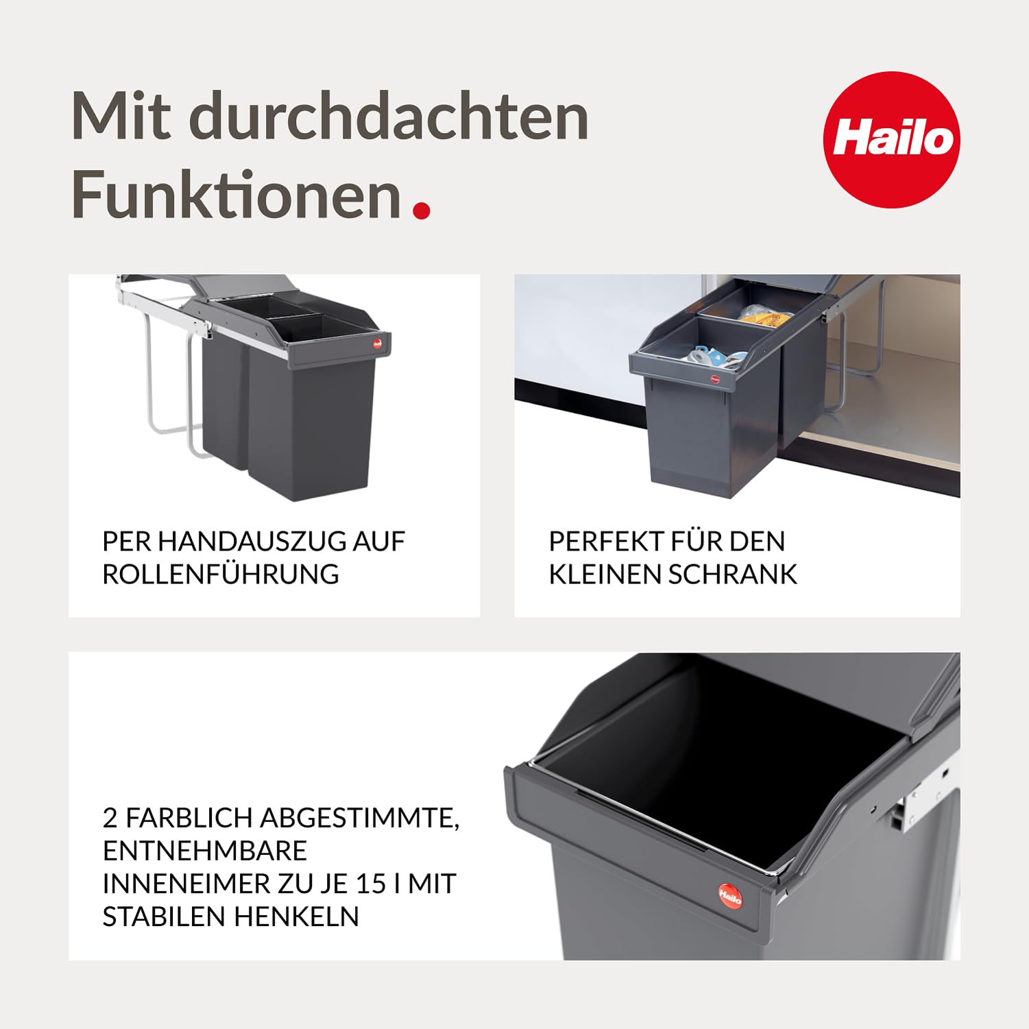 Hailo AS Tandem 15/15 in dunkelgrau - Qualität made in Germany. Der Hailo Tandem 15/15 Einbaumülleimer bietet eine effiziente Mülltrennungslösung für Ihre Küche. Mit einem Gesamtvolumen von 30 Litern, verteilt auf zwei herausnehmbare 15-Liter-Eimer, passt er in Küchenschränke mit Drehtüren und einer Breite ab 30 cm. Dank der Teilauszugsschienen lässt sich der Mülleimer mühelos ausziehen und leeren. Die robusten silberfarbenen Metallteile und dunkelgrauen Kunststoffkomponenten sorgen für Langlebigkeit und stören nicht die Ästhetik Ihrer Küche. Perfekt für alle, die Wert auf Funktionalität und Platzoptimierung legen, denn im Deckel befindet sich eine praktische Ablageschale. Die Montageschablone macht den Einbau kinderleicht und Abmessen überflüssig. Seit 1947 macht es sich Hailo zur Aufgabe, die Arbeit rund um Haus und Garten einfacher und sicherer zu machen. Hailo Einbautechnik spezialisiert sich dabei auf optimale Lösungen für die moderne Küche. Vom Einbau-Abfallsammler über Einbau-Abfalltrennsysteme bis hin zur Stauraumnutzung mit pfiffigen Ordnungssystemen. Hailo belebt den Markt regelmässig mit neuen Innovationen - und das weltweit in über 60 Ländern.
