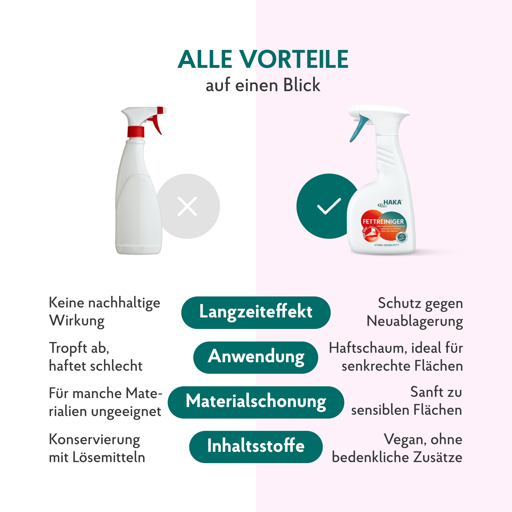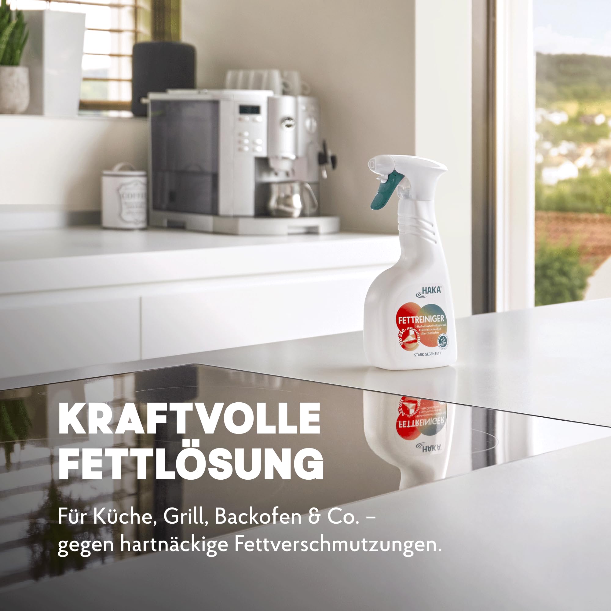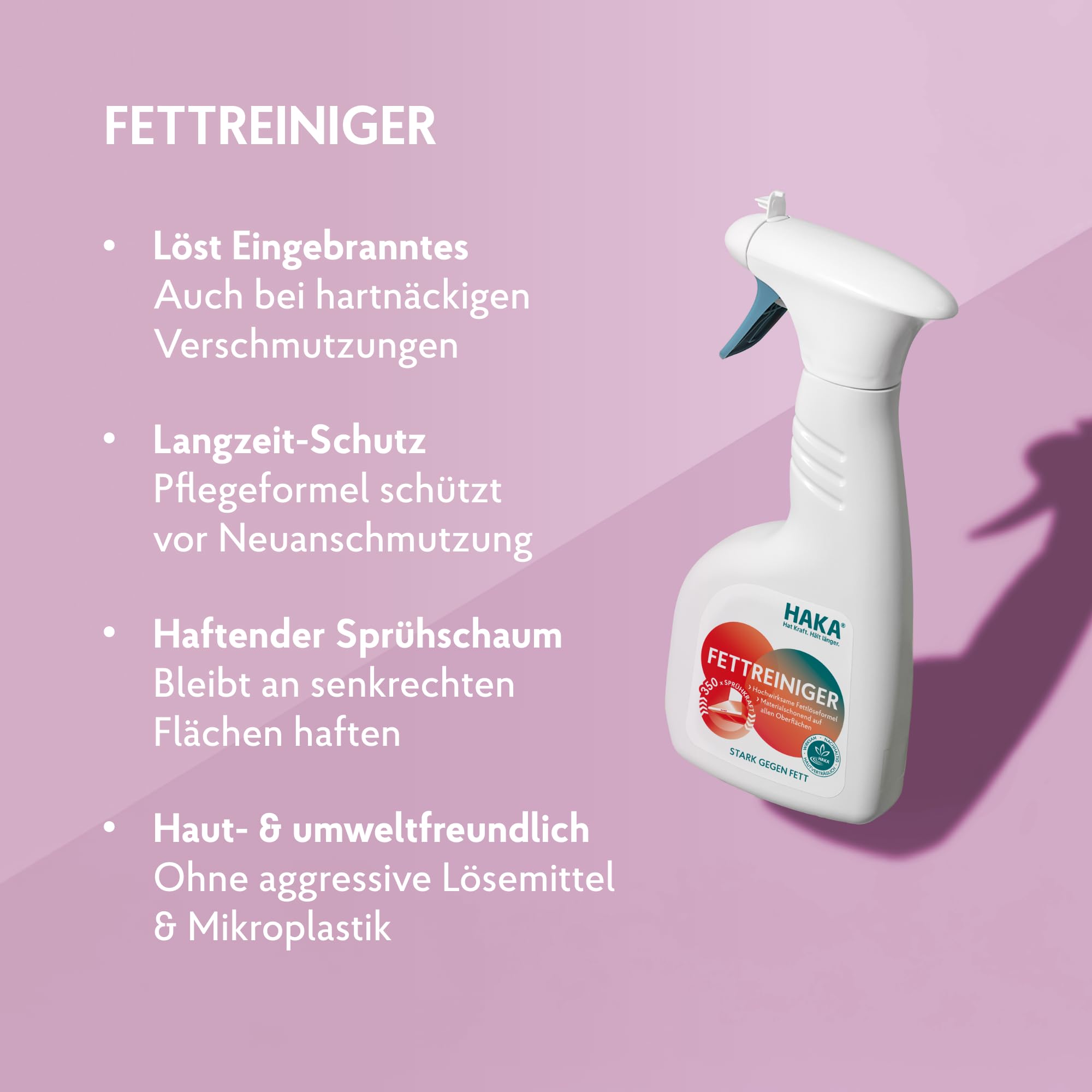 Das HAKA Fettreiniger Spray ist unser Küchen Hero: ganz einfach Schmutz und Fett auf allen Küchenoberflächen beseitigen! Der kraftvolle Aktivschaum des Küchenreinigers löst auch hartnäckige Verschmutzungen, ganz ohne Aufwand. Die besonders effektive Rezeptur des Fettlöser Sprays reinigt problemlos alle wasserfesten Oberflächen und schützt vor schneller Wiederverschmutzung. Selbst Hochglanzflächen werden mit unserem Fettreiniger Spray schonend fettfrei. Was bleibt ist strahlende Sauberkeit und hygienische Frische!Gut für dich - gut für die Umwelt: ohne bedenkliche Inhaltsstoffe und selbst für sensible Haut geeignet. Mit der cleveren Nachfüllflasche kannst du deinen Küchenreiniger gleich zwei Mal nachfüllen. Damit tust du der Umwelt und deinem Geldbeutel etwas Gutes: weniger Müll und mehr Spass beim Sparen. Vegan, ohne Mikroplastik, ohne bedenkliche Inhaltsstoffe, ohne allergieauslösende Schaumverstärker. AnwendungVerschluss des Küchenreinigers durch Drücken und Drehen öffnen. Den Schaum auf das HAKA Baumwolltuch sprühen und die zu reinigende Fläche damit abwischen. Danach abspülen und mit einem trockenen Tuch nachwischen. Bei hartnäckigen Verschmutzungen länger einwirken lassen.Hinweis: Bei empfindlichem Kunststoff und geölten, gewachsten oder offenporigen Holzoberflächen vorab das Fettreiniger Spray an einer unauffälligen Stelle testen und sofort gründlich abspülen. Ideal für Küchenoberflächen (z.B. Edelstahl, Hochglanz), Backofen & Grill, Kühlschrank & Küchengeräte, Herd & Dunstabzugshaube aber auch Autofelgen, Fahrradrahmen, u.v.m.