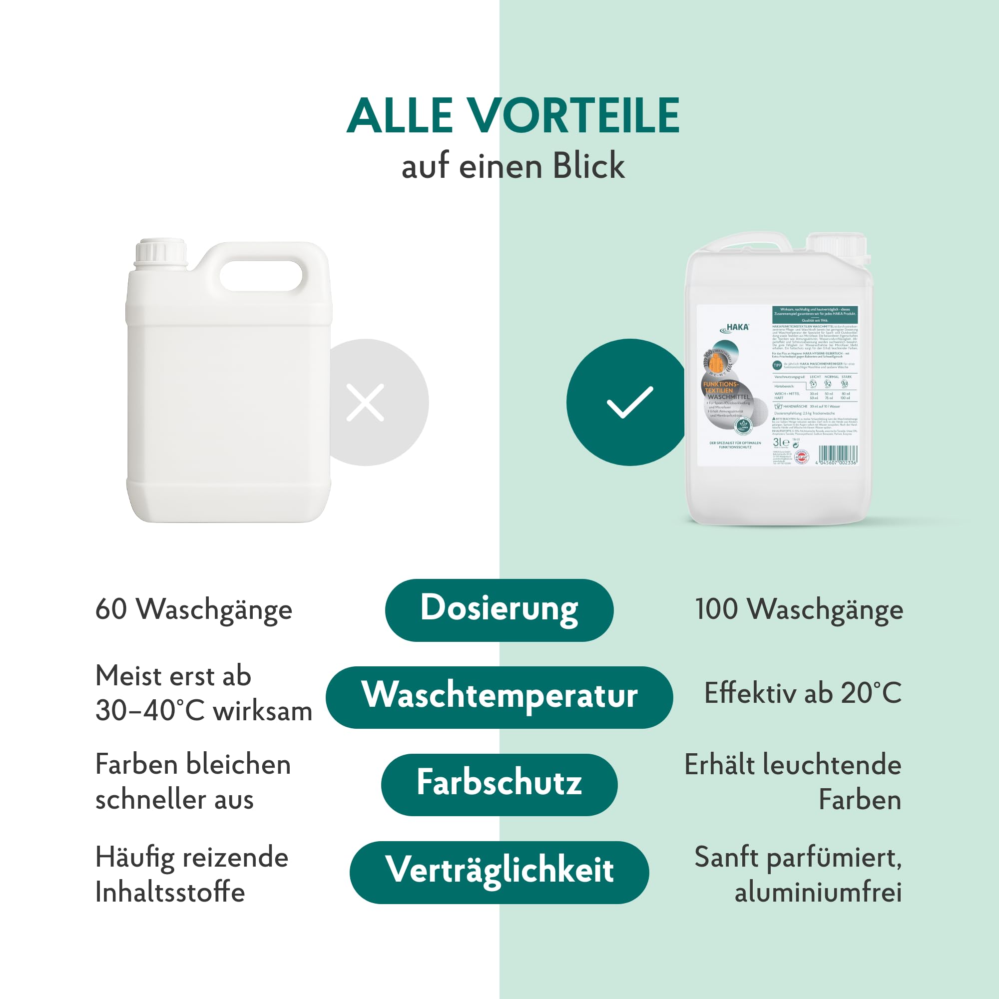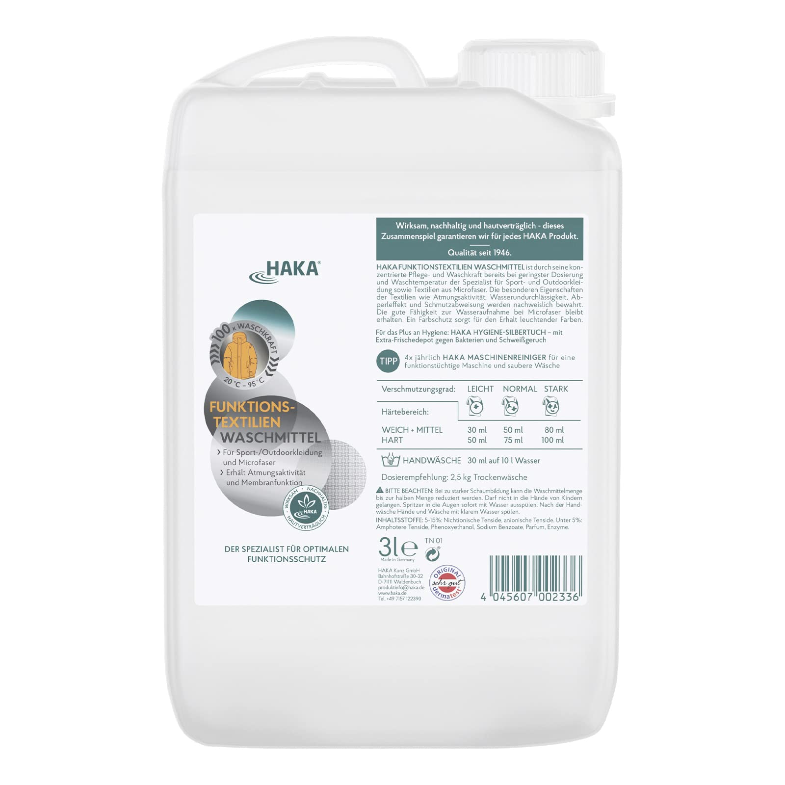 HAKA FUNKTIONSTEXTILIEN WASCHMITTELDurch seine konzentrierte Pflege- und Waschkraft bereits bei geringster Dosierung und Waschtemperatur der Spezialist für Sport- und Outdoorkleidung sowie Textilien aus Microfaser. Die besonderen Eigenschaften der Textilien wie Atmungsaktivität, Wasserundurchlässigkeit, Abperleffekt und Schmutzabweisung werden nachweislich bewahrt. Die gute Fähigkeit zur Wasseraufnahme bei Microfaser bleibt erhalten. Ein Farbschutz sorgt für den Erhalt leuchtender Farben. Für das Plus an Hygiene: HAKA HYGIENE-SILBERTUCH - mit Extra-Frischedepot gegen Bakterien und Schweissgeruch.Lieferumfang 1 x 3 l HAKA Funktionstextilien Nachfüllkanister